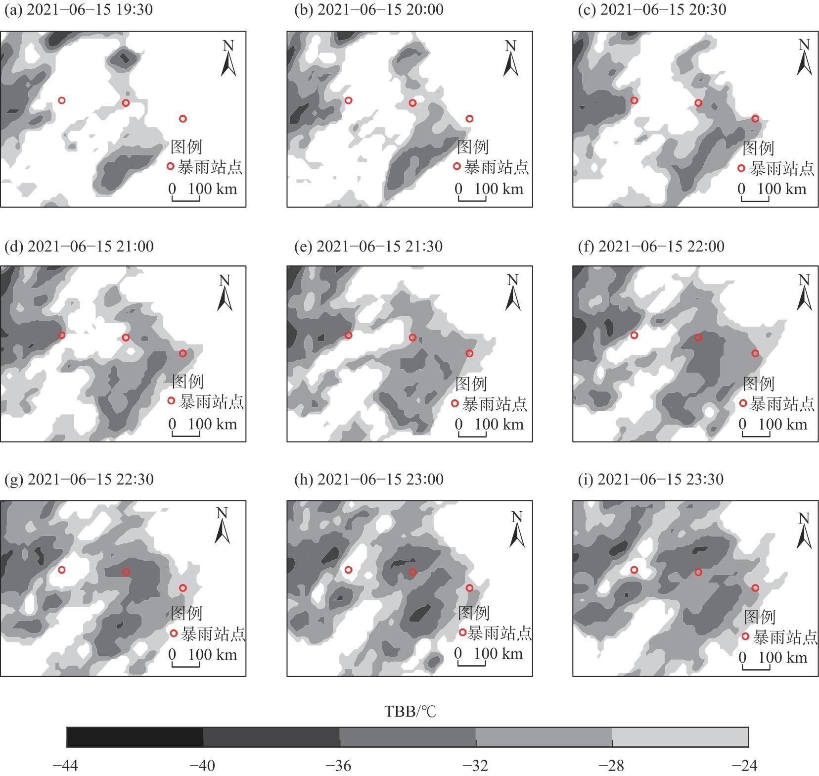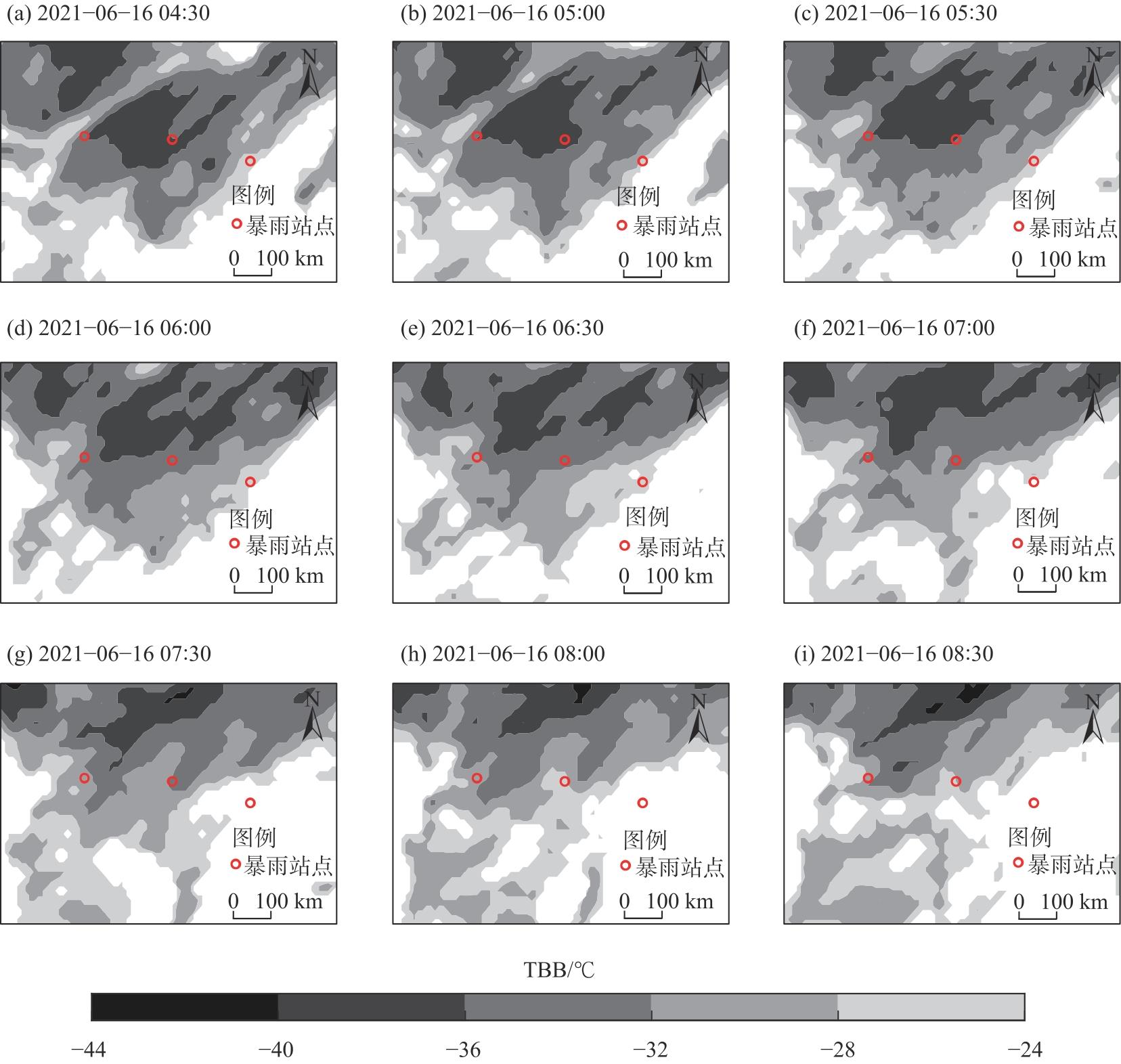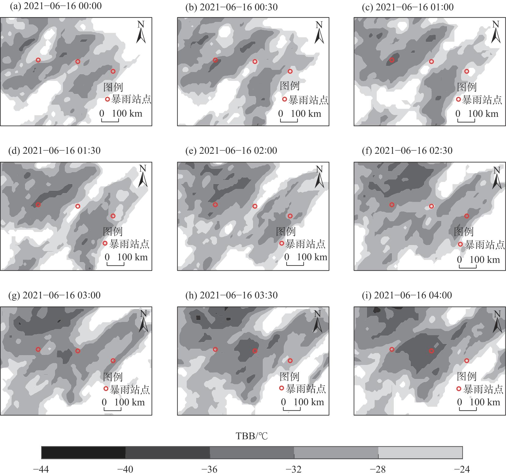 图8 2021年6月16日00:00至6月16日04:00 FY-2H卫星TBB逐30 min演变Fig. 8 Evolution of the FY-2H satellite TBB over a 30-min period from 00:00 on June 16, 2021 to 04:00 on June 16, 2021 |