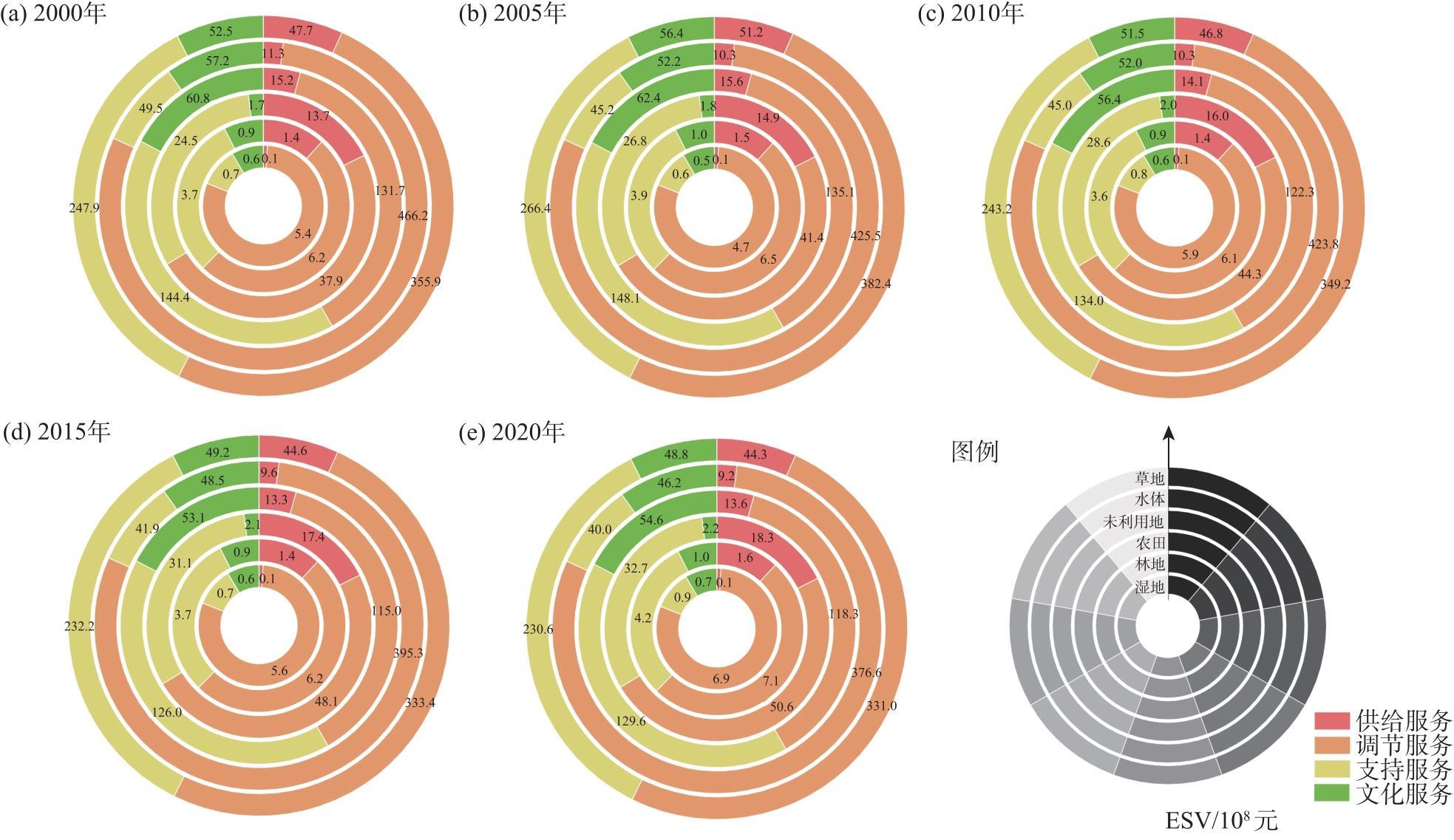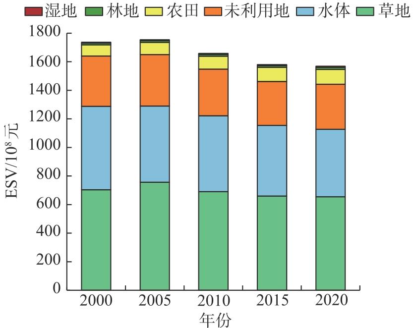 基于当量因子法估算2000—2020年南疆地区生态系统服务价值(Ecosystem services value,ESV),应用生态-经济协调度(Ecological-economic harmony,EEH)模型从县域尺度分析南疆地区生态-经济发展协调水平及其空间分布特征,最后通过生态贡献率模型揭示各县域ESV变化主要贡献因子,并结合其ESV损益状况和生态-经济协调水平进行差异化的可持续发展分区。结果表明:(1)2000—2020年南疆地区ESV整体呈先上升后下降趋势,总量缩减167.99×108元;草地和水体的ESV占总量的70%以上,单项ESV调节服务(57.1%)>支持服务(27.5%)>文化服务(10.0%)>供给服务(5.4%);草地和农田是多数ESV实现增益(减损)县域的主导地类。(2)2000—2020年南疆地区37个县域ESV均有不同程度减损,ESV实现增益县域共计9个;约80%的县域为生态-经济初始恶化区,其余县域表现为生态-经济协调稳定状态。(3)南疆地区整体呈轻度生态-经济不协调状态,少数生态-经济协调稳定县域主要分布于南疆中、东部地区。综合分析将南疆县域划分为林草生态-经济不可持续区、农田生态-经济不可持续区、水体生态-经济不可持续区、林草生态-经济持续稳定区和农田生态-经济持续稳定区5种类型。