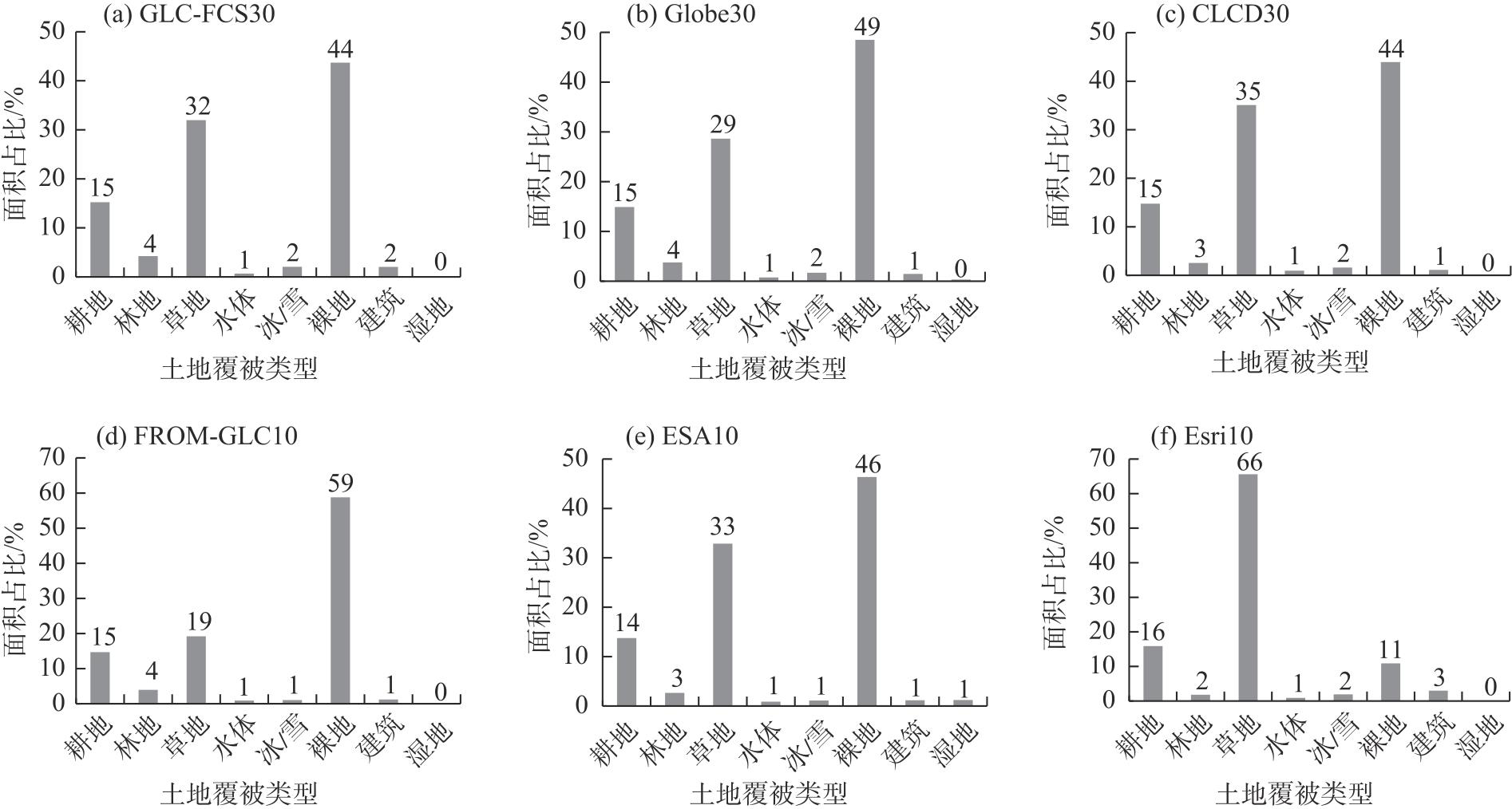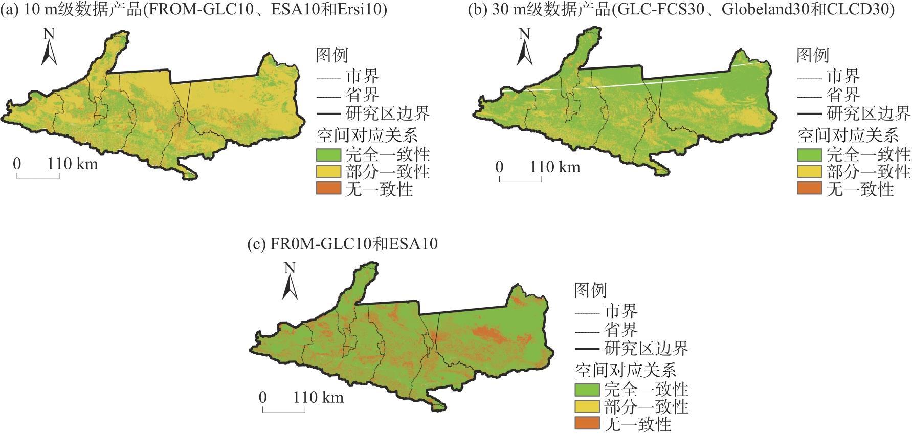 注:ESA10、Globe30、Esri10分别为ESAWorldCover2020、GlobeLand30、Esri_Land_2020的简称。下同。 |