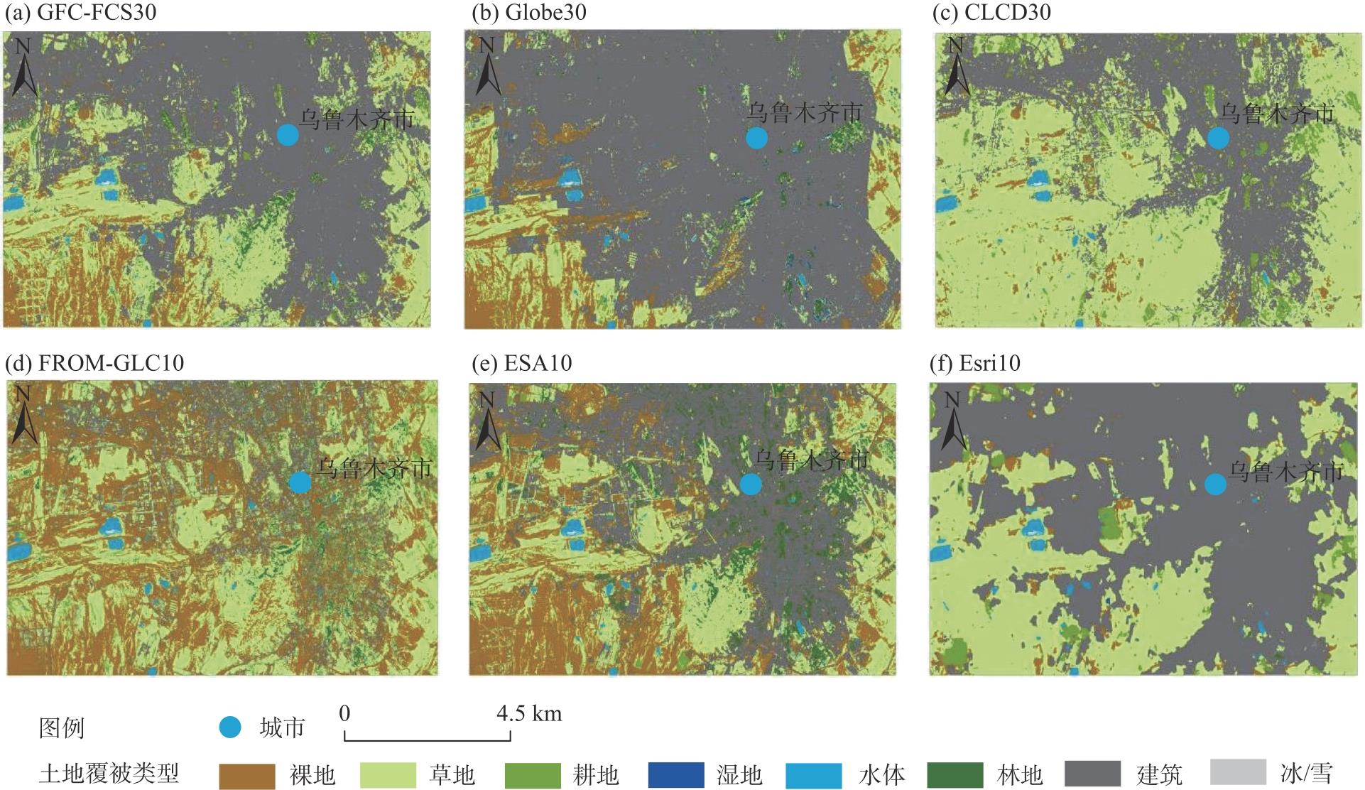 土地覆被产品为全球各种地球系统科学应用提供了重要的地表覆被信息,如CLCD30(30 m)、GlobeLand30(30 m,简称 Globe30)、GLC_FCS30(30 m)、FROM-GLC10(10 m)、Esri_Land_Cover_2020(10 m,简称 Esri10),以及ESAWorldCover2020(10 m,简称 ESA10),然而其在局地的精度和适用性如何尚不明确。基于Sentinel-2影像,通过样本精度评价和类别混淆评价对上述6套土地覆被数据产品在天山北坡城市群的精度及误差情况进行了研究和分析,并探讨了误差成因和不同数据产品的适用性。结果表明:(1)6套数据产品中,除Esri10外,其余5套数据产品的类型构成、面积占比相对一致。(2)GLC-FCS30、Globe30、CLCD30、FROM-GLC10、ESA10、Esri10的总体精度分别为0.8080、0.8147、0.7880、0.8531、0.8047、0.4725。(3)从产品适用性来看,GLC_FCS30适用于对耕地、裸地的分析,CLCD30适用于对林地、裸地的分析,FROM-GLC10适用于对草地、水体、冰/雪以及建筑的分析,ESA10适用于对耕地和草地的分析,Esri10适用于对林地、冰/雪以及建筑的分析,Globe30在各类别精度评价结果上更均衡。(4)类别混淆主要是耕地、林地以及草地之间及与其他类别的相互混淆,尤其是在土地覆被复杂的地区,如城市边缘区域。