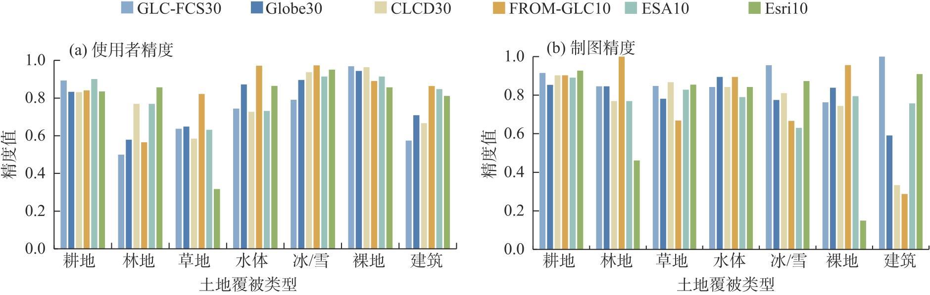| 精度指标 | GLC-FCS30 | Globe30 | CLCD30 | FROM-GLC10 | ESA10 | Esri10 |