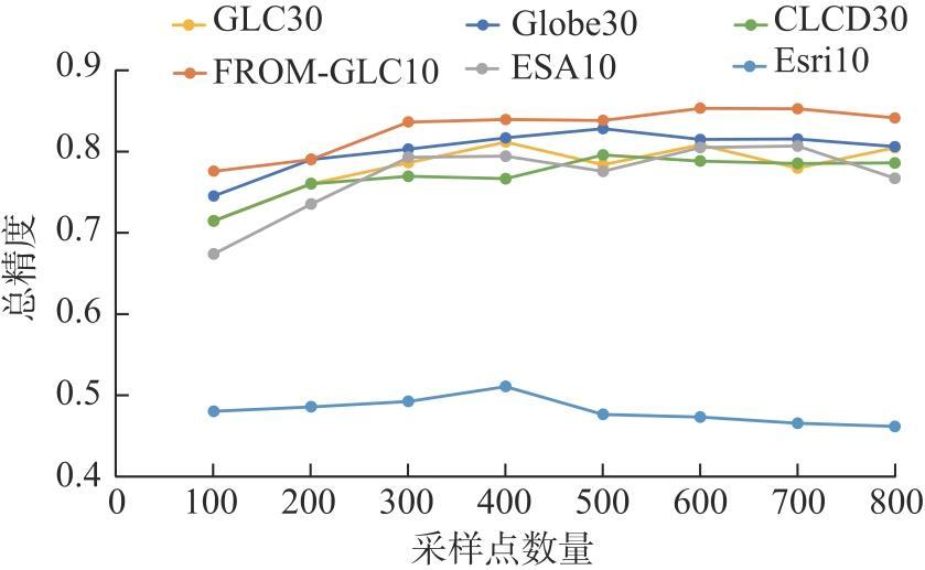 表3 6组数据产品的总精度和Kappa系数Tab. 3 Total accuracy and Kappa coefficient of the six land cover data products |