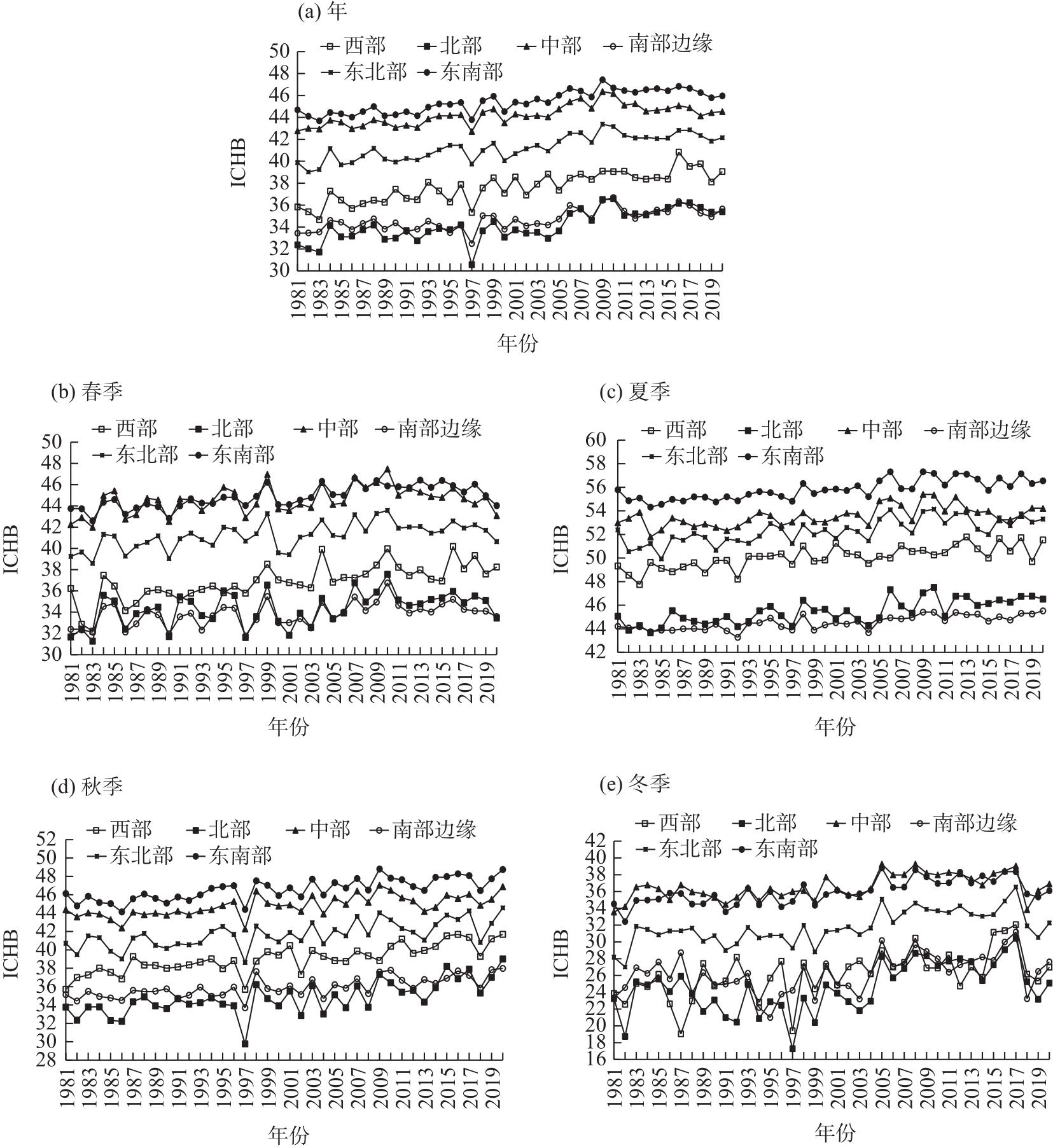 表5 1981—2020年西藏高原各气候区ICHB及其变化倾向率Tab. 5 ICHB and its change tendency rate in different regions of the Xizang Plteau form 1981 to 2020 |