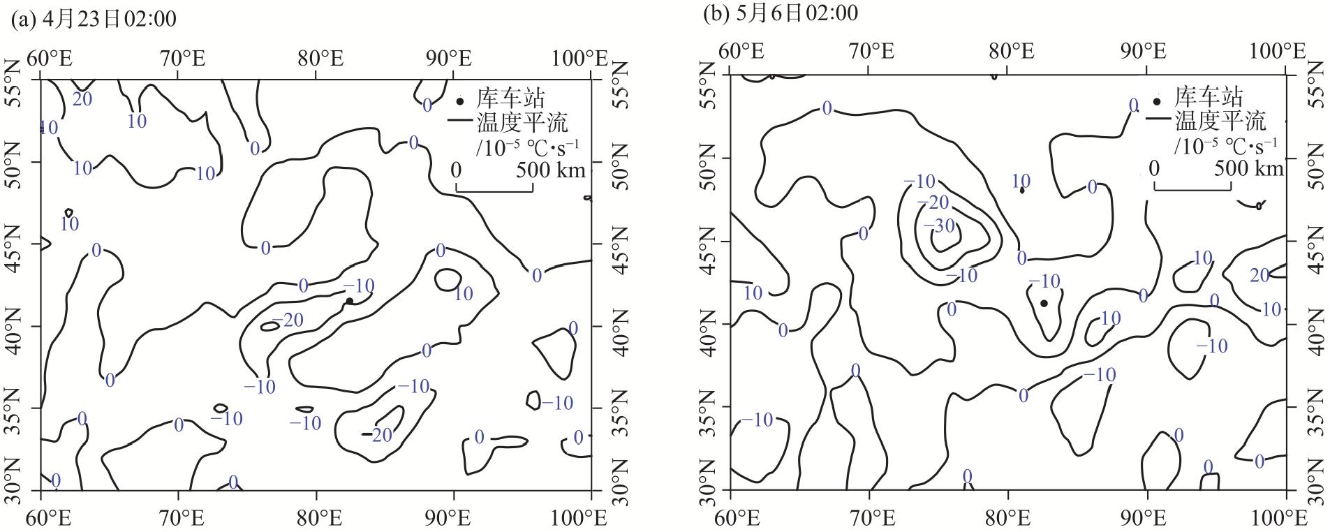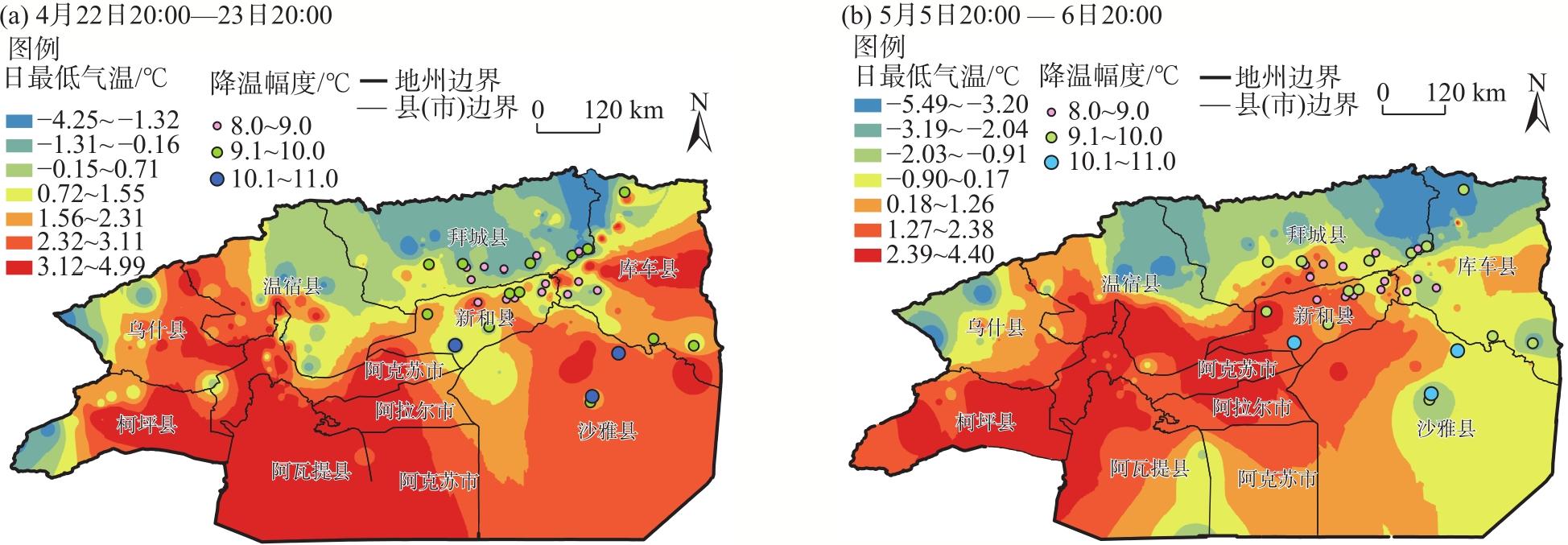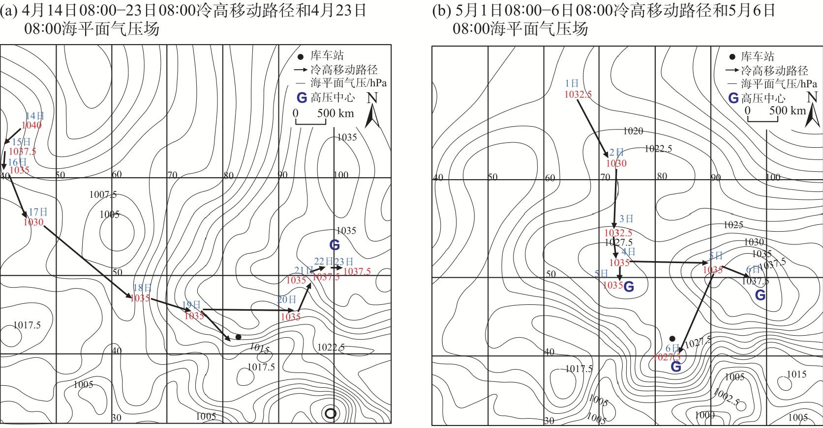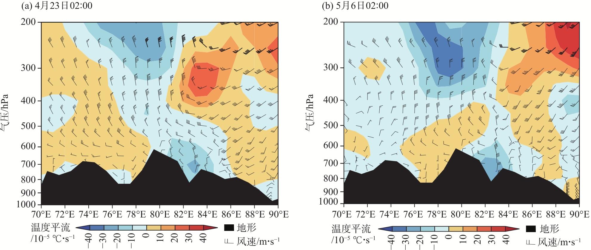 2023年4月23日和5月6日阿克苏地区东部出现极端低温霜冻天气(简称“4.23”过程和“5.6”过程),尤其“5.6”过程库车市出现历史最晚终霜。基于常规观测、L波段探空、NCEP/NCAR 1°×1°逐6 h再分析等资料,利用天气动力学方法对比分析2次极端低温过程环流背景,高低空配置、冷空气及冷平流强度、锋生作用等,探讨极端低温霜冻成因。结果表明:(1) 两者有共性也有差异,共性表现在2次过程500 hPa阿克苏地区东部均受低槽(低涡)后部西北气流携带冷空气影响,且温度梯度大,锋区增强;均有深厚冷平流自阿克苏西部沿高层偏北气流向阿克苏地区东部低层下传;低温时段贴地层均有逆温和明显锋生,锋生与冷空气进入南疆盆地的路径及低温持续时间对应,且高层能量锋区较强,中低层锋区在增强过程中有斜压不稳定发展;均在霜冻出现前6 h冷平流强度增至最大,冷平流与8 ℃以上降温区域对应较好,且850 hPa温度降至3~4 ℃,对低温霜冻预报有一定指示性。(2) 不同点在于“4.23”过程冷空气为西北路径,西翻和东灌冷空气共同影响阿克苏地区,贴地层逆温明显偏强,为辐射+平流降温;“5.6”过程冷空气为偏北路径,较强冷高压翻越天山进入南疆盆地,同时有东灌冷空气补充,影响范围大、逆温弱但整层降温明显,以辐射降温为主。(3) “5.6”过程低涡在新疆维持时间长,其冷空气及锋区强度、假相当位温梯度及影响时间均较“4.23”过程更强,灾害更重。