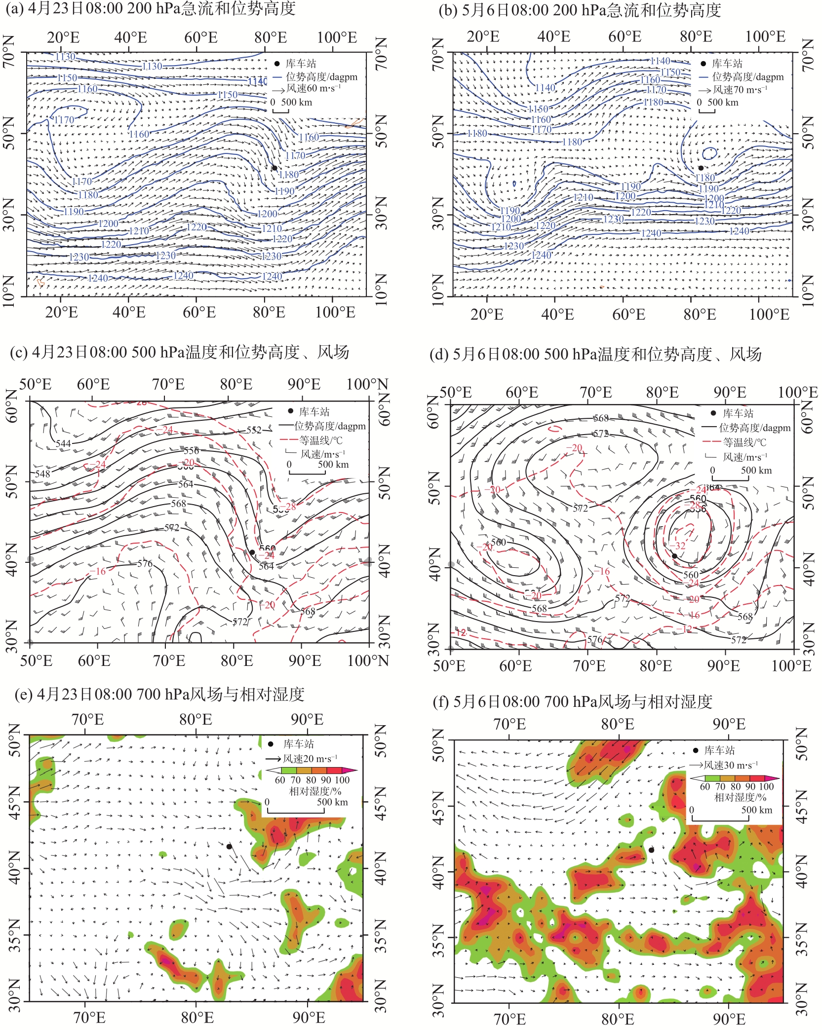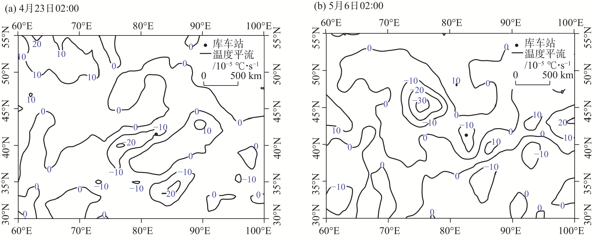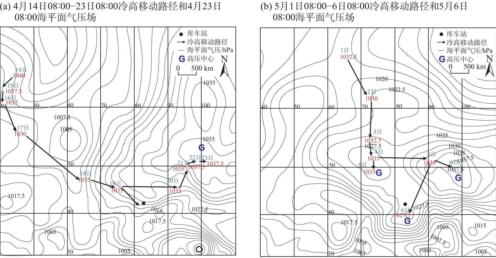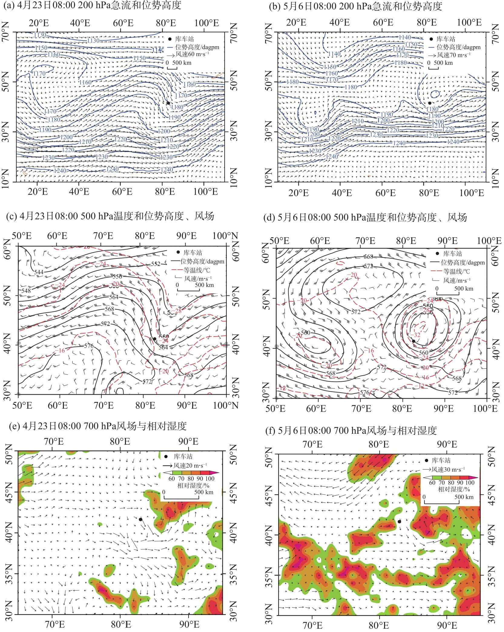 2023年4月23日和5月6日阿克苏地区东部出现极端低温霜冻天气(简称“4.23”过程和“5.6”过程),尤其“5.6”过程库车市出现历史最晚终霜。基于常规观测、L波段探空、NCEP/NCAR 1°×1°逐6 h再分析等资料,利用天气动力学方法对比分析2次极端低温过程环流背景,高低空配置、冷空气及冷平流强度、锋生作用等,探讨极端低温霜冻成因。结果表明:(1) 两者有共性也有差异,共性表现在2次过程500 hPa阿克苏地区东部均受低槽(低涡)后部西北气流携带冷空气影响,且温度梯度大,锋区增强;均有深厚冷平流自阿克苏西部沿高层偏北气流向阿克苏地区东部低层下传;低温时段贴地层均有逆温和明显锋生,锋生与冷空气进入南疆盆地的路径及低温持续时间对应,且高层能量锋区较强,中低层锋区在增强过程中有斜压不稳定发展;均在霜冻出现前6 h冷平流强度增至最大,冷平流与8 ℃以上降温区域对应较好,且850 hPa温度降至3~4 ℃,对低温霜冻预报有一定指示性。(2) 不同点在于“4.23”过程冷空气为西北路径,西翻和东灌冷空气共同影响阿克苏地区,贴地层逆温明显偏强,为辐射+平流降温;“5.6”过程冷空气为偏北路径,较强冷高压翻越天山进入南疆盆地,同时有东灌冷空气补充,影响范围大、逆温弱但整层降温明显,以辐射降温为主。(3) “5.6”过程低涡在新疆维持时间长,其冷空气及锋区强度、假相当位温梯度及影响时间均较“4.23”过程更强,灾害更重。