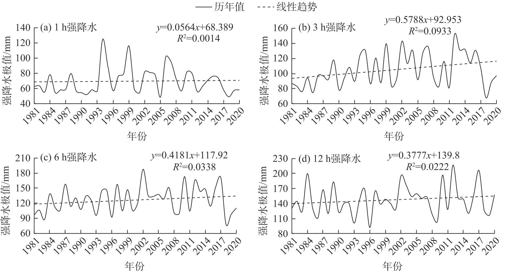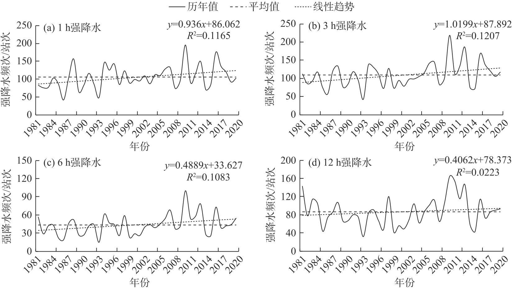 图7 1981—2020年不同历时强降水频次的逐年变化Fig. 7 Annual variations of heavy rainfall frequency with different durations from 1981 to 2020 |