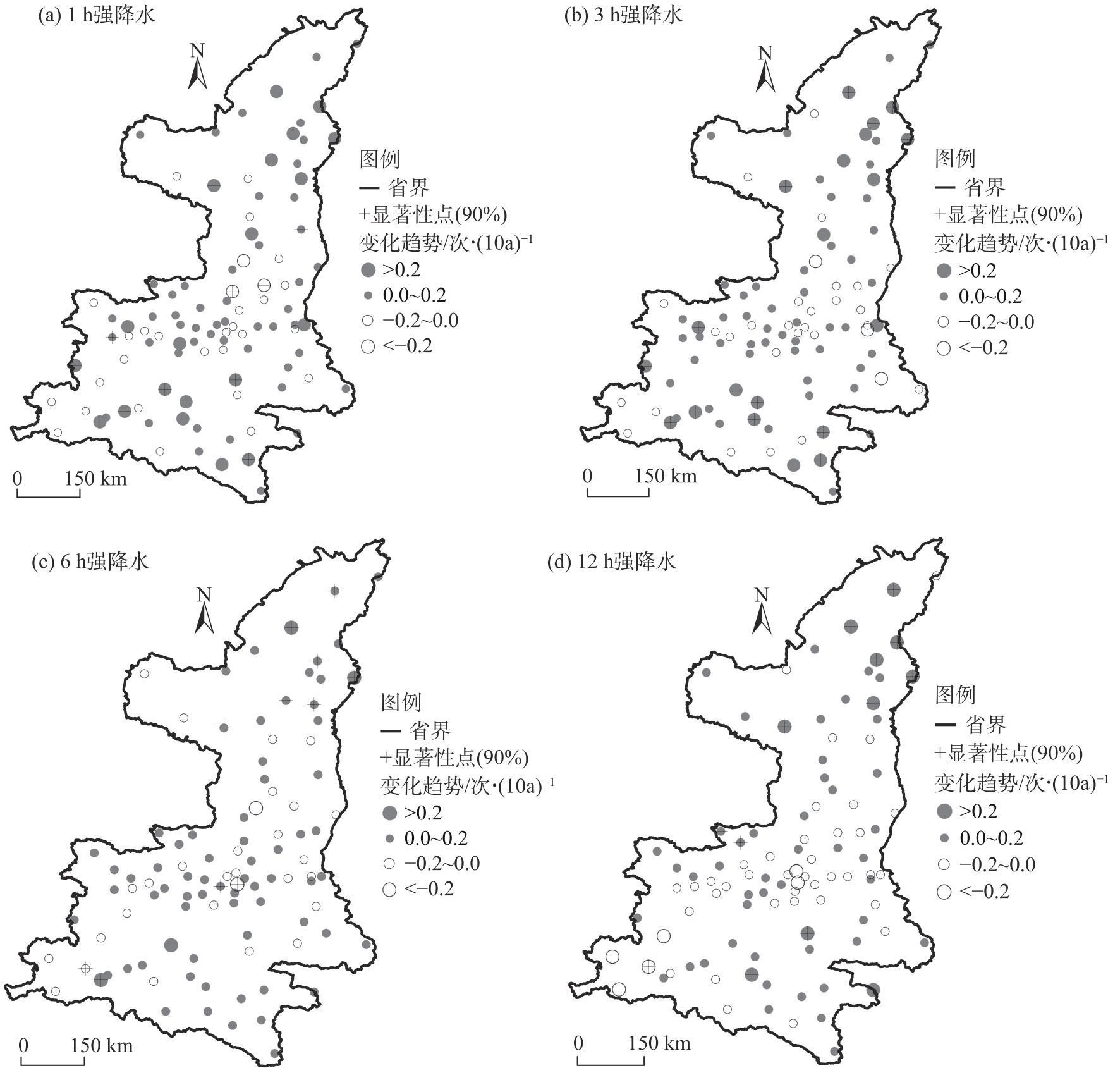 表1 1981—2020年各月不同历时强降水出现频次的线性变化趋势系数Tab. 1 Linear trend coefficient of heavy precipitation frequency with different durations from 1981 to 2020 |