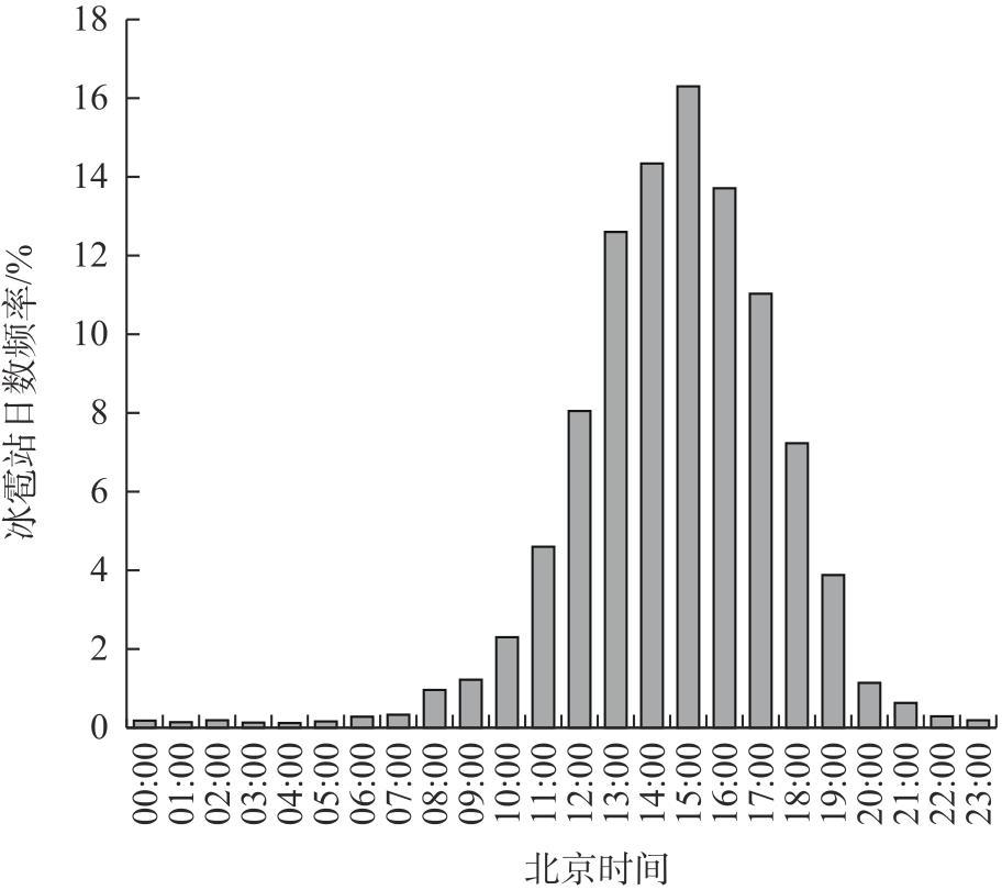 | 冰雹站日数频率/% | 0.00 | 0.00 | 0.29 | 4.31 | 13.65 | 25.45 | 20.54 | 16.33 | 15.82 | 3.50 | 0.09 | 0.02 |
