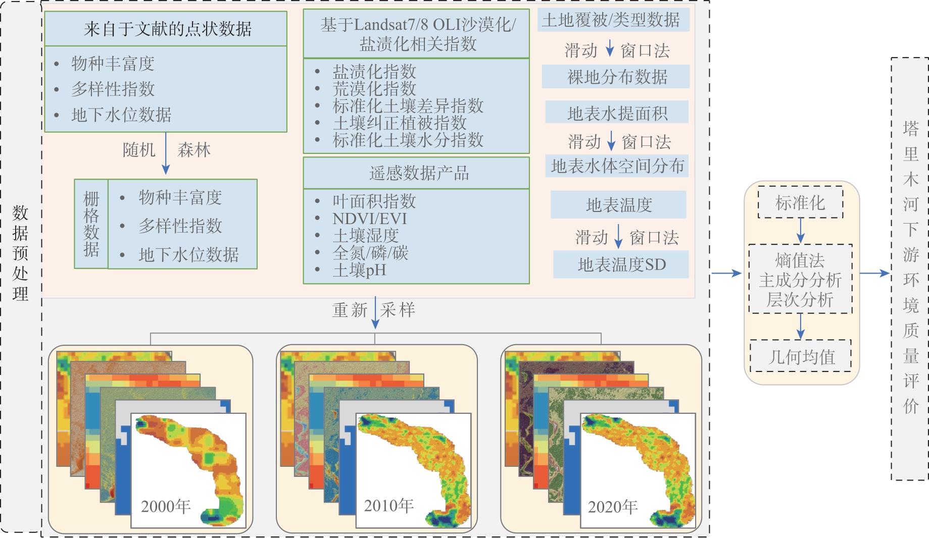 | 盐渍化地 | 土壤指数 | 基于Landsat 8 OLI计算 | 2000,2010,2020 | 负向 | 30 |