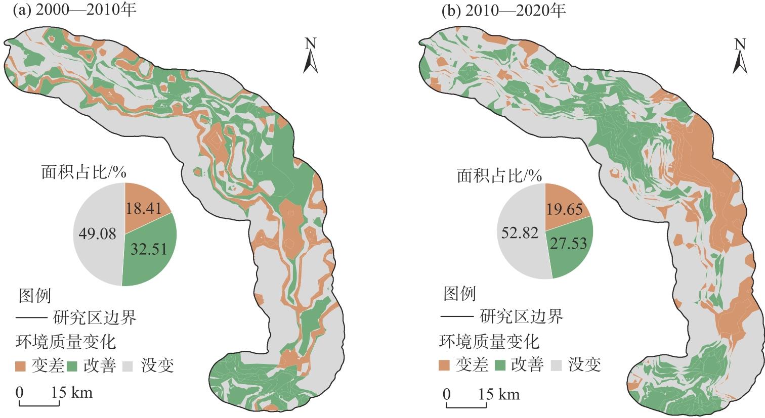 表2 塔里木河下游环境质量变化转移矩阵Tab. 2 Transition matrix of different EQI from 2000 to 2020 in the lower reaches of Tarim River /km2 |