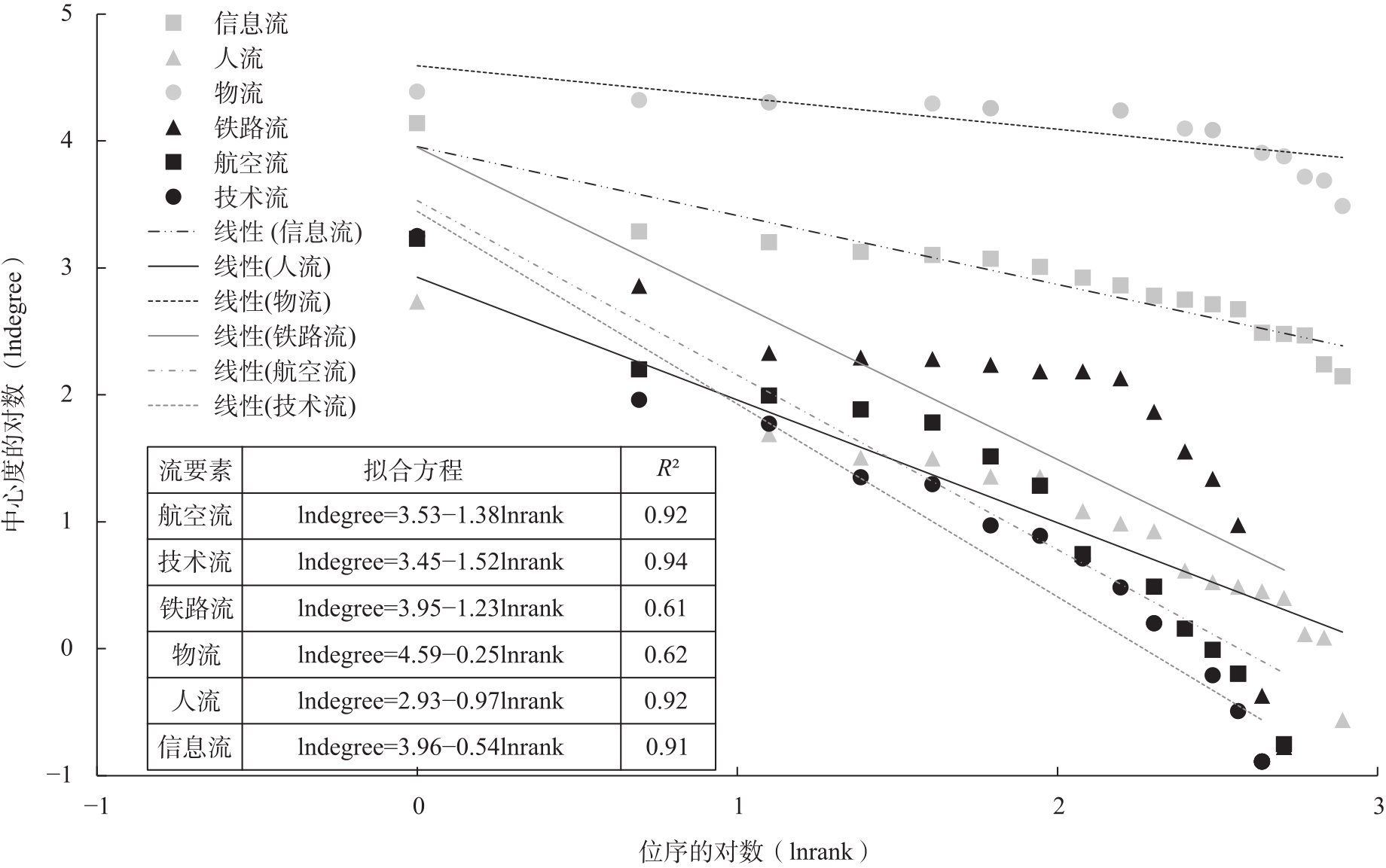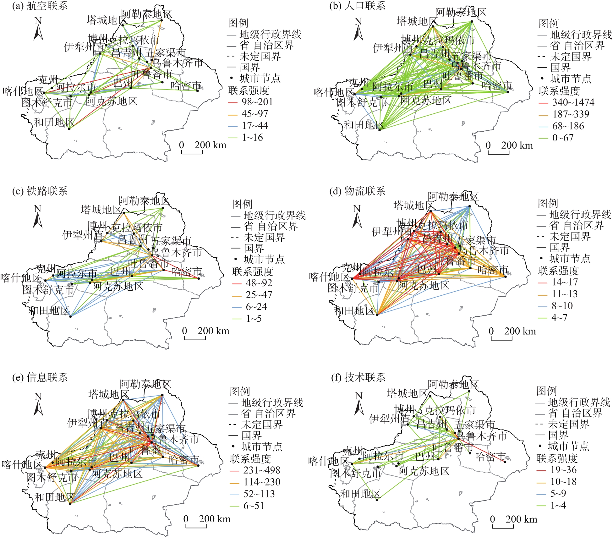 各种要素的空间流动不断重塑城市间的联系。相较于单一要素视角下的城市网络研究,多元要素流视角下的城市网络研究能够更加全面地识别城市空间格局,体现出城市网络的地域特征。以新疆为案例区,基于航空、人口、铁路、物流、信息、技术等要素关系数据反映城市间的相互作用,运用社会网络分析法,对绿洲城市网络的结构特征进行分析。结果表明:(1) 受绿洲分布格局影响,干旱区城市网络呈现出以核心城市为中心的“单核心引领+扁平化发展”的总体特征。(2) 交通流和技术流网络的首位特征更为明显,物流和信息流网络受首位城市的影响较小,城市中心性规模分散,城市间差距较小。(3) 物流和信息流网络密度较大,发育成熟,呈现多中心的网络结构,交通流、人流和技术流网络以单中心为主,且呈现出“核心-边缘”结构。(4) 加快培育增长极,引导区域网络结构向多中心化转变,加强区域创新互补是绿洲城市高质量发展、城镇体系空间优化的首要目标。