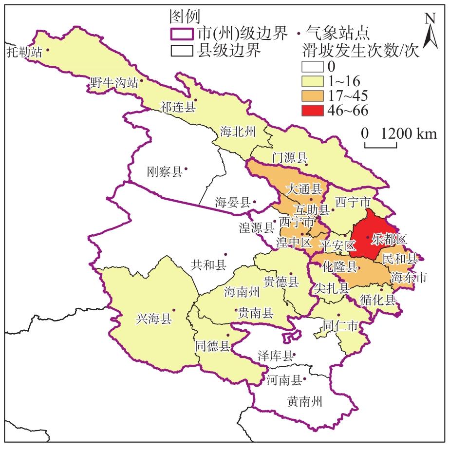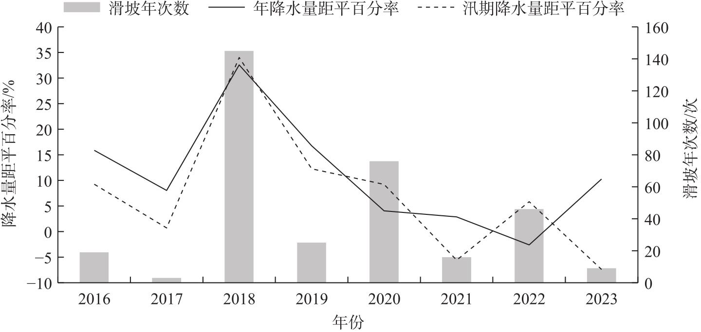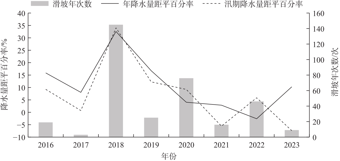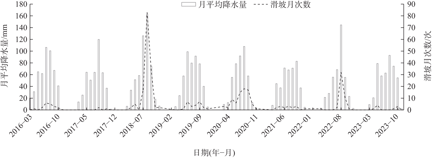 图4 2016年3月—2023年11月青海东部月降水量与滑坡次数Fig. 4 Monthly precipitation and landslide frequency in eastern Qinghai Province from March 2016 to November 2023 |
