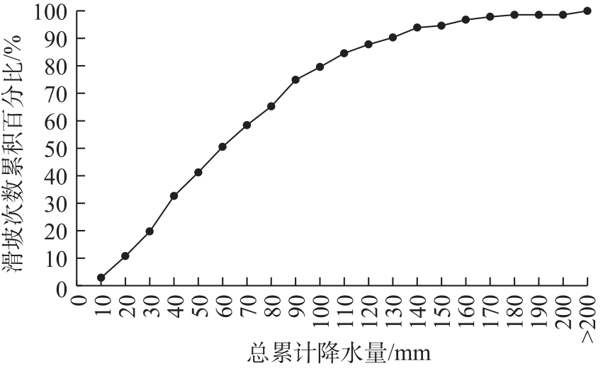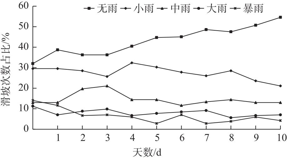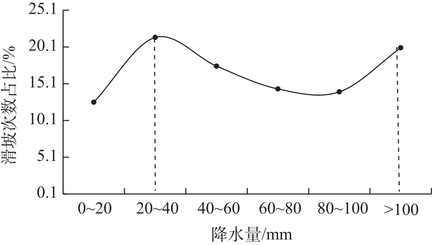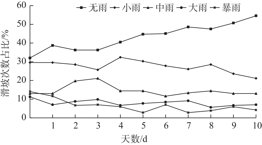 表2 滑坡发生当天及前10 d内出现1次大雨及以上量级降水时滑坡发生次数比例Tab. 2 Proportion of landslide occurrence times under heavy rain and precipitation of magnitude above on the day of landslide occurrence and within the first 10 days |