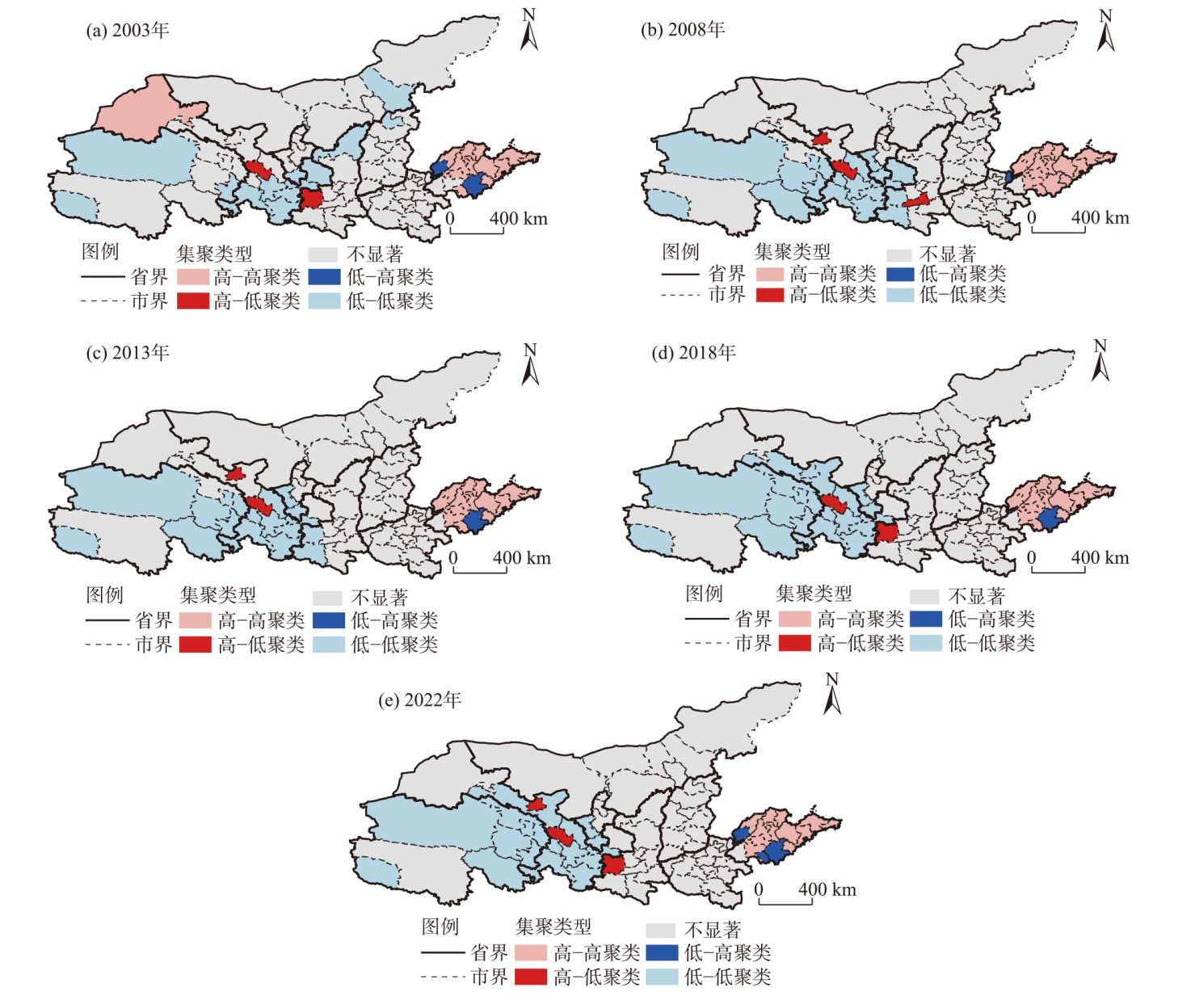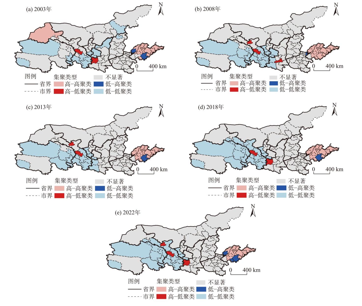 表3 2003—2022年沿黄地区经济韧性的全局莫兰指数Tab. 3 Global Moran’s I of economic resilience in the Yellow River region from 2003 to 2022 |