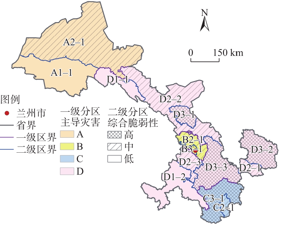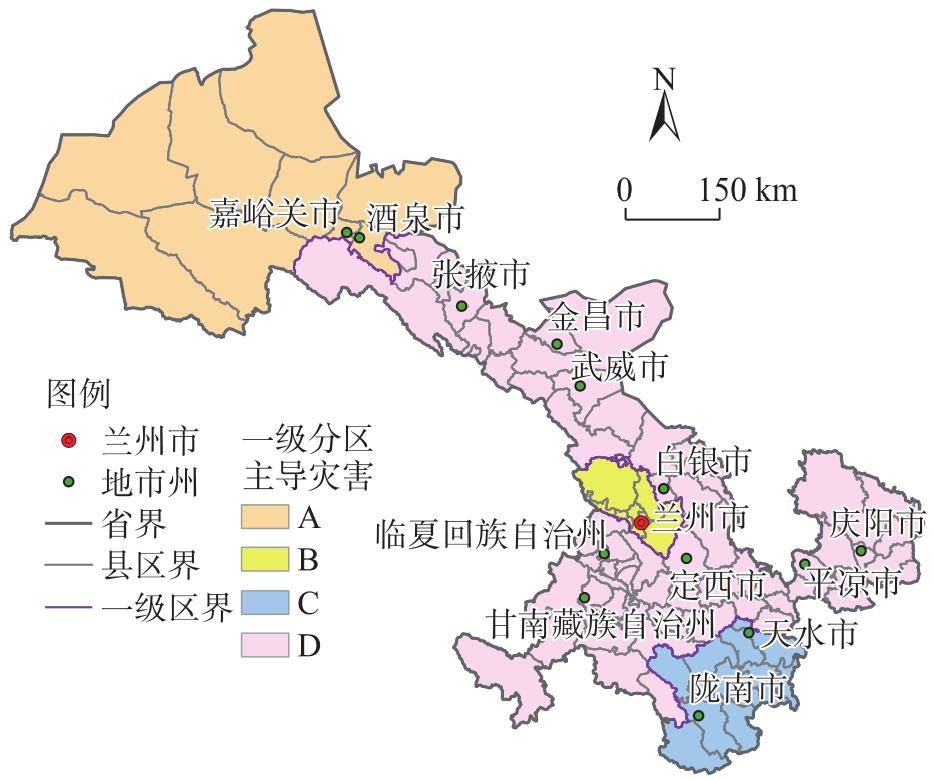 | A河西走廊西段沙尘暴主导灾害区 A1-1柴达木北缘极高适应低脆弱区 A2-1北山山地高适应中脆弱区 B兰州市旱灾主导灾害区 B2-1兰州市郊县高适应中脆弱区 B3-1兰州市城区高适应高脆弱区 C陇南市暴雨洪水滑坡/泥石流主导灾害区 C2-1南秦岭山地中脆弱区 C3-1北秦岭-南部山地高脆弱区 | D河西走廊及陇东-陇中-甘南藏族自治州多灾种灾害区 D1-1肃南县祁连山地高适应低脆弱区 D1-2甘南州高原低适应低脆弱区 D2-1六关山山地中脆弱区 D2-2河西走廊中东段高适应中脆弱区 D2-3陇中黄土高原西部中脆弱区 D3-1凉州区-古浪县高适应高脆弱区 D3-2陇东黄土高原北-东部高脆弱区 D3-3陇中黄土高原中-东部高脆弱区 |