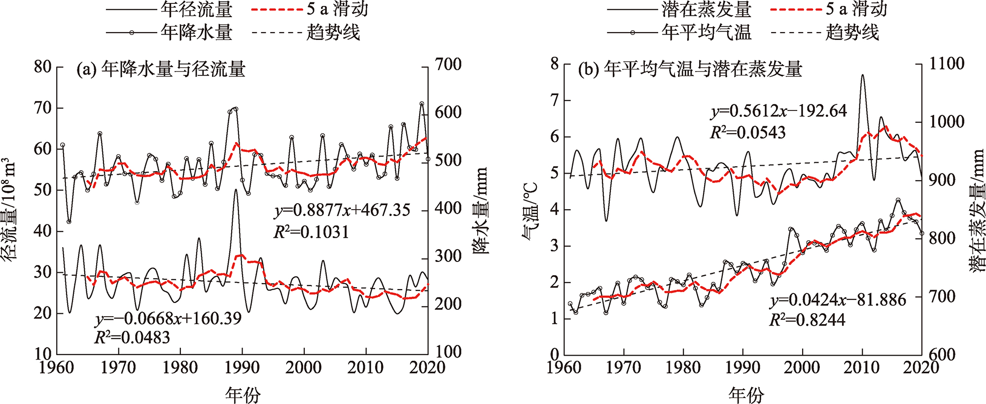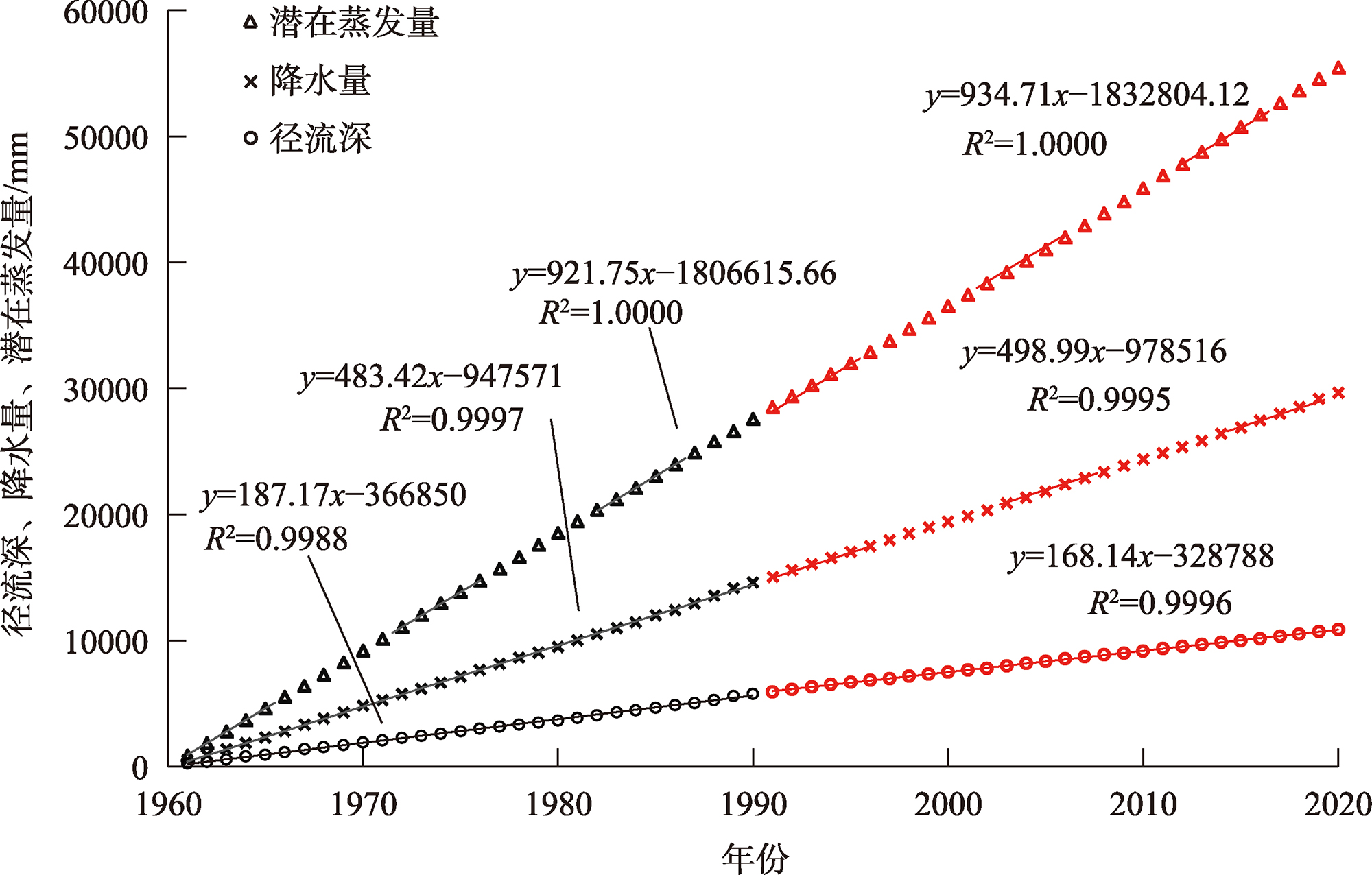 图6 大通河流域累积年径流深、降水量和潜在蒸发量与年份的拟合关系Fig. 6 Fitting relationship between cumulative annual runoff depth, precipitation, evapotranspiration and year in the Datong River Basin |