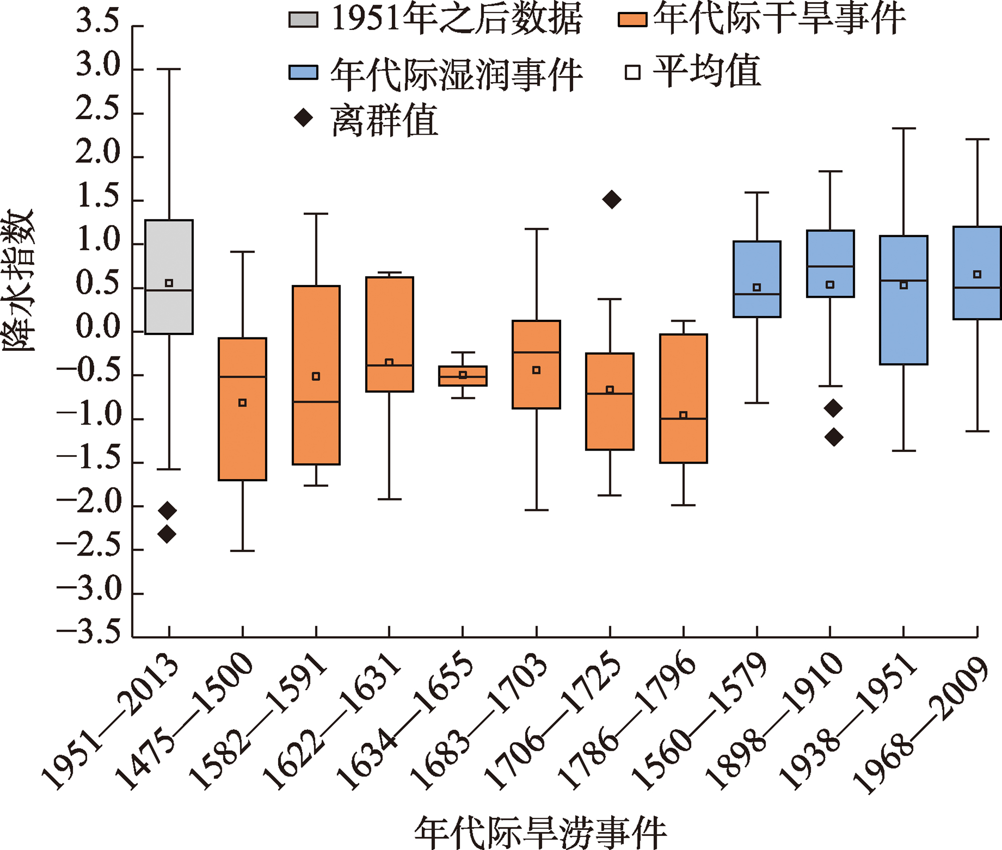 | 年代际干 旱事件 | 1 1475—1500(26) | 1475—1502(28) | 1475—1500(26) |