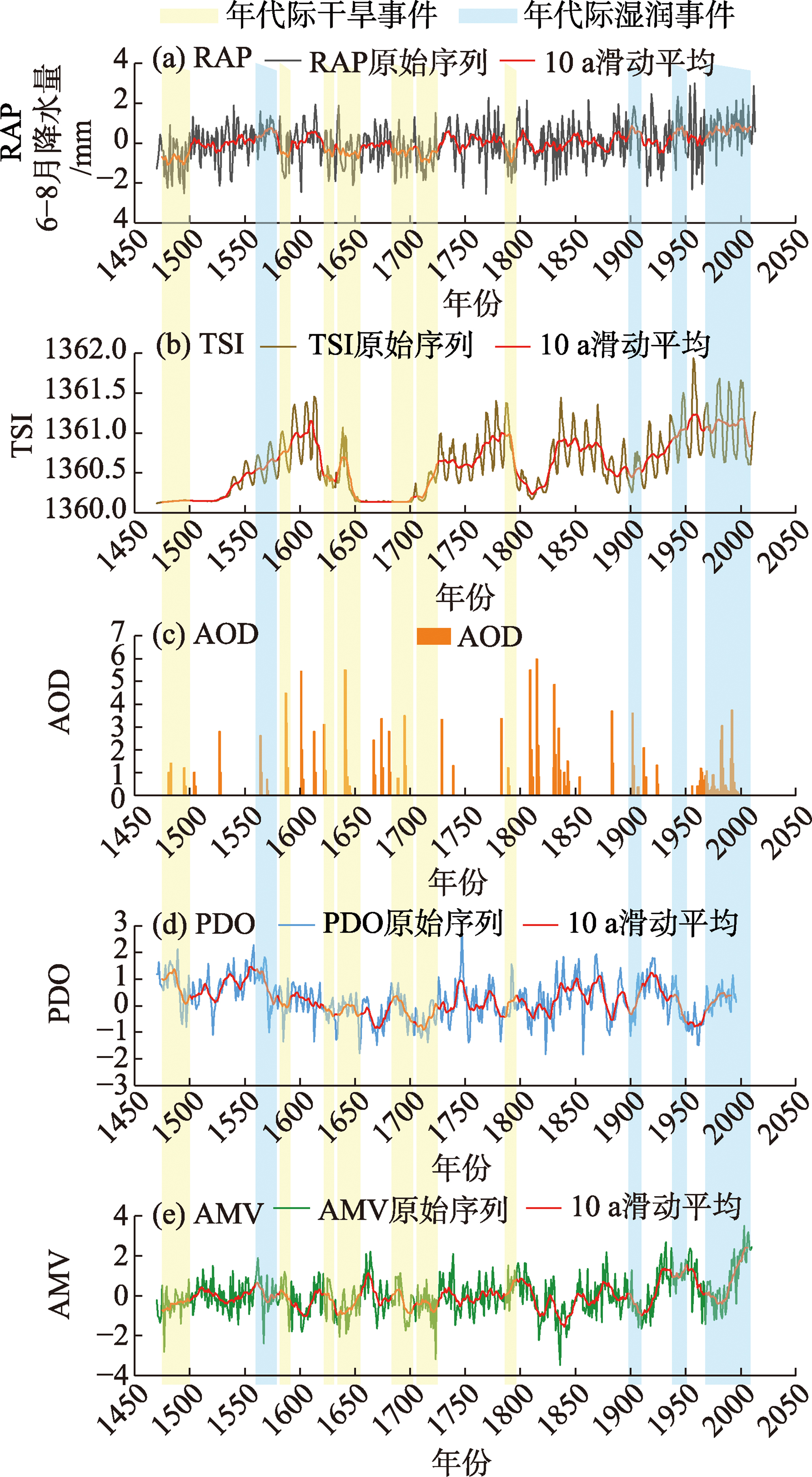注:TSI为太阳总辐照度;AOD为气溶胶光学厚度;PDO为太平洋年代际振荡;AMV为大西洋年代际变率。 |