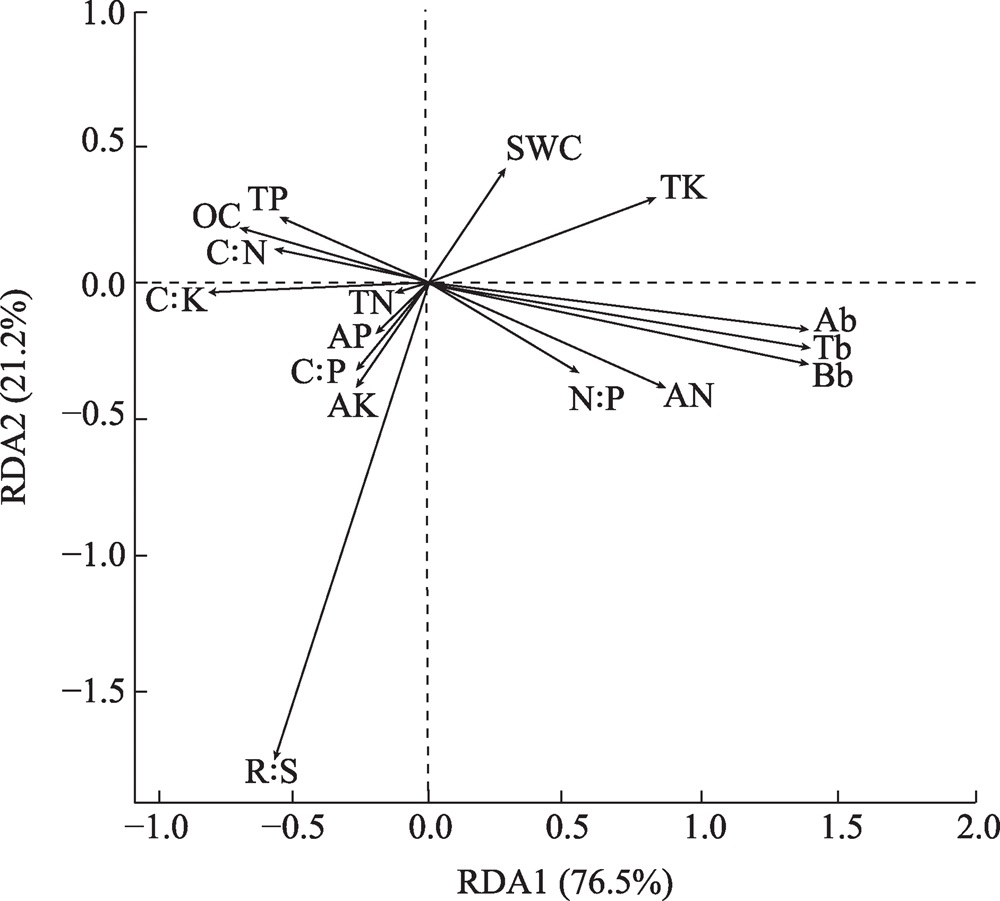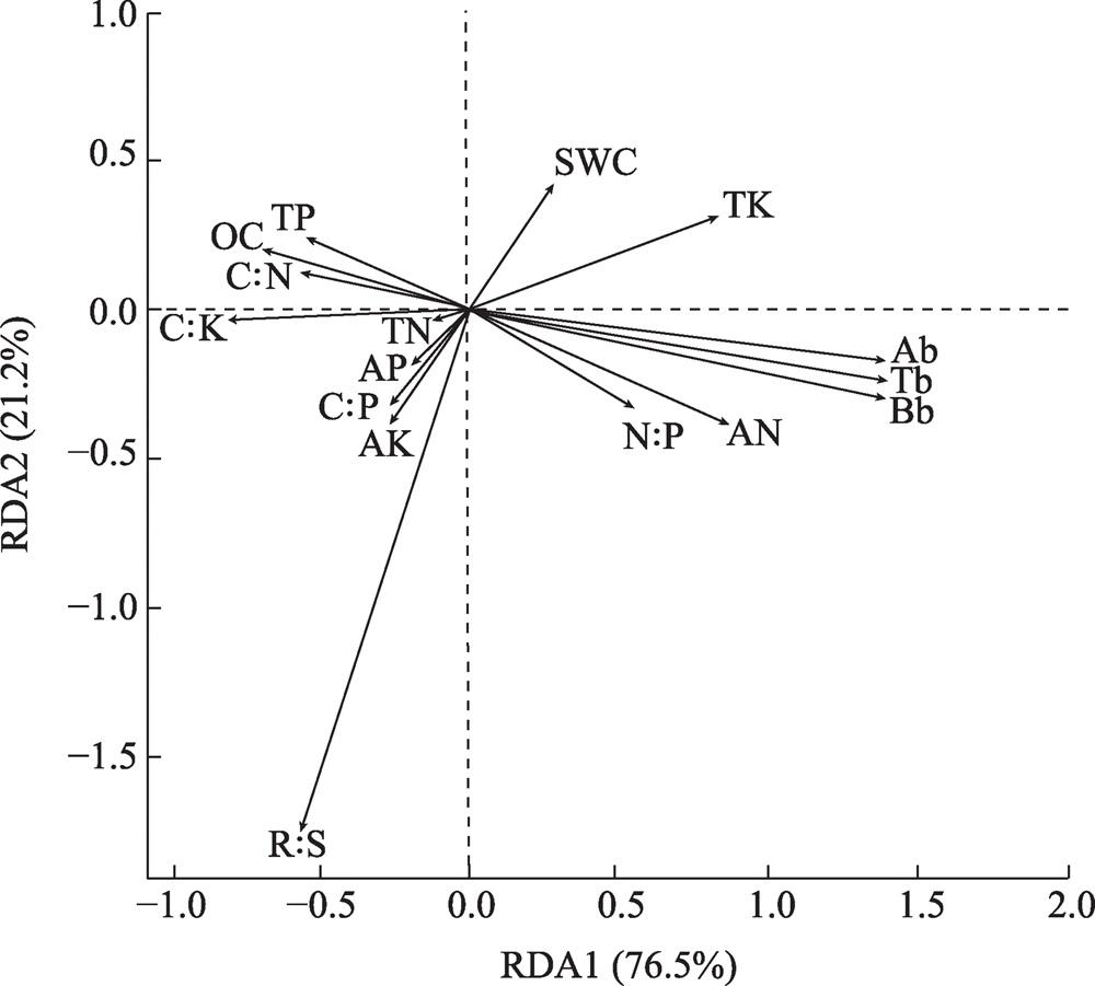 图2 植物生物量和土壤养分特征的RDA排序图注:RDA1、RDA2分别为冗余分析第一排序轴和第二排序轴。 Fig. 2 RDA ranking plot of plant biomass and soil nutrient characteristics |