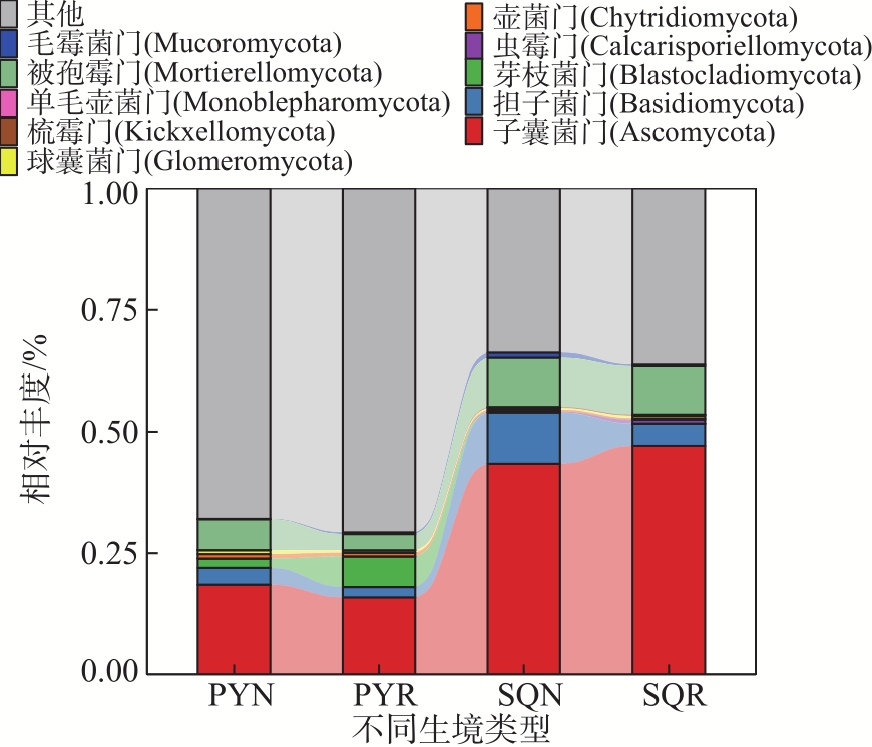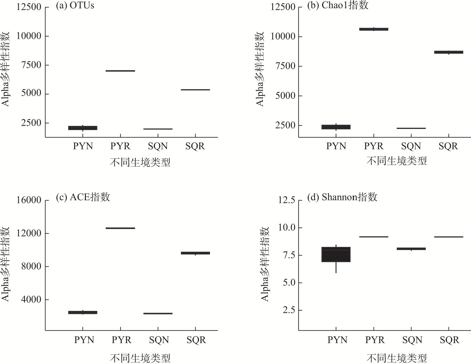 图2 不同生境苜蓿根际土壤真菌多样性注:OTUs为操作分类单元,代表一组相似序列的聚类;Chao1是由Chao提出的用Chao1算法估计样本中所含OTU数目的指数;ACE是用来估计群落中含有OTU数目的指数;Shannon指数为香农指数。 Fig. 2 Fungal diversity in rhizosphere soil of alfalfa in different habitats |