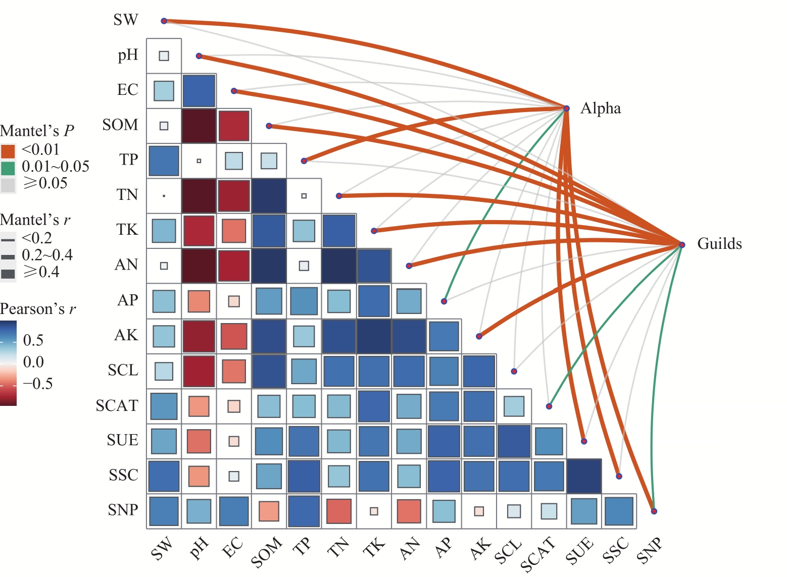 图8 土壤理化环境因子和土壤酶活性与真菌群落Alpha多样性和功能群落之间的Mantel分析注:TK为全钾;TN为全氮;TP为全磷;SOM为有机质;AK为速效钾;AN为碱解氮;AP为有效磷;SW为土壤含水率;EC为电导率;SCAT为过氧化氢酶;SUE为脲酶;SCL为纤维素酶;SSC为蔗糖酶;SNP为土壤中性磷酸酶。Mantel’s P是一种检验2个矩阵之间的相关性是否显著的方法,其值表示相关性检验的显著性水平;Mantel’s r是Mantel 检验的相关系数,用于衡量2个距离矩阵之间的相关性程度;Pearson’s r是皮尔逊相关系数,用于衡量2个连续变量之间的线性关系强度和方向。 Fig. 8 Mantel analysis of the relationship between soil physicochemical environmental factors, soil enzyme activity, and fungal community Alpha diversity and functional communities |