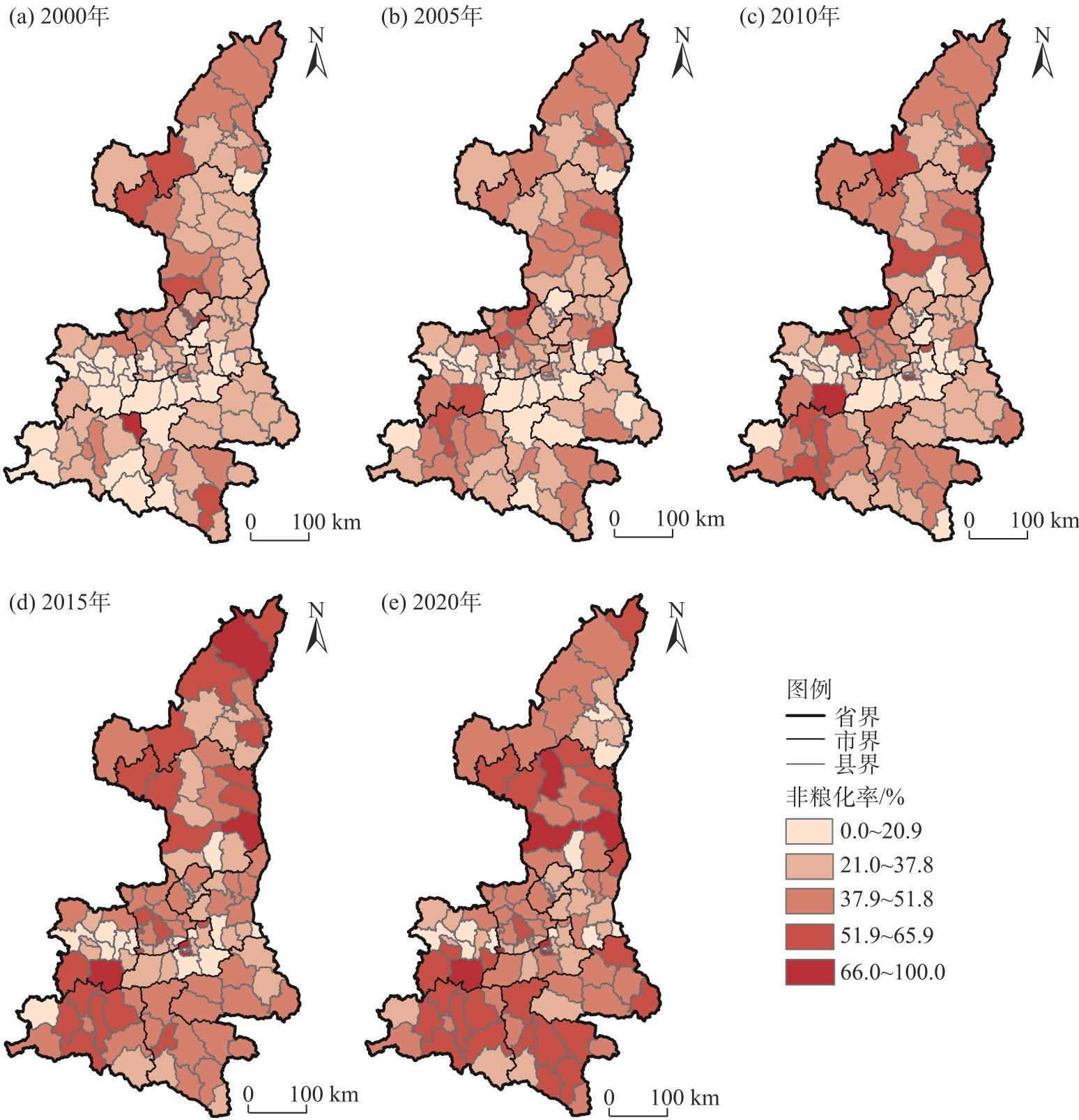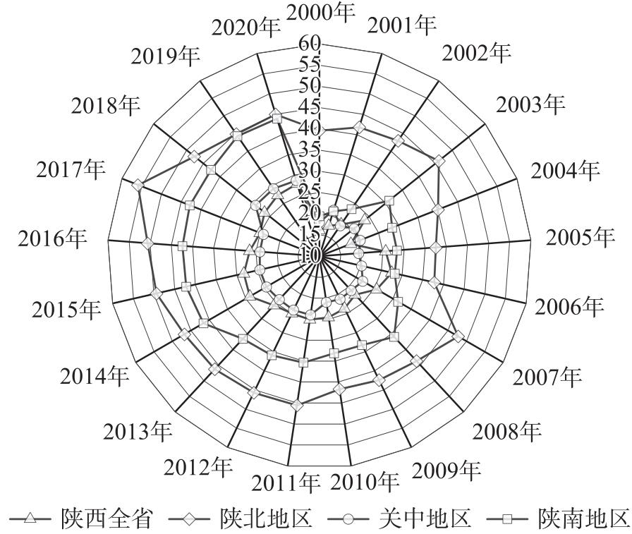 图2 2000—2020年陕西省及各分区耕地非粮化率年际变化Fig. 2 Interannual variations of non-grain rates of cultivated land in Shaanxi Province and its sub-regions from 2000 to 2020 |