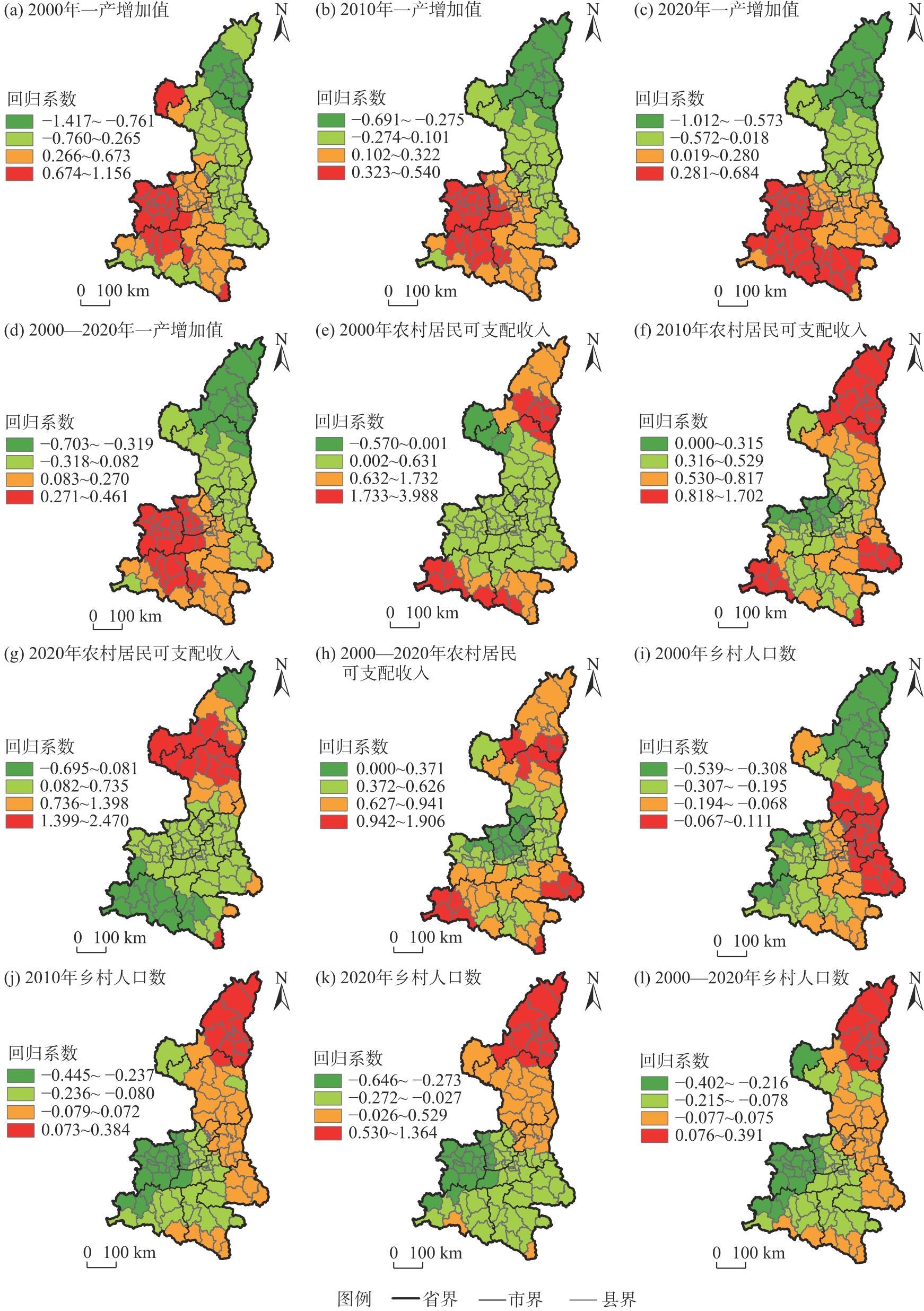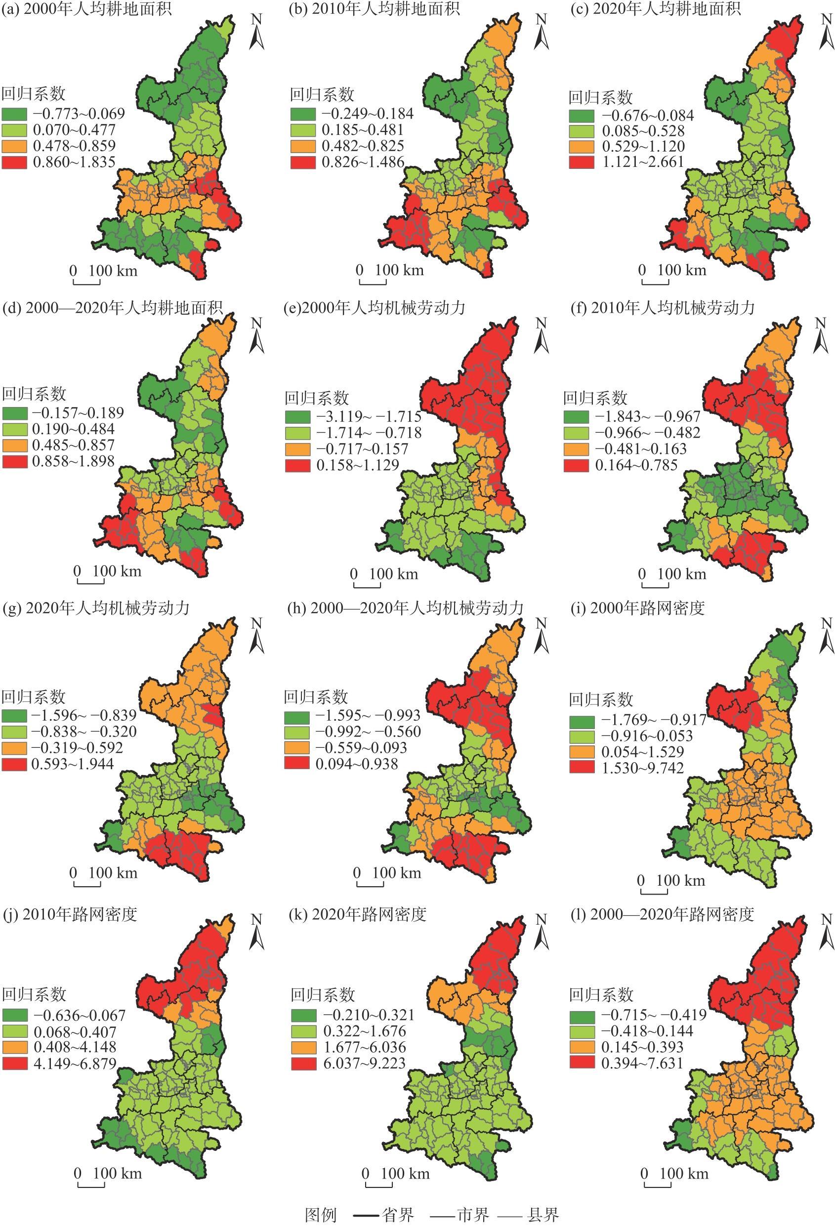 图6 生产条件维度指标GTWR模型回归结果Fig. 6 GTWR model regression results for the production conditions dimension indicators |