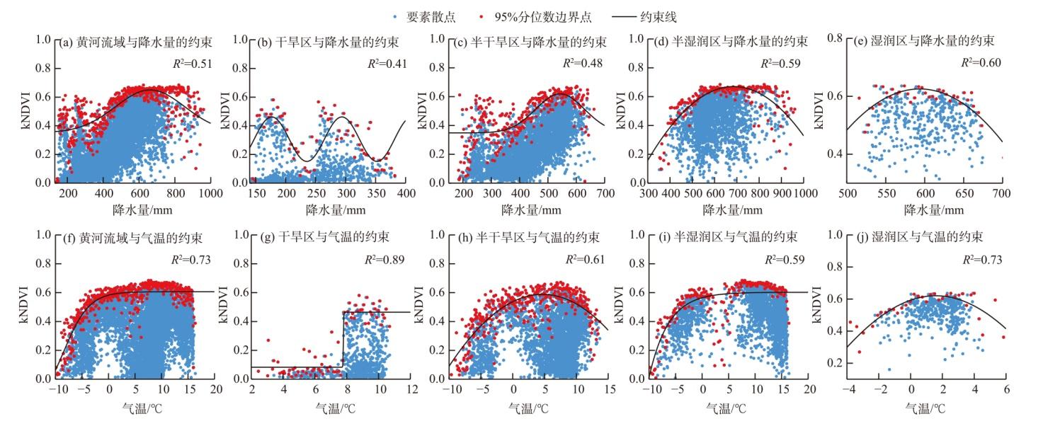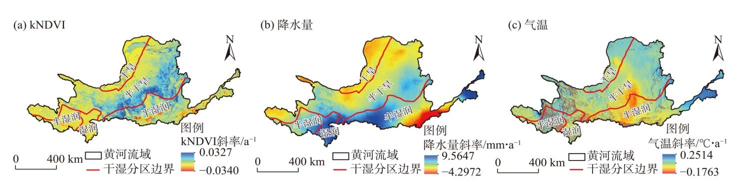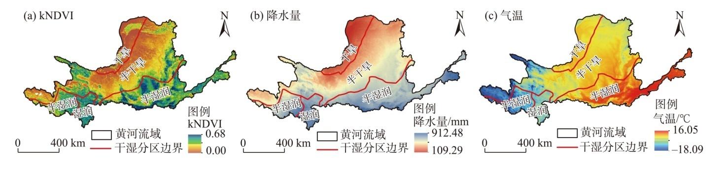 The Yellow River Basin, as a significant ecological protection and economic development area in China, exploring the characteristics of vegetation changes in different dry and wet zones within the basin is crucial for adjusting ecological restoration to address potential threats brought by environmental changes. Based on the kernel normalized difference vegetation index (kNDVI) and key meteorological factors [precipitation (PRE) and temperature (TEM)] from 2000 to 2022, this study utilized multivariate statistical methods to analyze the spatiotemporal patterns of vegetation dynamics in different dry and wet zones within the basin. Additionally, the Geodetector model and constrained effect method were employed to analyze the driving factors of vegetation changes in the Yellow River Basin, and to identify the commonalities and differences in the responses of vegetation changes to meteorological factors in different dry and wet zones. The results show that: (1) The kNDVI values of vegetation in the Yellow River Basin are latitudinally distributed, with the humid zone having the highest average annual kNDVI (0.49). During 2000—2022, 84.58% of the basin showed an upward trend, with the most significant improvements in the arid zone (68.36%) and semi-arid zone (93.08%). (2) Precipitation generally has a stronger influence on vegetation than temperature in the Yellow River Basin, with partial correlation coefficients of 0.36 and 0.19 at the basin scale, respectively. This difference is particularly pronounced in the semi-arid zone, where the partial correlation coefficients of precipitation and temperature reach 0.43 and 0.22, respectively. (3) In terms of spatial heterogeneity, the q value of precipitation (0.5338) is greater than that of temperature (0.2283) at the basin scale. Moreover, the q value of precipitation is highest in the semi-arid zone (0.4519), while the q value of temperature is highest in the semi-humid zone (0.2491). The responses of vegetation dynamics to various meteorological factors in different dry and wet zones exhibit distinct constraint lines. The research findings can provide important references for adjusting and formulating ecological protection strategies in the basin and are of great significance for promoting high-quality development in the Yellow River Basin.
