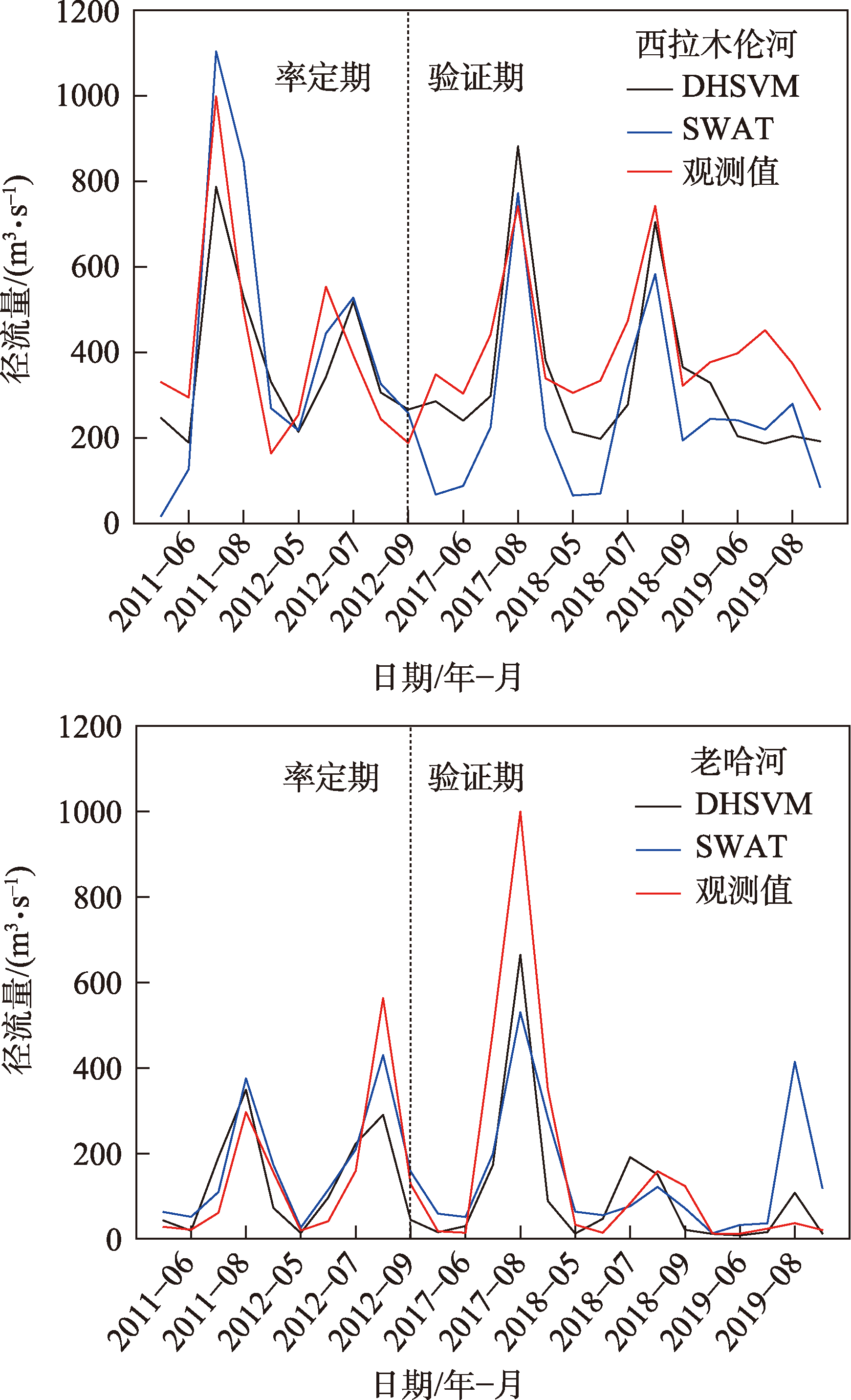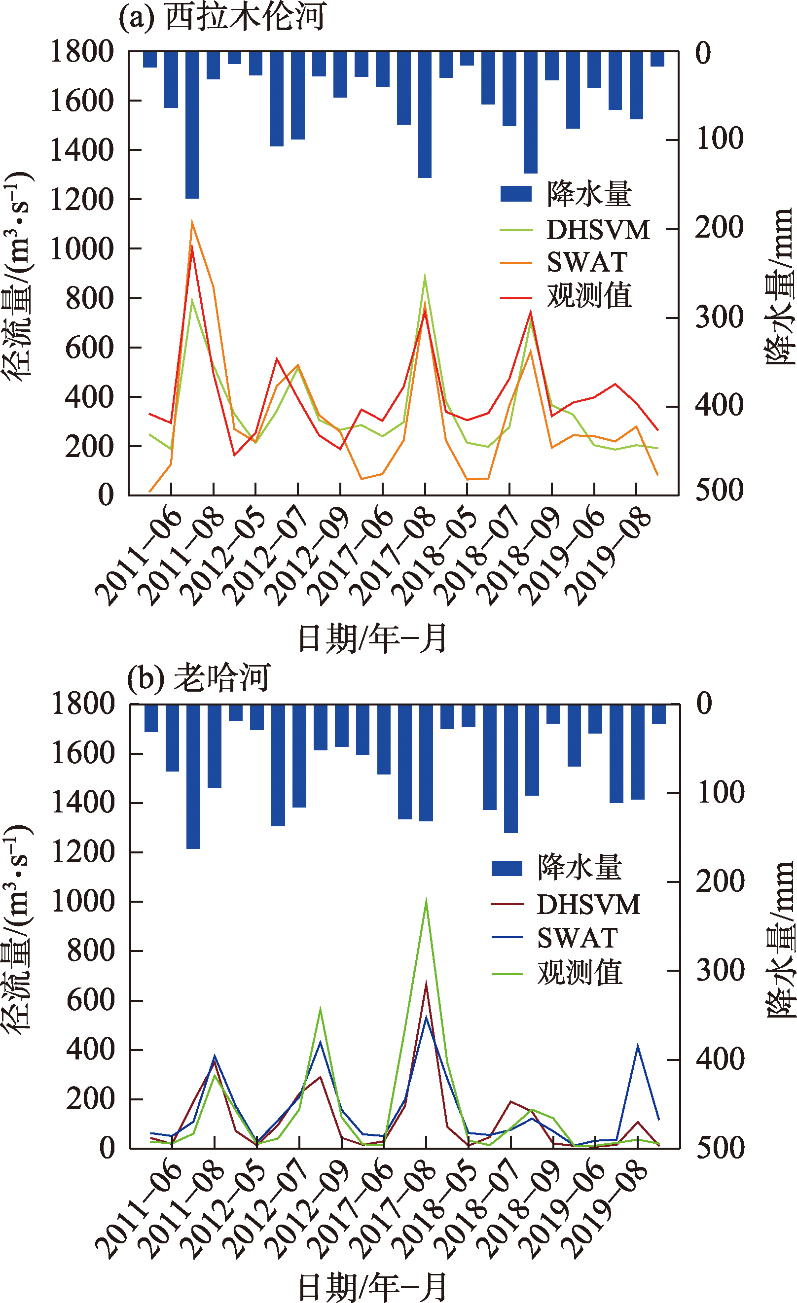 图4 DHSVM模型和SWAT模型模拟与观测月径流量Fig. 4 DHSVM and SWAT models simulate and observe monthly runoff |