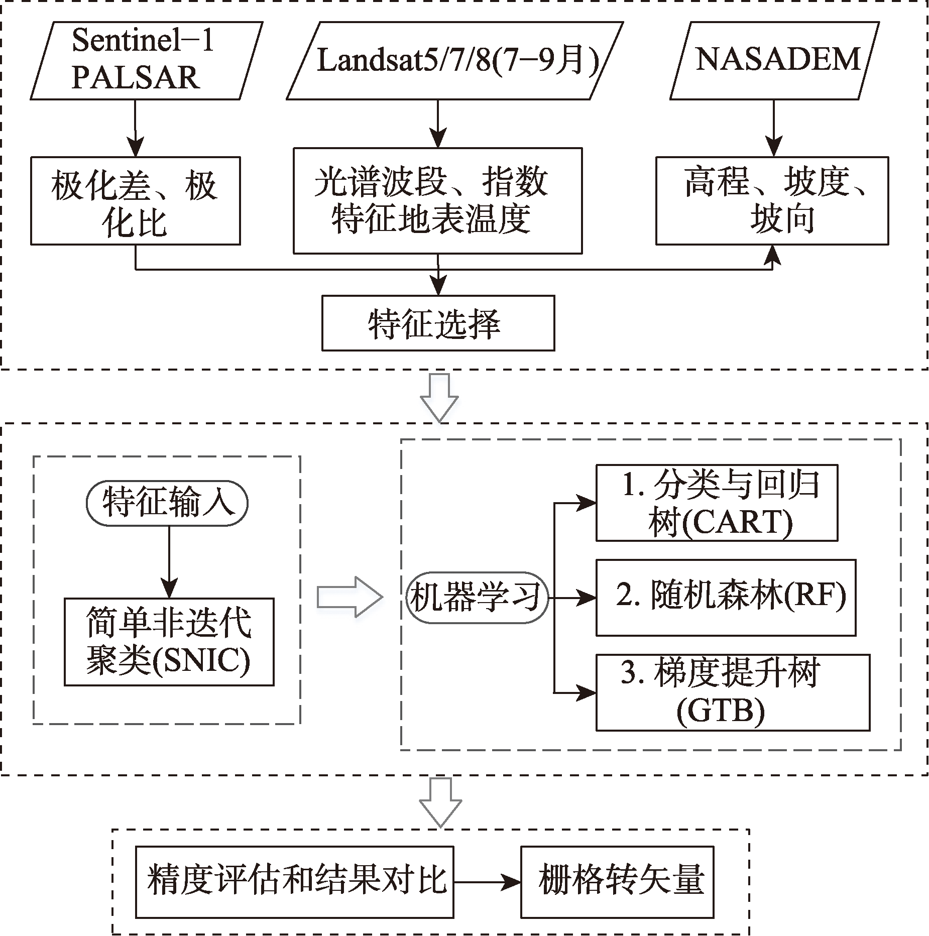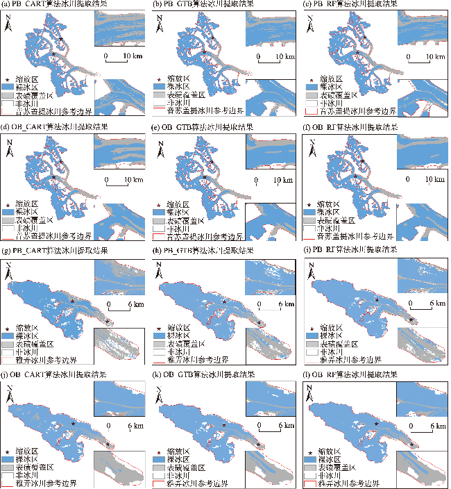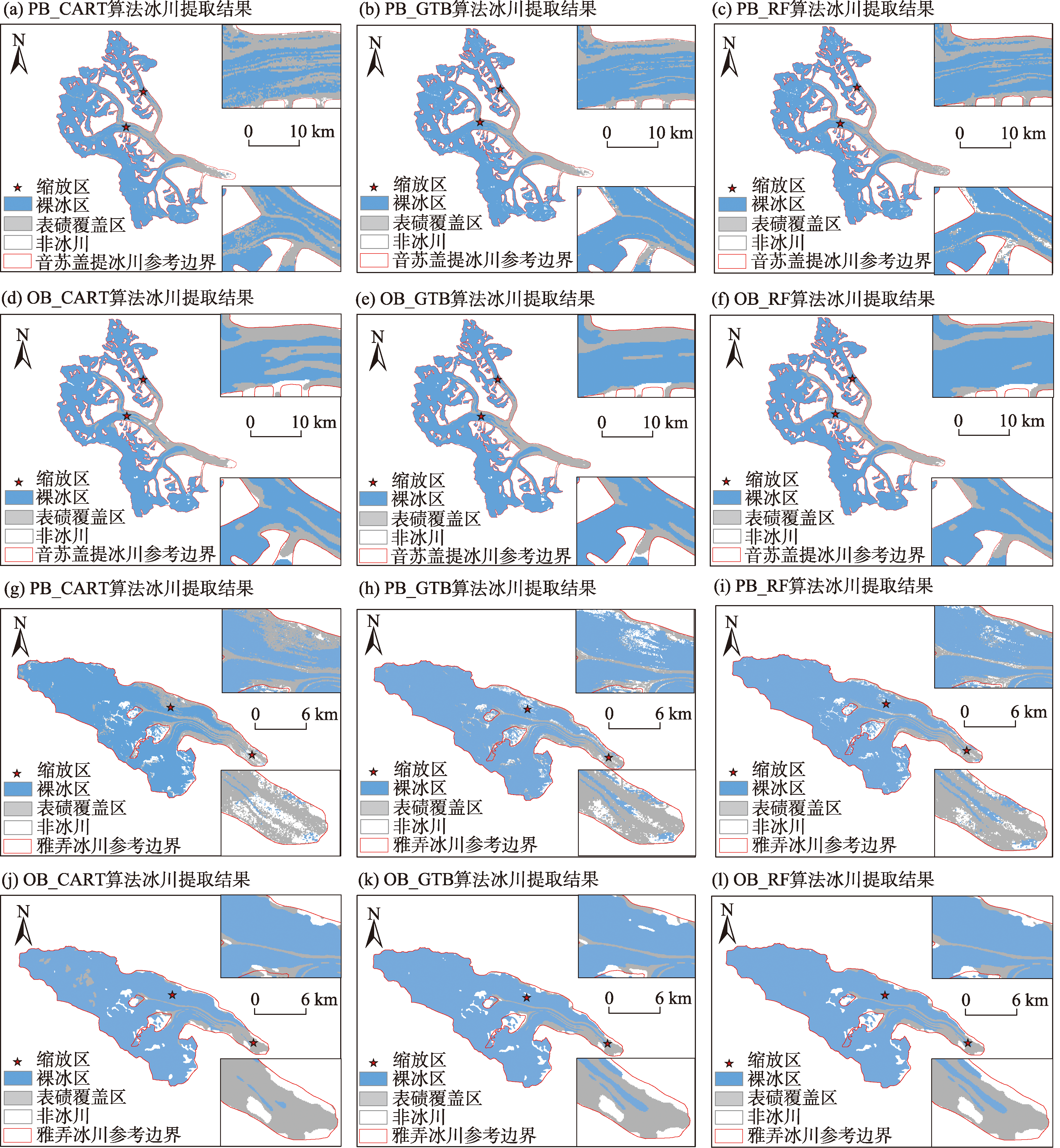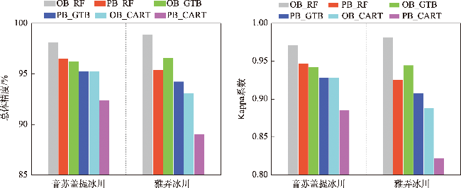 鉴于像素级分类在光谱特征相近情况下难以准确识别冰川变化,特别是表碛覆盖区的光谱特征与周围山地、岩石相似度高,导致其提取精度较低。为此,本文以音苏盖提冰川和雅弄冰川为研究区,基于Google Earth Engine平台,结合光谱指数、微波纹理和地形特征,采用面向对象(OB)的机器学习算法进行冰川自动提取,并与基于像素(PB)分类方法进行对比。 结果表明:(1) 基于多特征融合的OB分类方法有助于提高冰川提取精度。其中,OB_RF分类的总体精度、Kappa系数和F1分数分别为98.1%、0.97和98.67%,优于OB_CART和OB_GTB方法。与PB_RF分类相比,总体精度、Kappa系数和F1分数分别提升了1.7%、0.024和5.57%。(2) 2001—2022年音苏盖提冰川和雅弄冰川年平均退缩率分别为0.08%、0.13%。(3) 音苏盖提冰川表碛区主要分布在海拔5000 m以下,而雅弄冰川表碛区主要分布在海拔4800 m以下,2001—2022年两条冰川表碛覆盖区均呈现向上扩张趋势。