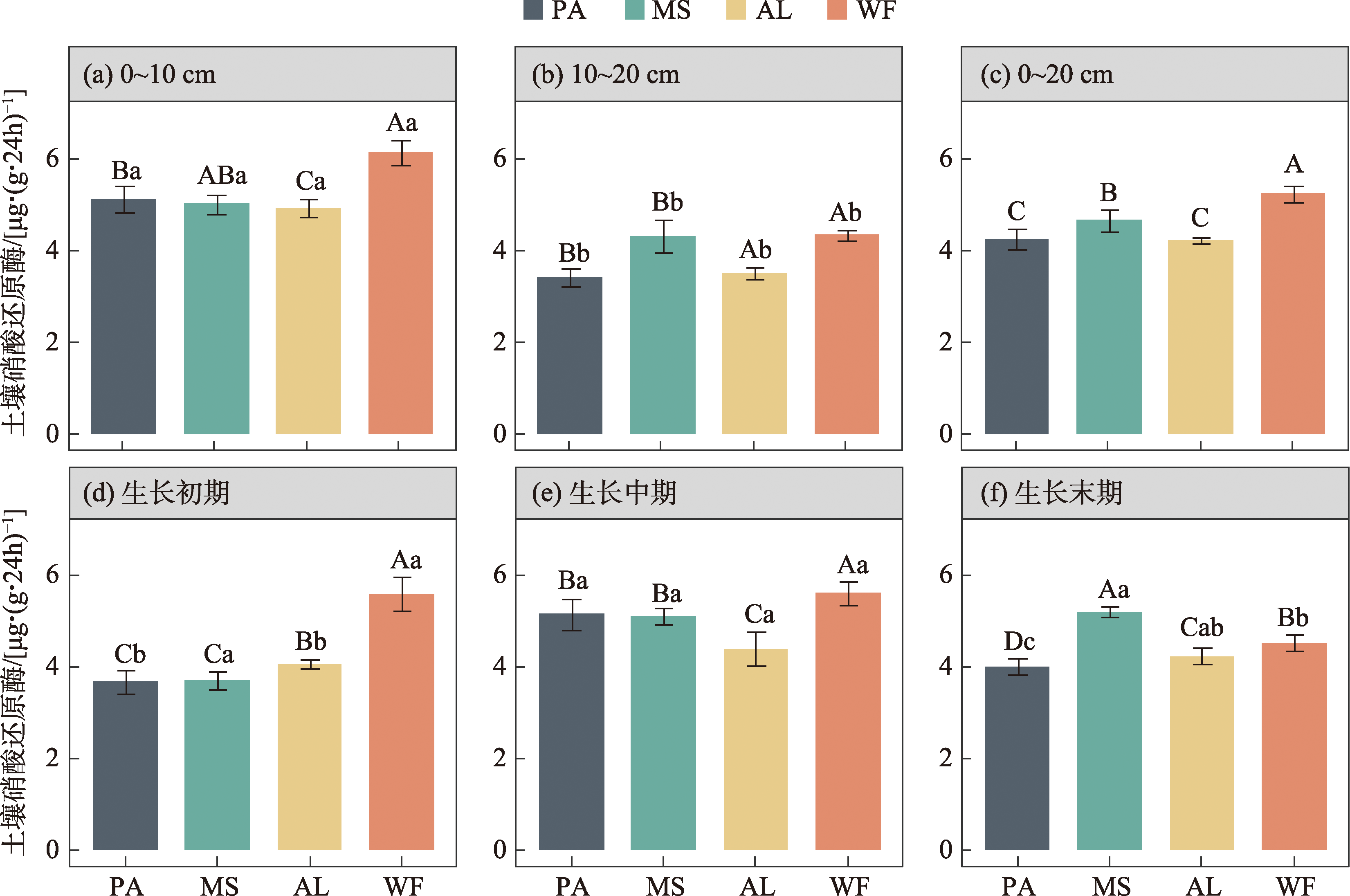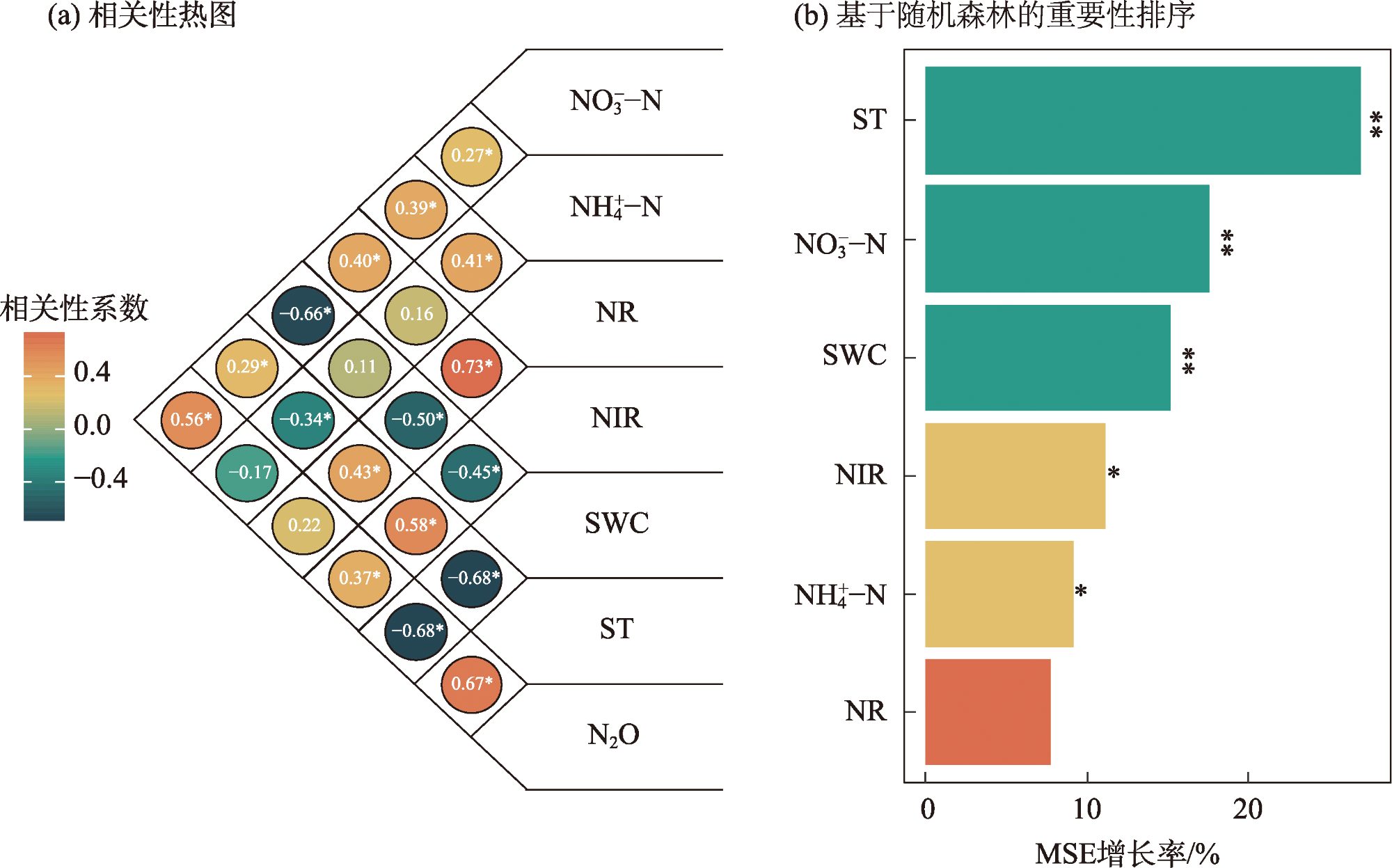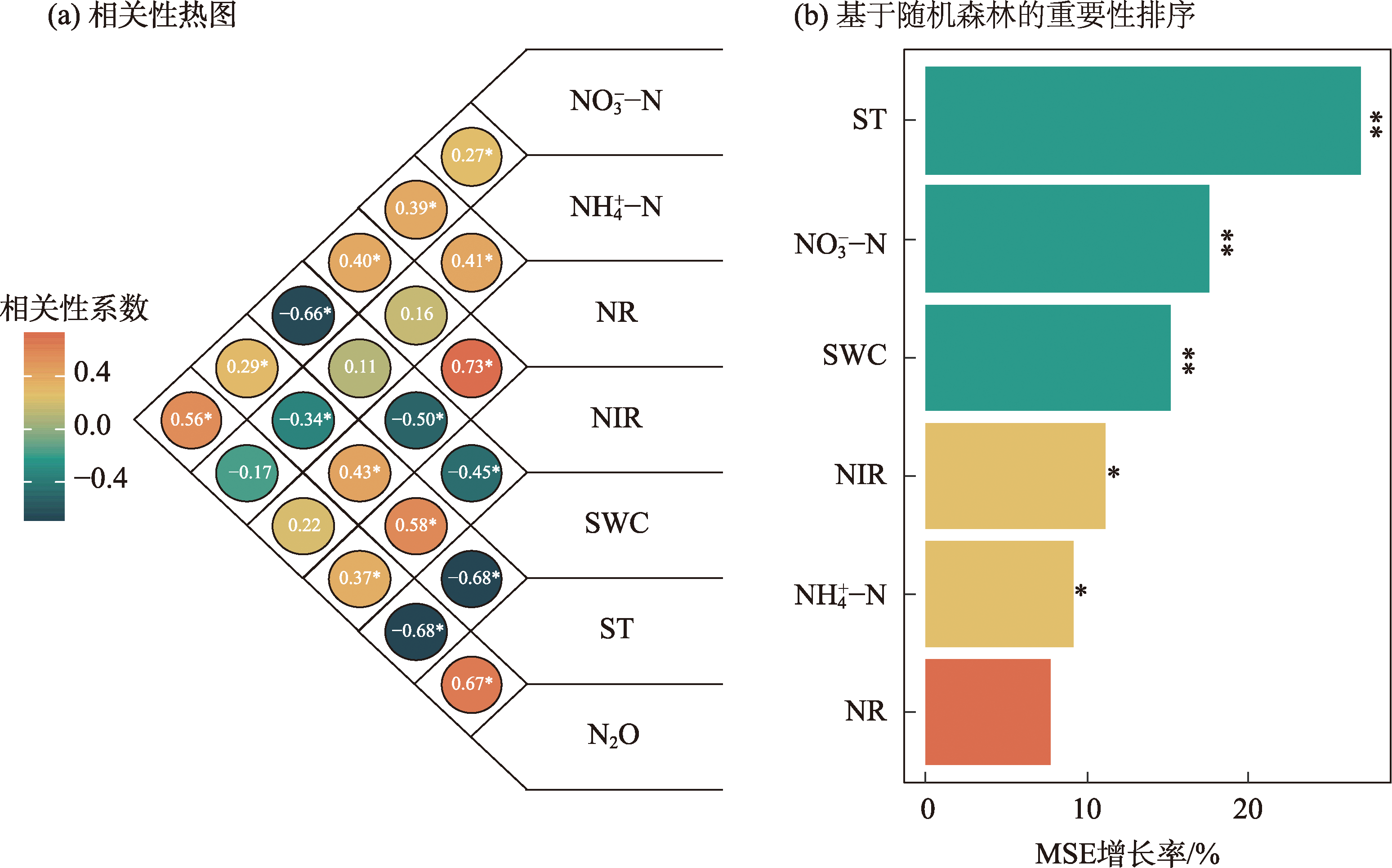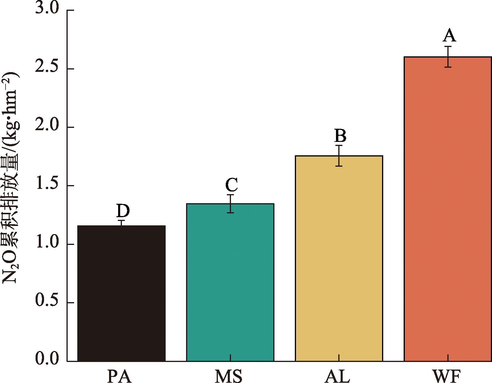 氧化亚氮(N2O)是大气中重要的温室气体之一,对全球气候变暖具有显著影响。土地利用方式的改变是影响N2O排放的关键因素,尤其是在生态系统脆弱的半干旱地区,其影响机制更为复杂。然而,针对我国半干旱区复杂多样的土地利用方式如何影响土壤N2O排放,其中影响N2O排放的关键驱动因子,目前尚缺乏系统研究。为此,本文以陇中黄土高原四种典型土地利用方式:云杉林地(Picea asperata)、苜蓿草地(Medicago sativa)、撂荒地(Abandoned land)、小麦地(Wheat field)为研究对象,采用静态箱-气相色谱法监测土壤N2O通量,结合土壤理化性质数据,揭示不同土地利用方式下调控土壤N2O排放的关键驱动因子。 结果表明:(1) 与撂荒地相比,云杉林地和苜蓿草地显著提高了土壤含水量,而小麦地则增加了铵态氮(NH4+-N)和硝态氮(NO3--N)的含量。(2) 与撂荒地相比,苜蓿草地和小麦地显著提升了硝酸还原酶(NR)和亚硝酸还原酶(NIR)活性,且各处理的NR和NIR活性均随土层加深而降低。(3) 在不同土地利用方式下,土壤N2O通量随植被生长阶段呈先增后降的趋势。相较于撂荒地,云杉林地和苜蓿草地的土壤N2O总排放量分别减少了34.2%、23.3%,而小麦地则显著增加了32.47%。(4) 随机森林结果表明,土壤温度对土壤N2O排放通量的影响最大。相较于撂荒地和小麦地,人工林地和草地表现出更好的减排效应。在未来的植被恢复和生态修复过程中,应注重“农林草”土地利用方式的分配比例,适当提高人工林地和草地的占比,以实现生态效益与减排效应的双重目标。