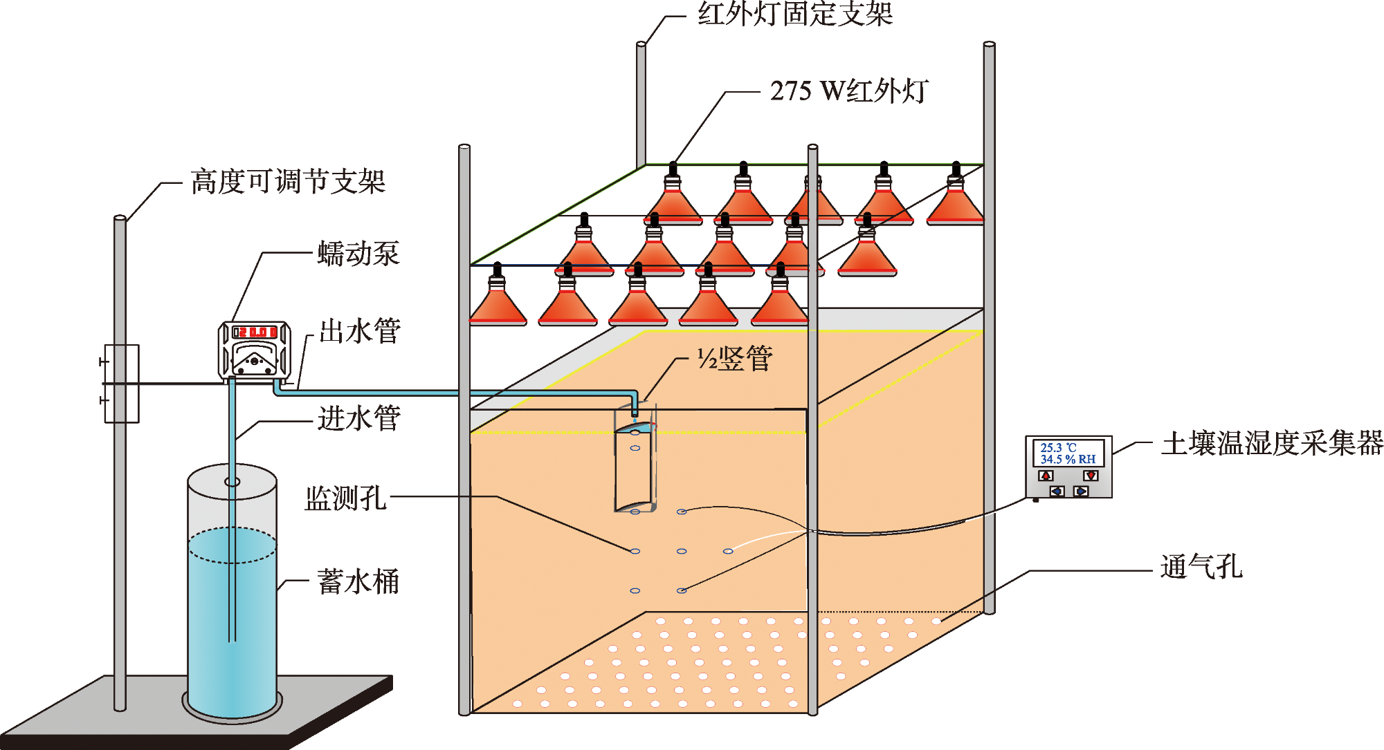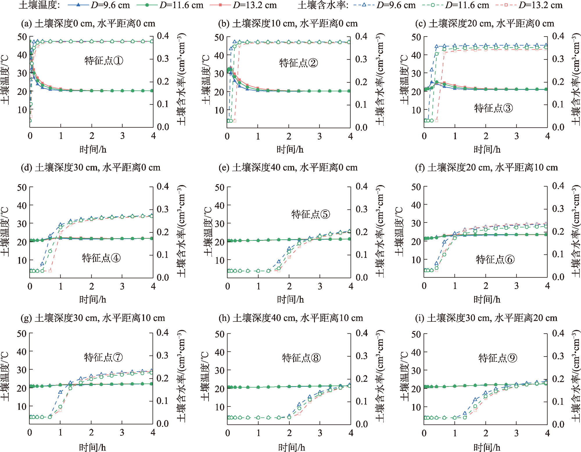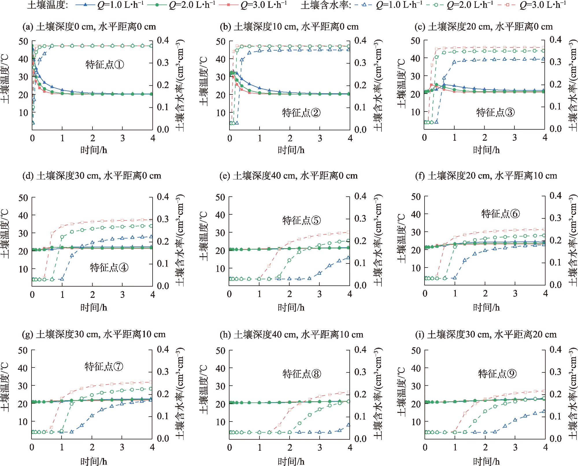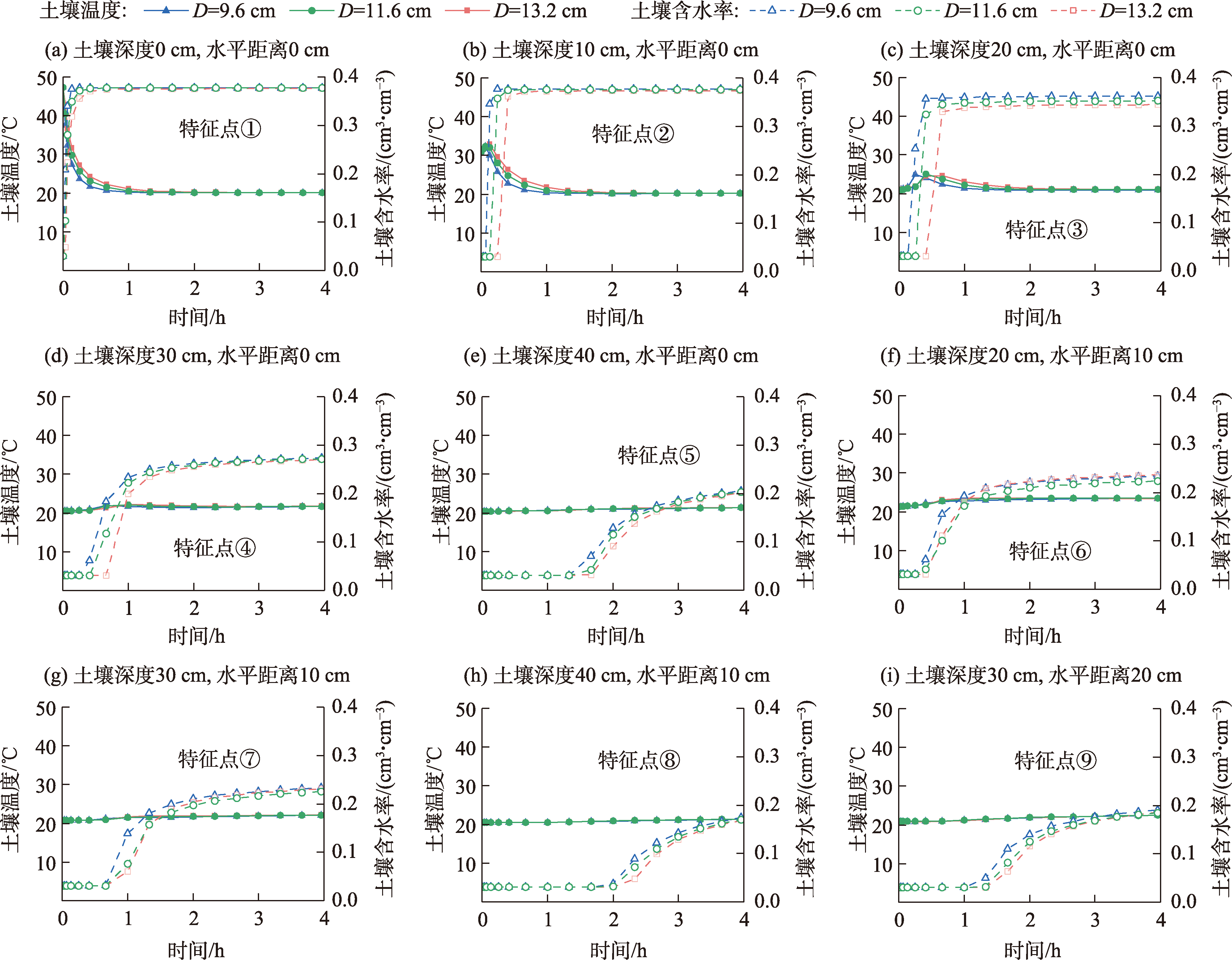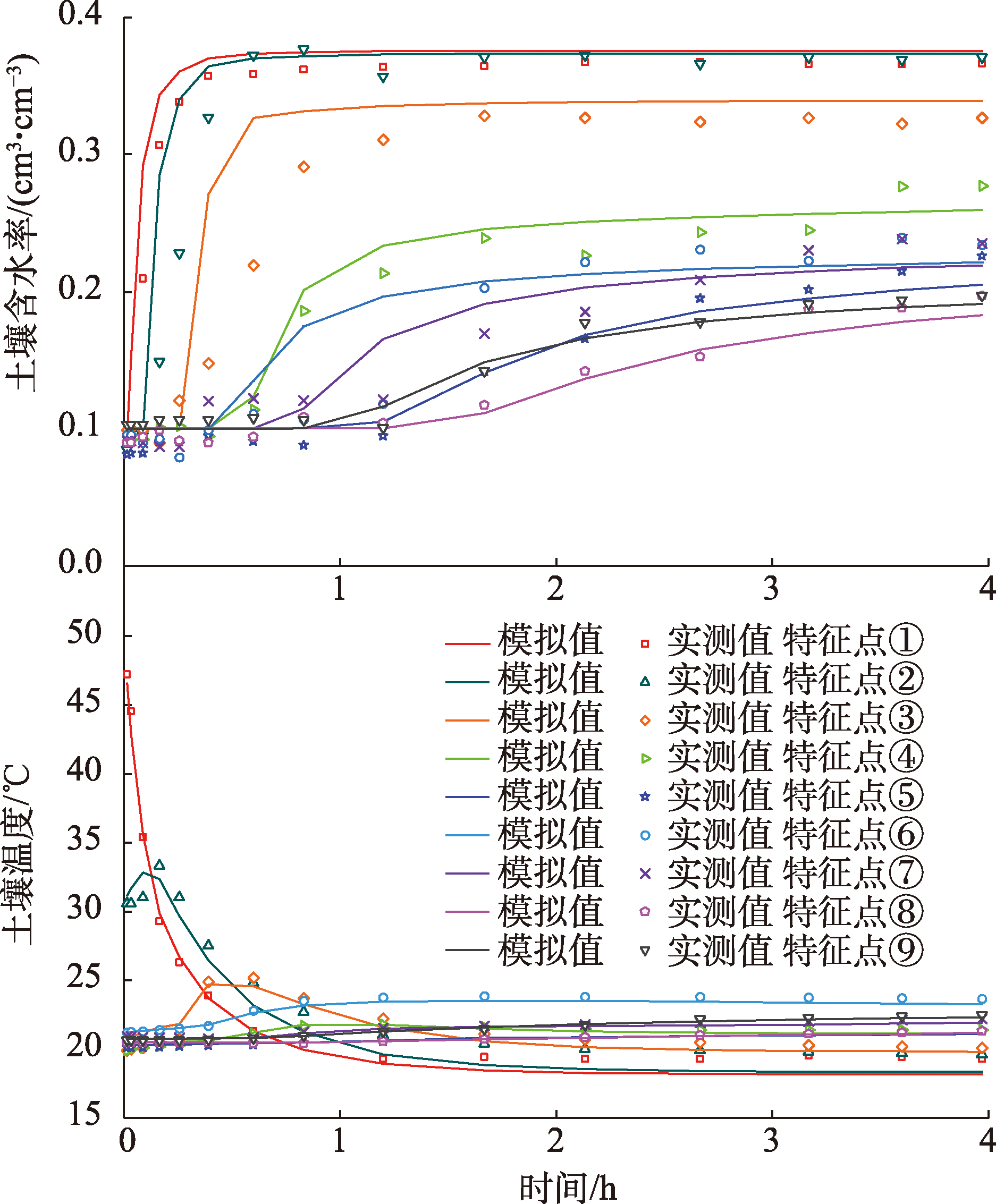 在沙漠环境中实施植物固沙工程,土壤水热状况是影响固沙植物健康生长的关键因素。竖管地表滴灌是为缓解土壤干旱和地表高温对固沙植物幼苗的复合胁迫而提出的一种节水控温保育新技术,其土壤水热分布及迁移状况尚不清晰,推广应用到植物固沙区缺乏理论基础。为探明竖管地表滴灌模式下灌溉参数(滴头流量和灌溉水温)和竖管参数(竖管直径和竖管埋深)对土壤水热分布及迁移状况的影响,基于HYDRUS-2D软件,构建了竖管地表滴灌土壤水热迁移数学模型,通过室内试验,验证了所建模型及其求解方法的可靠性。在此基础上,采用单因素分析法,考虑滴头流量(1、2、3 L·h-1)、灌溉水温(10、20、30 ℃)、竖管直径(9.6、11.6、13.2 cm)及竖管埋深(15、20、25 cm)4个影响因素,设计9组模拟方案,获得竖管地表滴灌不同影响参数组合下的土壤水热分布特征及迁移规律。 结果表明:(1) 整个灌水过程湿润体内取9个有代表性的点位,其土壤水热变化均是通过以水调温实现的水热耦合,灌水初期竖管内土壤水热动态变化最为明显,尤其是管内地表层;随着灌水时间的延长,管内土壤水热状况逐渐稳定,水分通过管底孔向四周渗透,管外各点位土壤水分快速增加并趋于稳定,而温度则受灌溉水温的影响而略有增减。(2) 滴灌期间竖管直径对土壤水热状况的影响不显著,竖管埋深主要是影响土壤的水分状况,对土壤热环境的影响也不明显。不同竖管埋深情况下管外土壤湿润体水分分布以管底为分界线,其上部同一点位处的土壤含水率随埋深的增大而减小,其下部同一点位处的土壤含水率则随埋深的增大而增大。(3) 滴头流量对土壤温度分布的影响相对有限,但其是影响土壤水分状况的关键参数,滴头流量越大,管外同一点位处的土壤含水率越高。(4) 灌溉水温对土壤水分分布的影响相对微弱,但其是影响土壤温度状况的直接因素,灌溉水温越高,管内外同一点位处的土壤温度越高。(5) 在竖管直径和埋深固定难以调整的情况下,通过调整滴头流量和灌溉水温,可有效实现根区土壤水热调控。该研究可为固沙植物竖管地表滴灌工程设计、运行和管理提供科学依据。