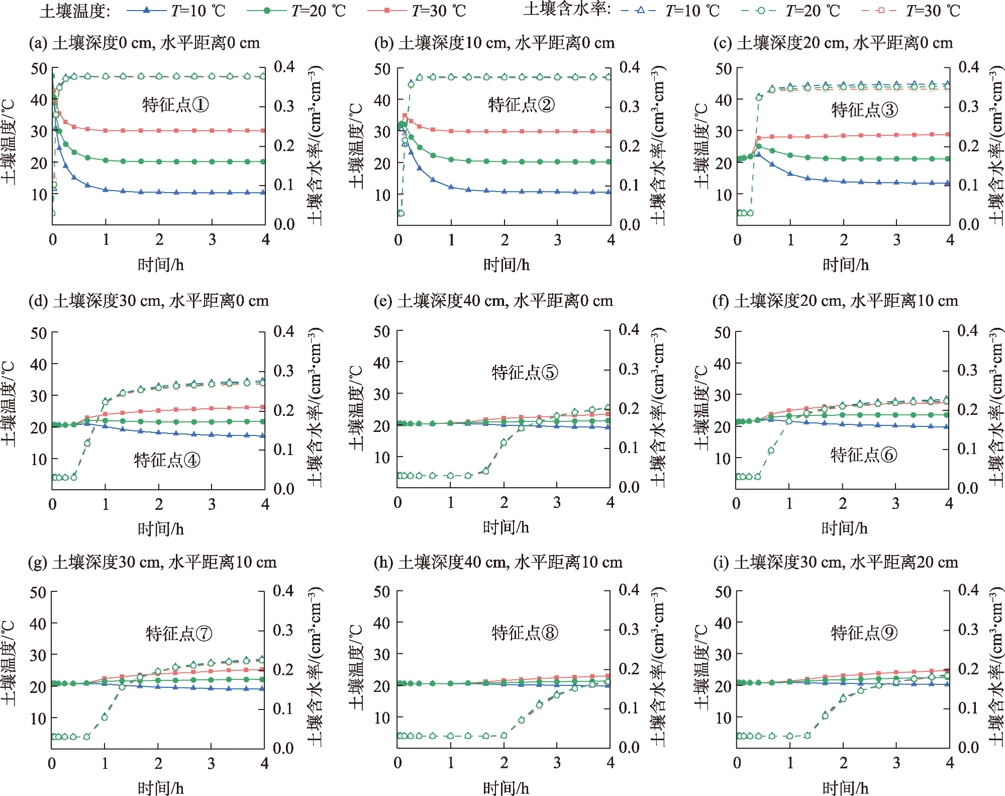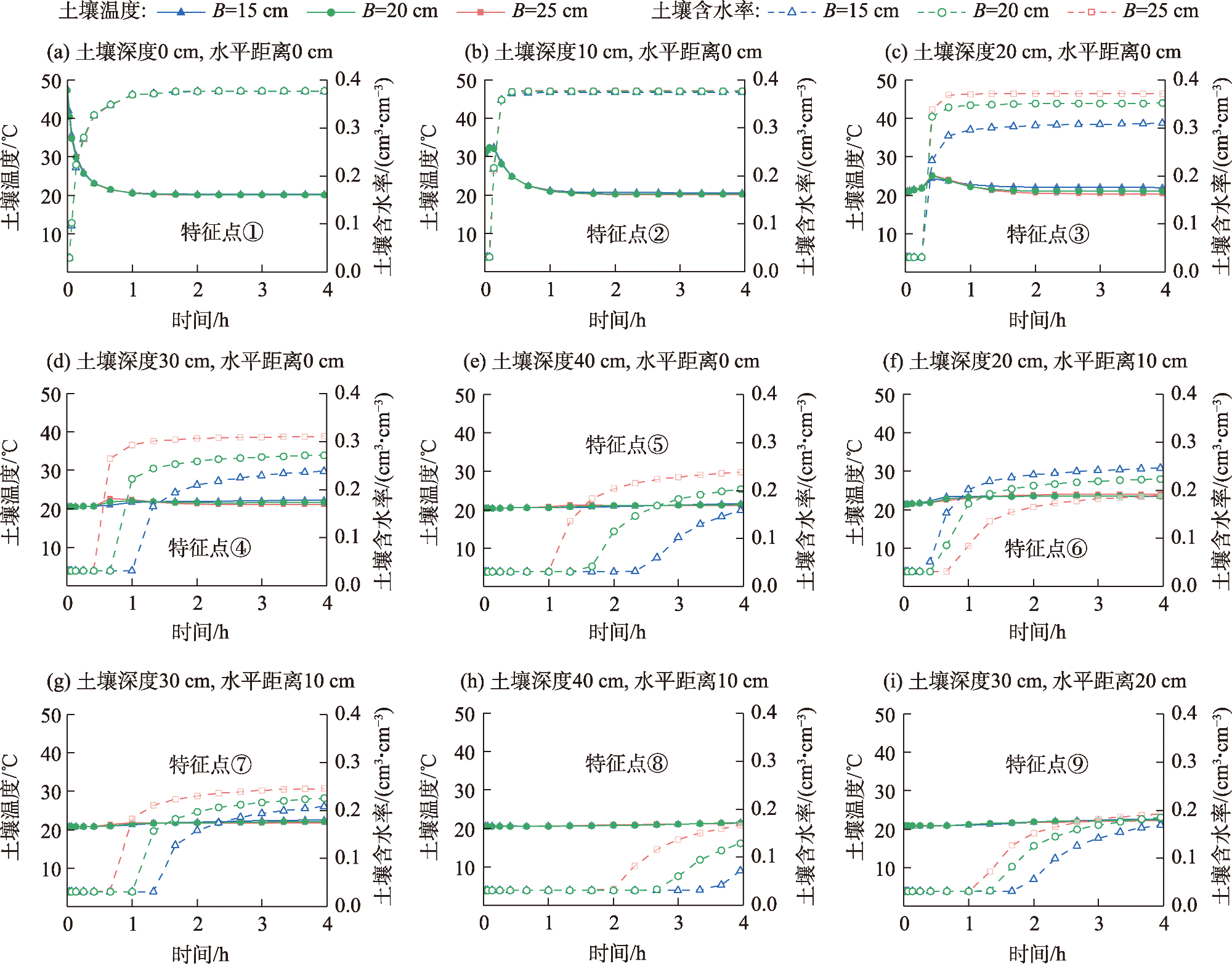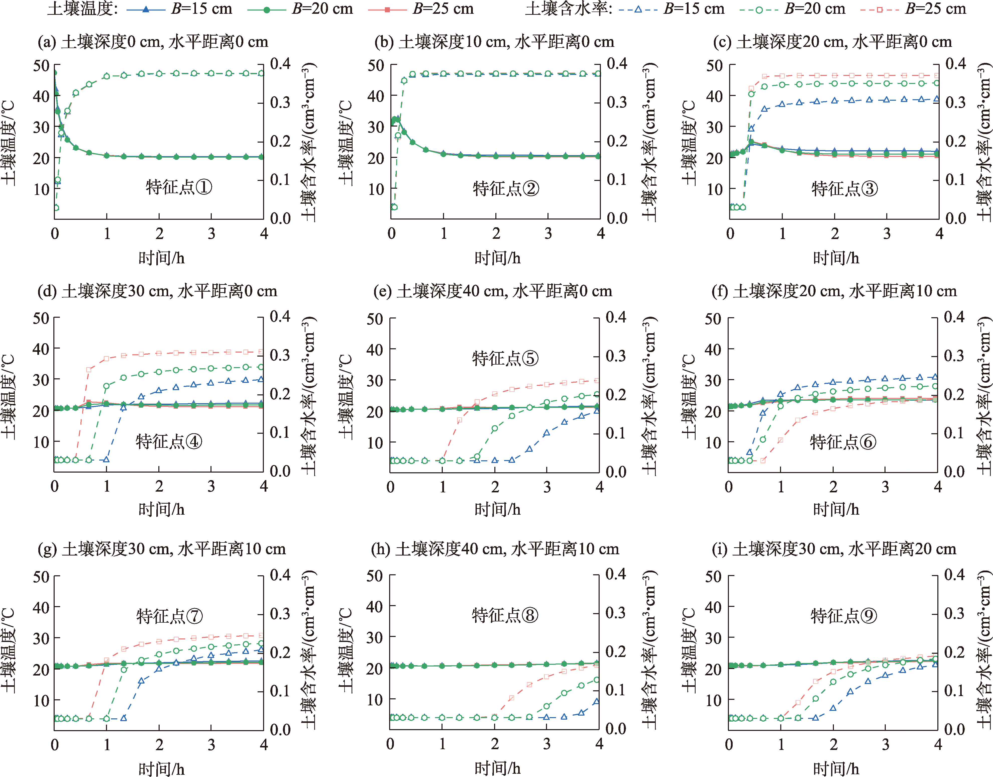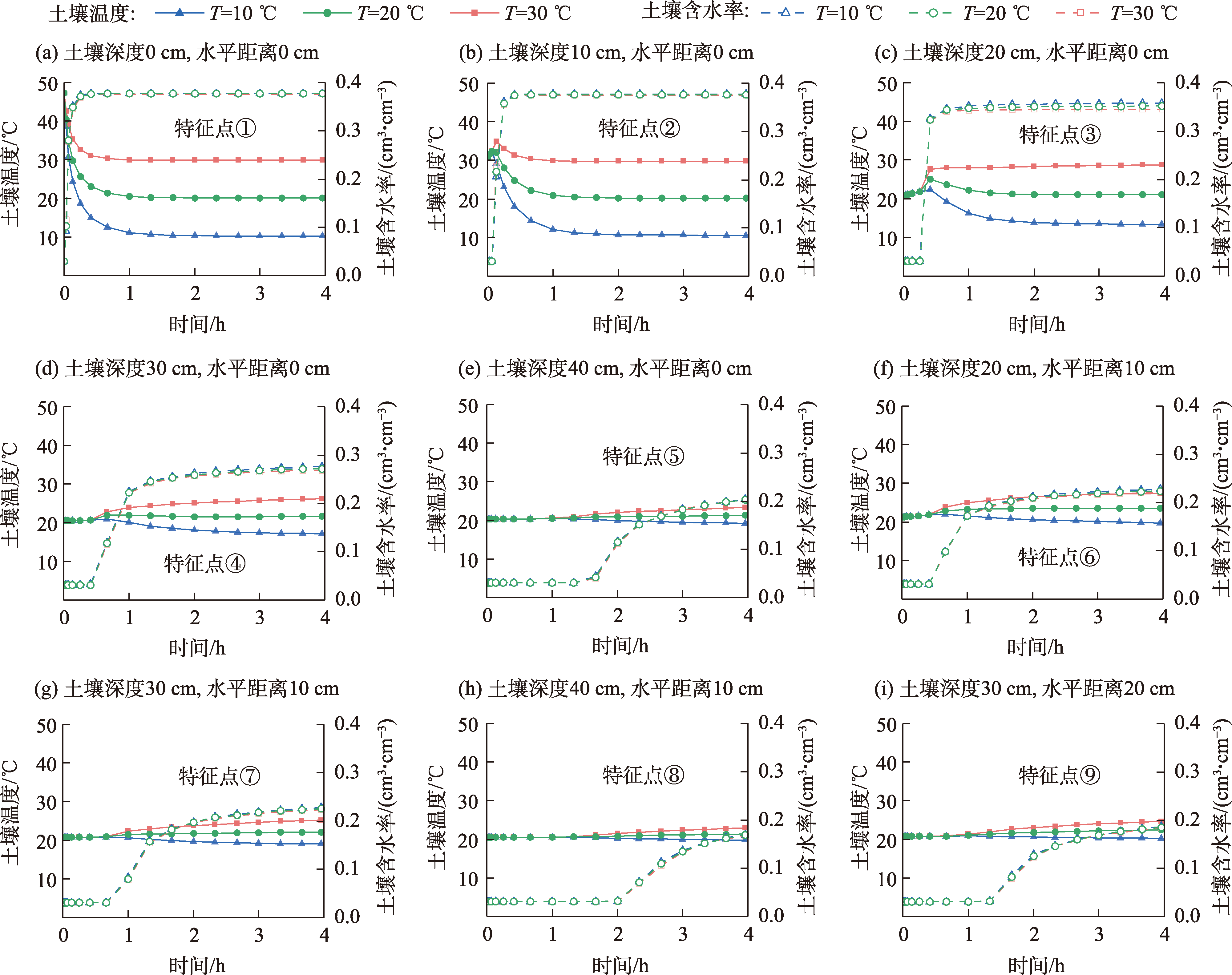 注:θr为土壤残余含水率;θs为土壤饱和含水率;α为进气值倒数;n为土壤物理特性有关的拟合参数;Ks为土壤饱和导水率;Solid为土壤固相占总体积的比率;Org为有机质占总体积的比率;DL为土壤纵向热扩散率;DT为土壤横向热扩散率;b1、b2、b3为热导率函数中系数;Cn为土壤固相的热容;Co为土壤有机质的热容;Cw为土壤液相的热容。 |