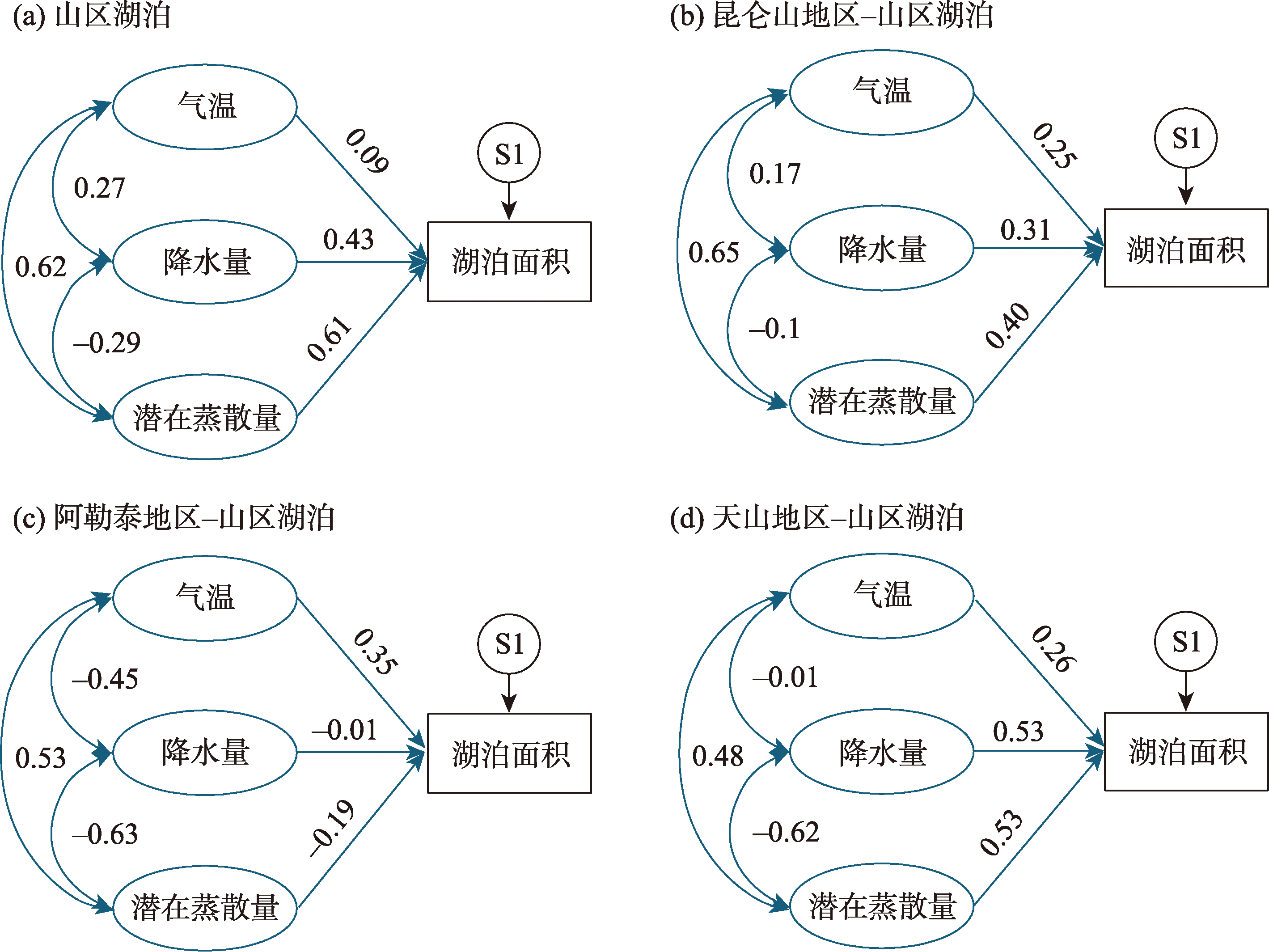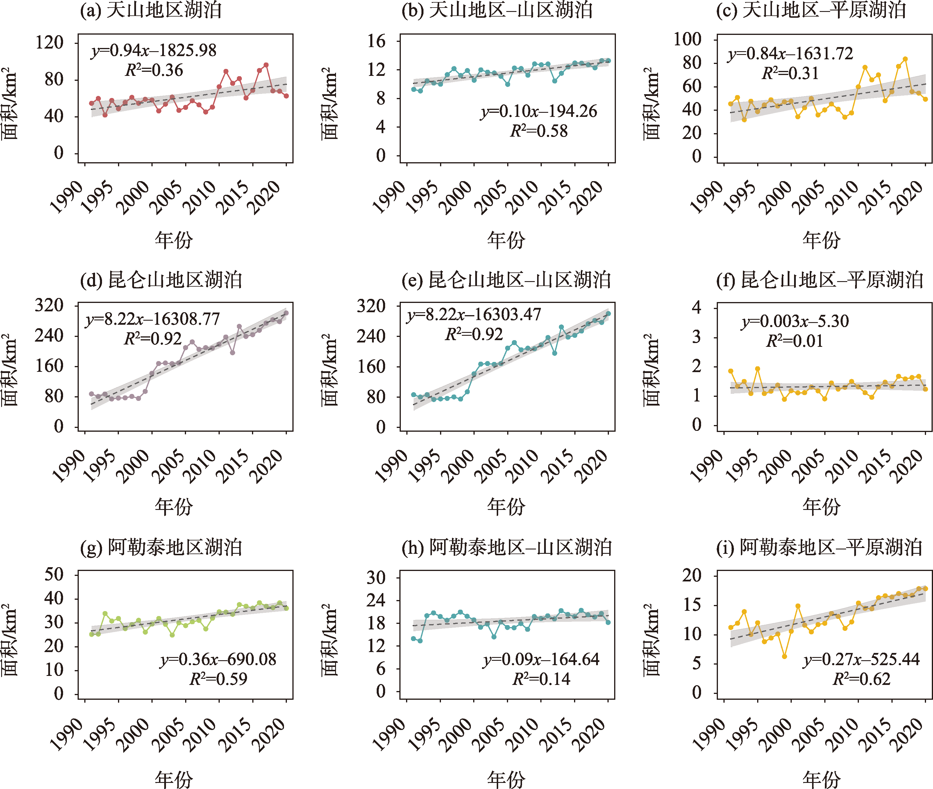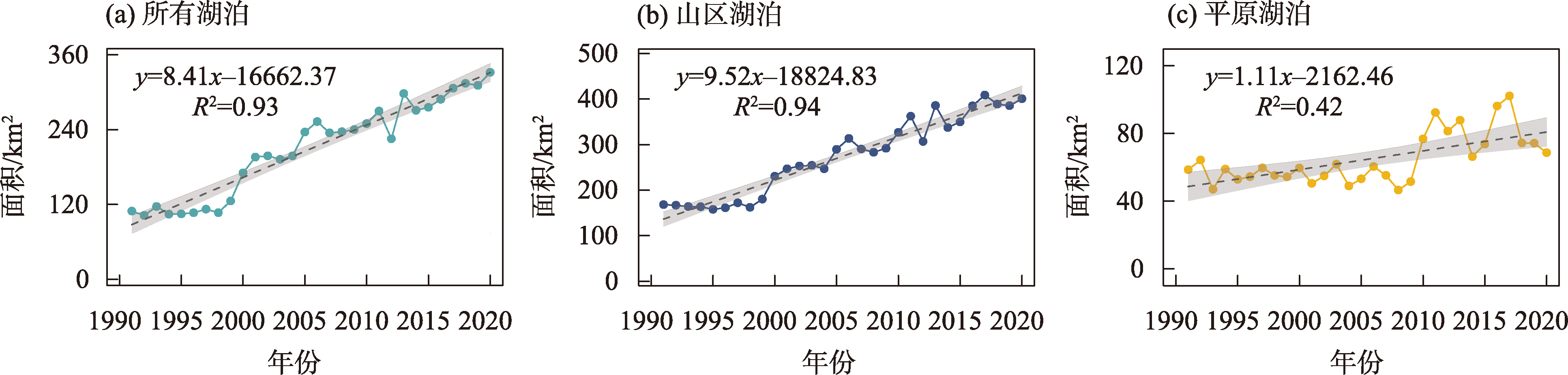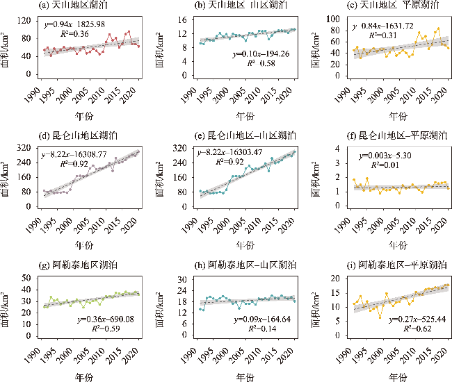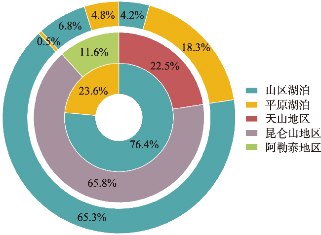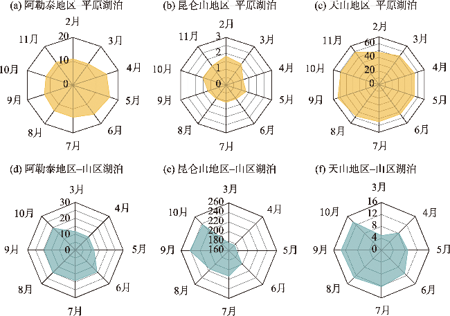 湖泊作为陆地生态系统中的关键组成部分,是区域经济发展和生态安全的重要保障。本研究分析了1991—2020年间新疆地区74个中小湖泊的面积动态,对不同海拔和地理特征的湖泊进行了综合分析。研究发现,1991—2020年间,新疆湖泊总面积从167.98 km2增加至400.51 km2,尤以山区湖泊面积增长最为显著。月度尺度分析山区湖泊面积变化具有明显的季节性特征。统计分析显示,新疆不同海拔的湖泊对气候变化的响应各异。新疆山区湖泊面积显著扩大,主要受气候变化的影响,尤其是年均温度上升。在平原湖泊区域,人类活动(特别是灌溉)是湖泊面积变化的主要驱动因素,而气候因素的影响则相对较小。