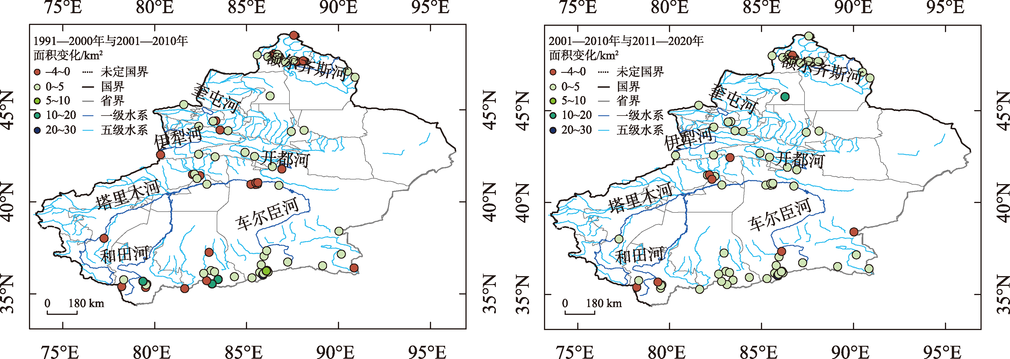 图5 1991—2020年新疆74个中小湖泊不同海拔梯度的面积变化Fig. 5 Area change of 74 small and medium-sized lakes in Xinjiang from 1991 to 2020 across different altitudes |