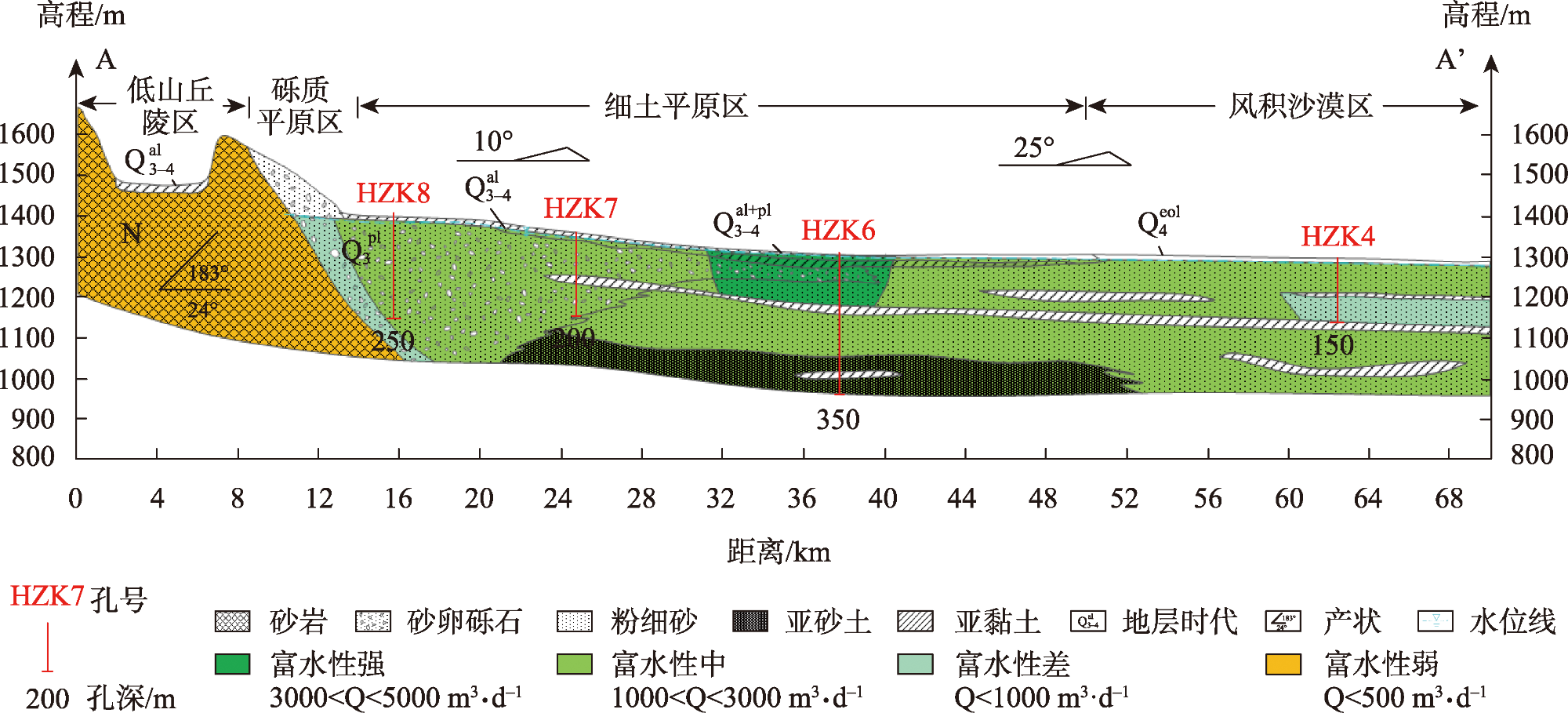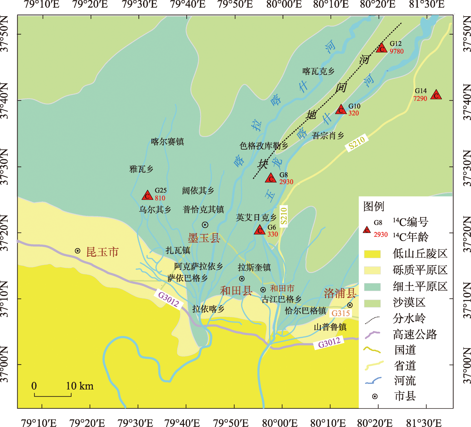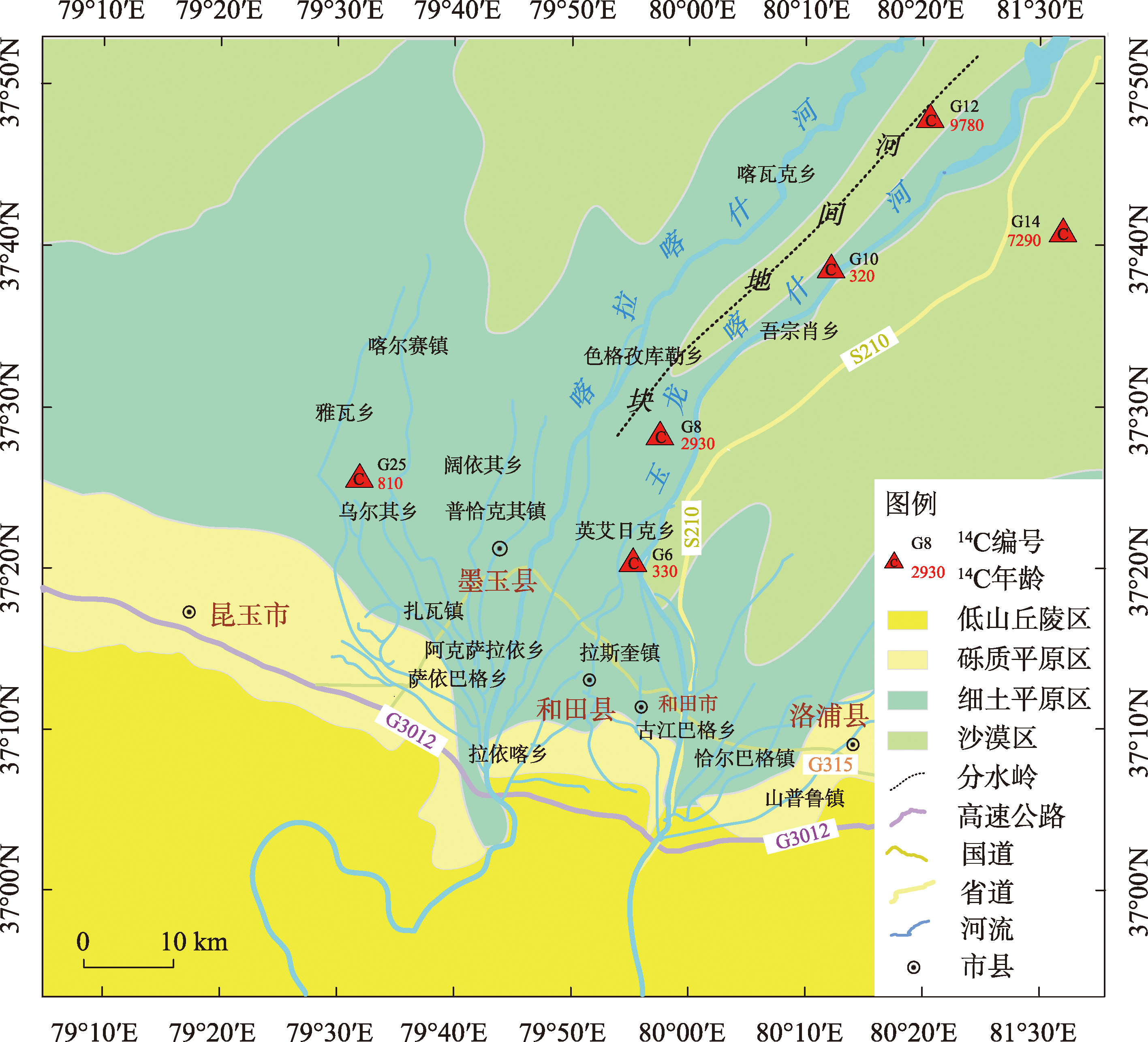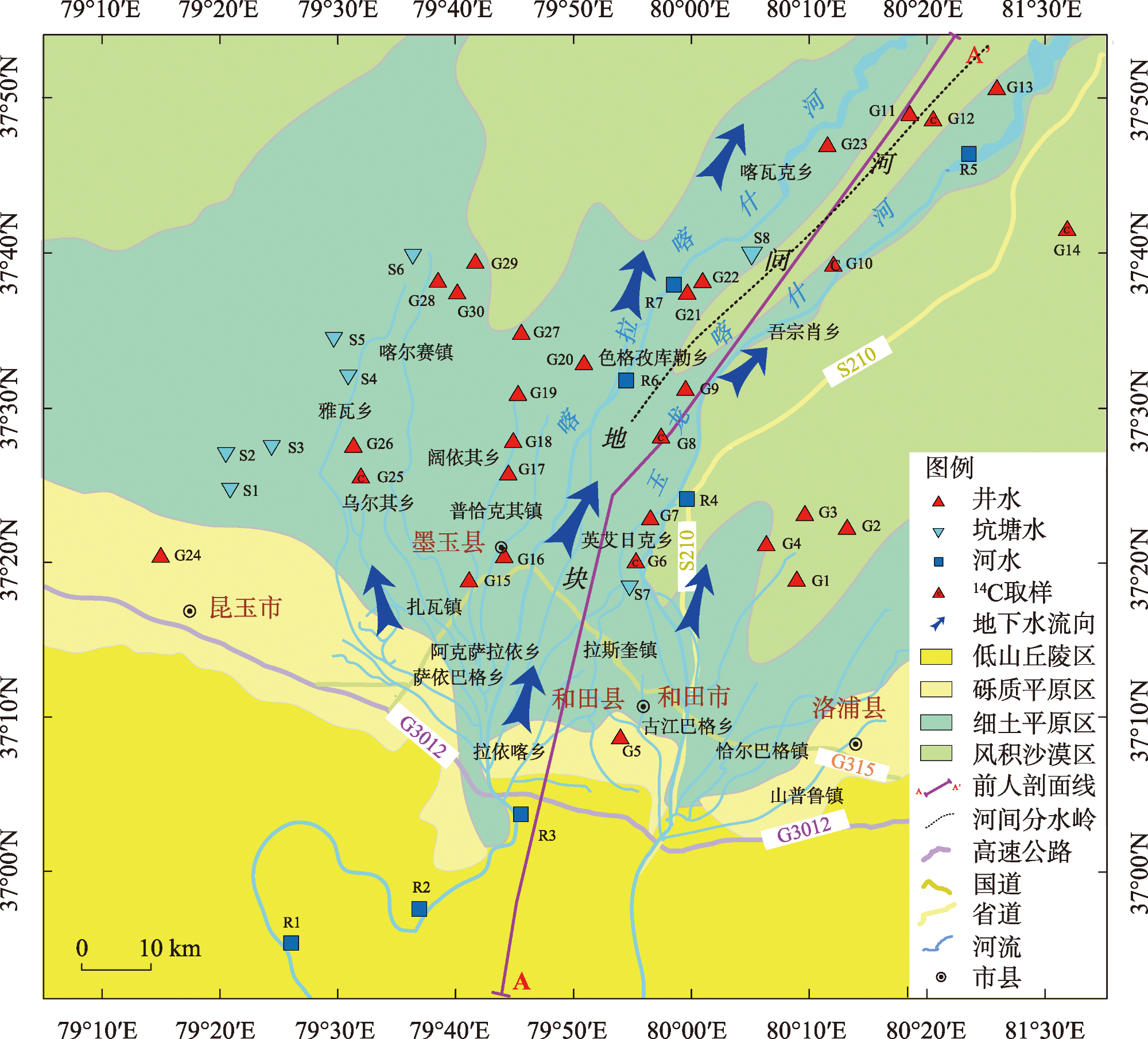 为研究和田河流域水化学与地下水补给特征,采用SPSS数理统计分析、Piper三线图、Gibbs图解以及氢氧和14C同位素示踪等方法对不同地貌单元中的水体(井水、坑塘水和河水)进行了水化学组成特征、补给来源和转化关系分析。结果表明:(1) 各水体主要起源于南部海拔2000 m以上的中高山区冰雪融水和大气降水。从山区到沙漠区,地下水水化学类型具有较明显的分带特征。不同水体pH值均呈弱碱性,离子之间组分和TDS值差异较大,整体呈坑塘水>井水>河水的规律。少数地下水样点中NO3-含量显著异常。(2) 砾质平原区地下水大量接受地表河水的垂向脱节型补给。地下水溶解性总固体(TDS)值小,更新速度快,以水岩溶滤控制作用为主,水化学类型多呈SO4·Cl-Ca·Mg型。(3) 细土平原区地下水TDS值变幅大,多为Cl·SO4-Na型。其中,河间地块内,靠近上游地下水接受地表水及邻区侧向径流补给,14C年龄小;中下游地区地下水氢氧同位素“氧漂移”现象普遍。分水岭处地下水14C年龄大,近河岸处年龄小,地下水与河水联系密切。河间地块两侧地下水分别沿东北、西北方向径流,最终排泄于外围沙漠区。研究结果可为和田河流域水资源合理开发利用和生态环境保护提供科学理论依据。