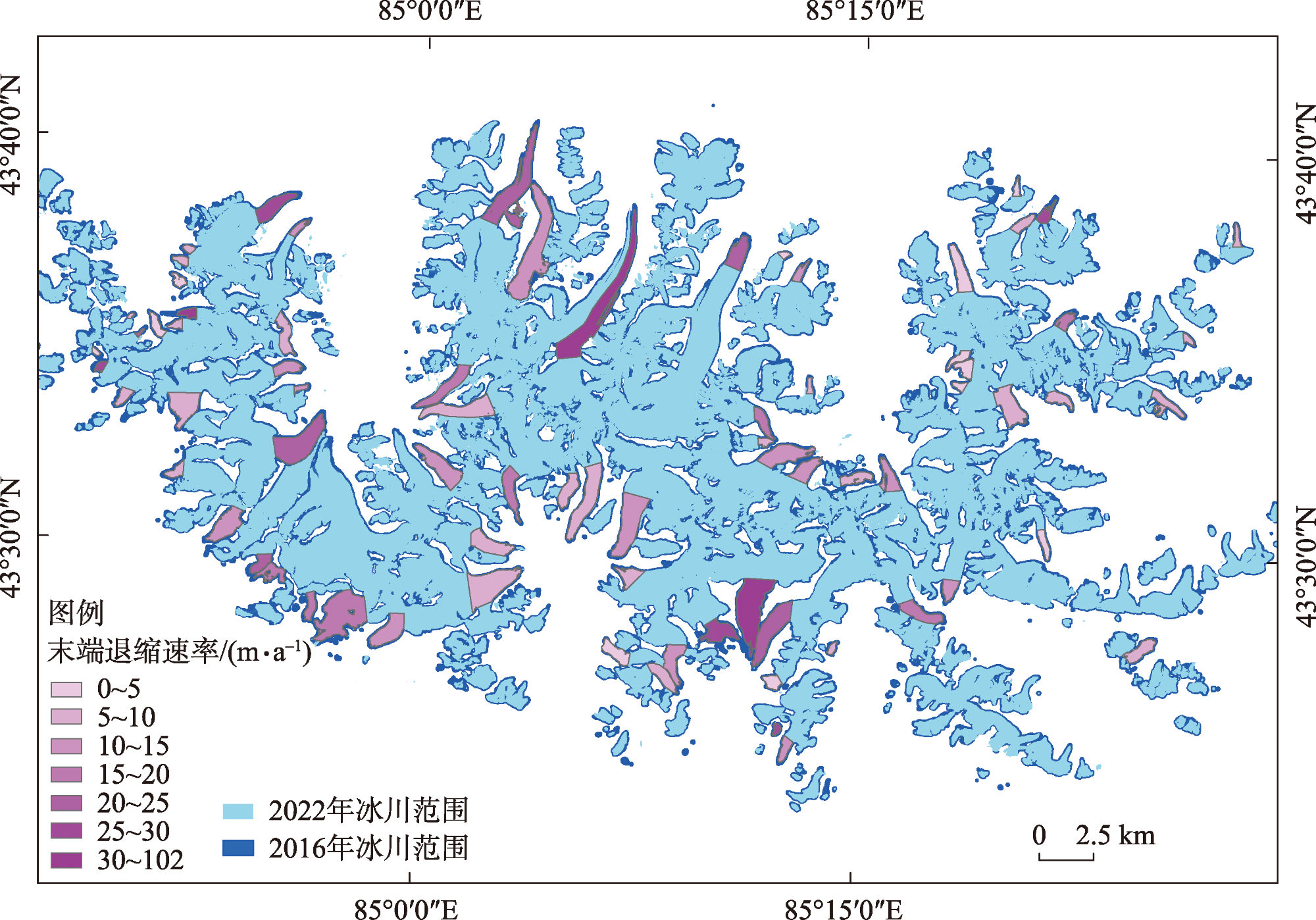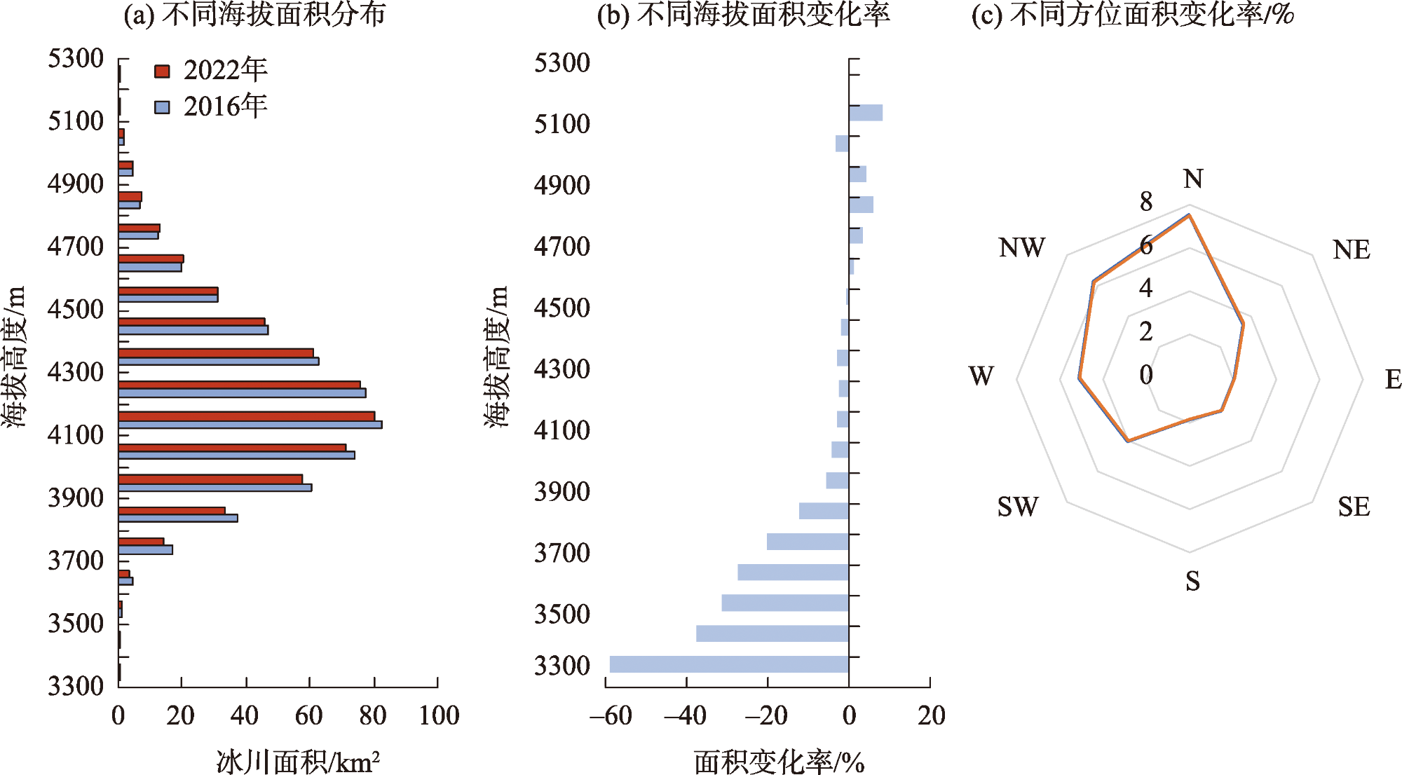 高分时序遥感对于监测冰川变化具有重要作用。本文利用2016—2022年Sentinel-2多时相卫星影像和D-UNet语义分割模型提取依连哈比尔尕冰川变化信息,并与时相相近的Landsat遥感数据的提取结果对比,比较Sentinel-2和Landsat在冰川制图的精度差异,在此基础上选择75条典型冰川分析近期研究区冰川总面积和冰川末端的变化特征。结果表明:(1) Sentinel-2冰川制图总体精度为95.0%,相同条件下比Landsat-8提高5%~10%。(2) 2016—2022年研究区冰川年平均面积退缩率为0.75%±0.69%,其中,海拔4600 m以下的区域为冰川面积减少的区域,海拔越低面积退缩率越大。(3) 近6 a 75条典型冰川末端的平均高度上升了17.75 m,长度平均退缩了11.39±2.36 m·a-1,其中,偏西、东北和南的退缩最为显著,分别为15.49±2.36 m·a-1、13.95±2.36 m·a-1和13.14±2.36 m·a-1,冰川末端退缩速率随海拔的升高而降低。