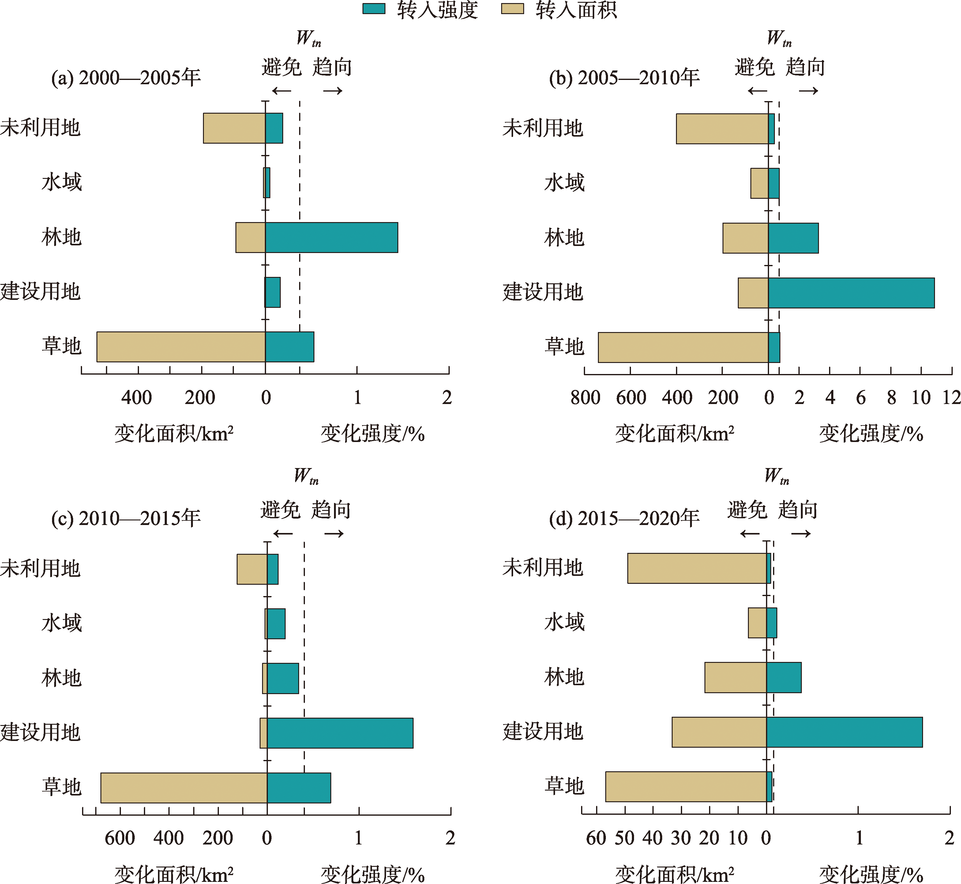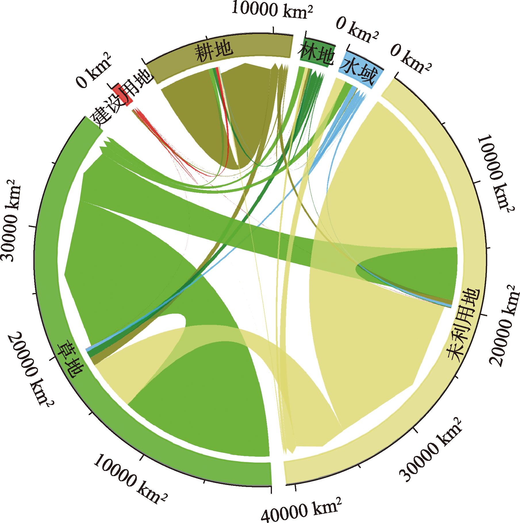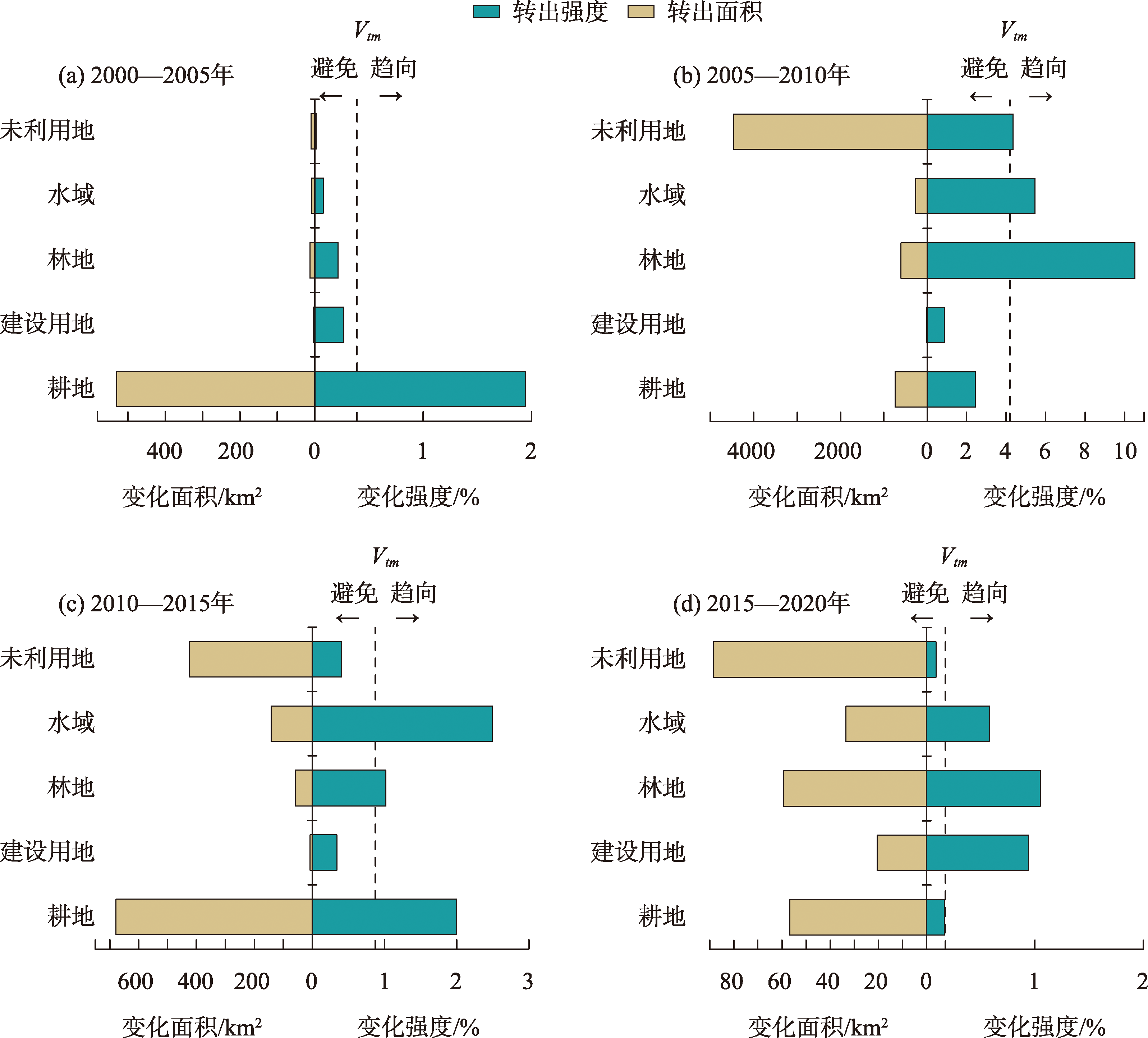 | 土地利用类型 | 2000—2005年 | 2005—2010年 | 2010—2015年 | 2015—2020年 | |||||||