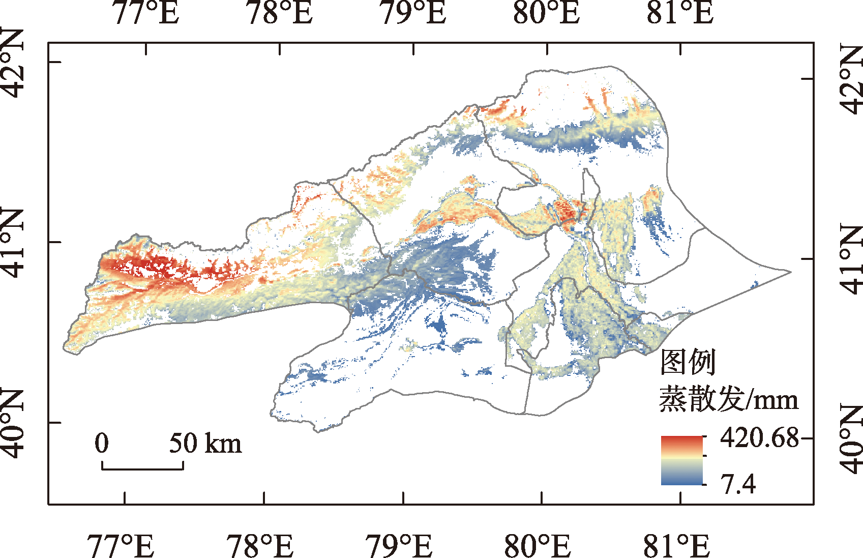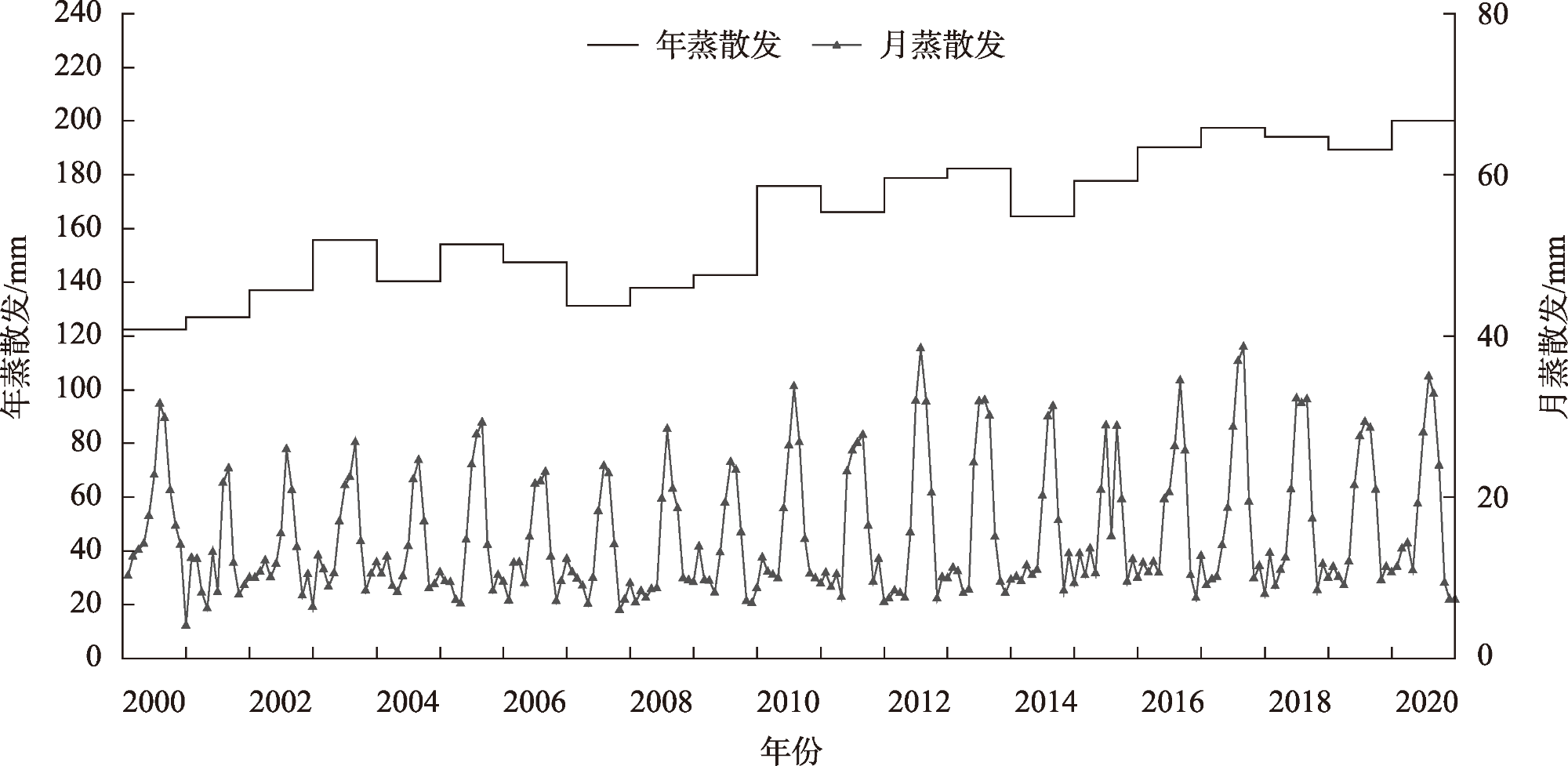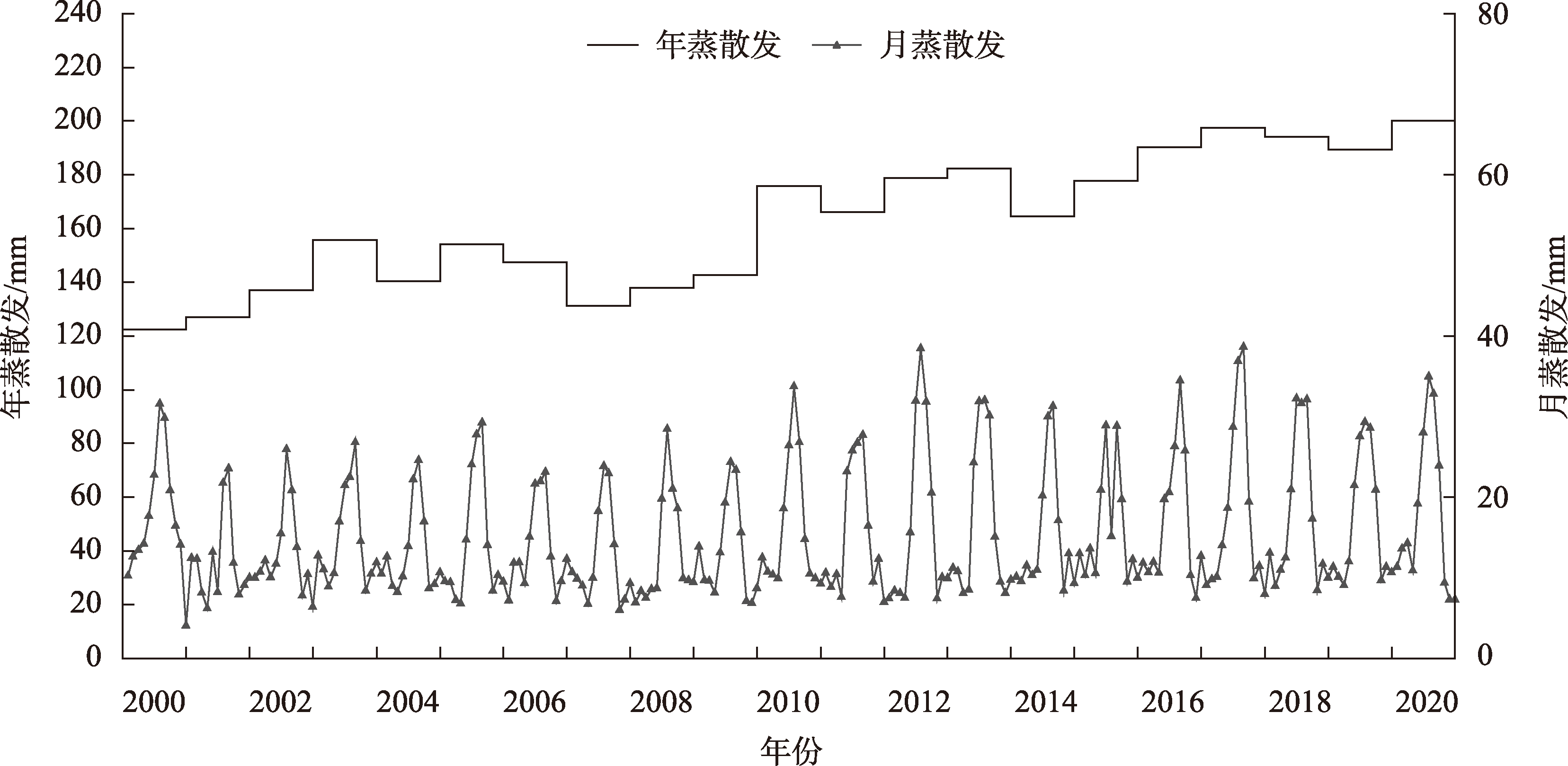 深入挖掘土地利用类型内部转换过程信息,衡量土地利用变化强度对蒸散发的影响,准确评估实际蒸散发时空变化规律对流域水资源科学管理和高效利用具有重要意义。基于强度分析模型揭示2000—2020年阿克苏河流域不同层次土地利用类型强度变化特征及对流域实际蒸散发的影响,结果表明:(1) 时间间隔层次上流域土地利用变化强度呈先增加后减小的趋势,2000—2005年变化最为活跃。地类层次上耕地、建设用地、水域、林地面积增减变化表现较为活跃。转移层次上耕地面积的增加主要来源于草地(占比54.31%)和未利用地(占比26.26%);(2) 流域多年平均蒸散发为166.56 mm。年际波动较大,整体呈增加趋势,年增长率为3.68 mm·a-1。年内4—10月蒸散发占全年蒸散发的71.76%。实际蒸散发高值区分布在山区林地和平原区耕地,低值区分布在山前荒漠区及绿洲与荒漠过渡带地区;(3) 主成分分析结果表明,阿克苏河流域实际蒸散发变化的驱动力为草地、耕地、未利用地的转化强度,土地利用变化强度与实际蒸散发之间的相关系数为0.87,二者存在较强的相关关系。