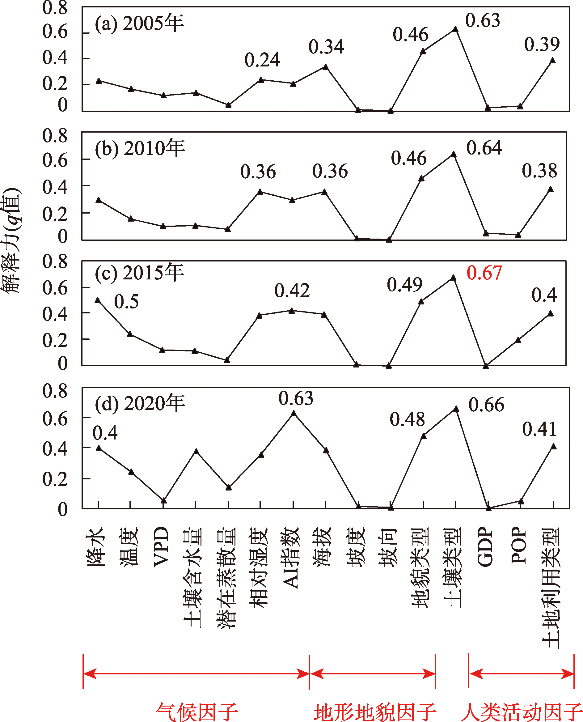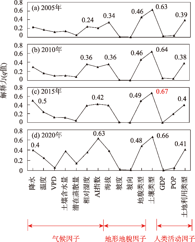 表1 GPP空间格局的因子交互解释力等级排序Tab. 1 Ranking of interaction explanatory power, 2005, 2010, 2015 and 2020 |