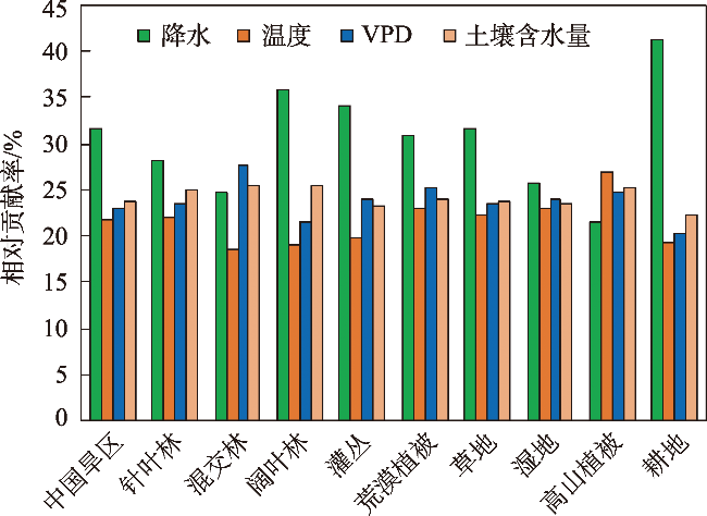 为明晰中国旱区生态系统的固碳能力及其变化机制,本研究根据AI指数划分了中国旱区范围,并基于MODIS植被总初级生产力(GPP)数据集,结合气温、降水、饱和水气压差(VPD)、土壤含水量等气象数据和土地利用等人类活动,探究了中国旱区2001—2020年植被固碳能力的时空演变特征及影响因素。结果表明:(1) 中国旱区GPP 20 a间呈增长趋势,其中,64.72%的区域GPP呈显著增长趋势;(2) 温度对GPP的影响最低,相对贡献率为21.70%,降水和土壤含水量是GPP增长的主导因子,二者贡献率总和超过55%。随干旱程度加剧,水分胁迫作用逐渐增强。不同植被类型下,除混交林和高山植被外,降水是影响其他植被类型GPP变化最重要的气候因子;(3) 土壤类型及地貌类型的差异是影响GPP空间分异的主导因子,水分、土地利用类型因素也有重要作用,任意两要素间的交互作用解释力均大于单一要素的解释力,以土壤类型与其他各因子的交互作用最为显著。研究结果对深入理解我国旱区生态系统碳汇演变特征及其对外界环境因子响应机制具有重要理论意义。