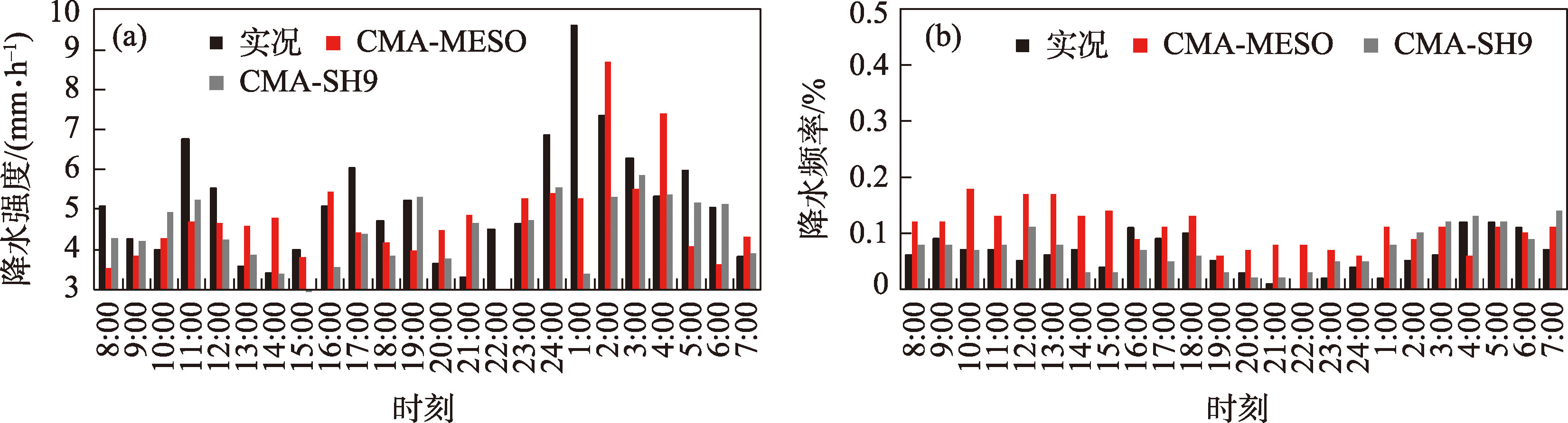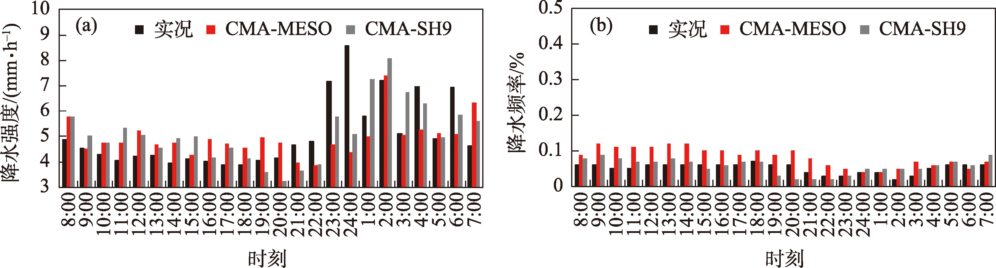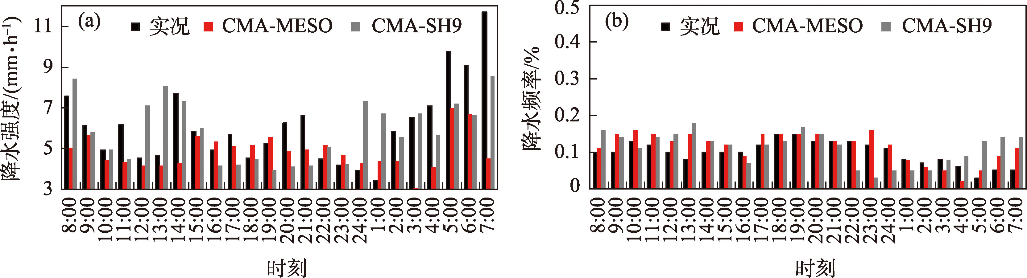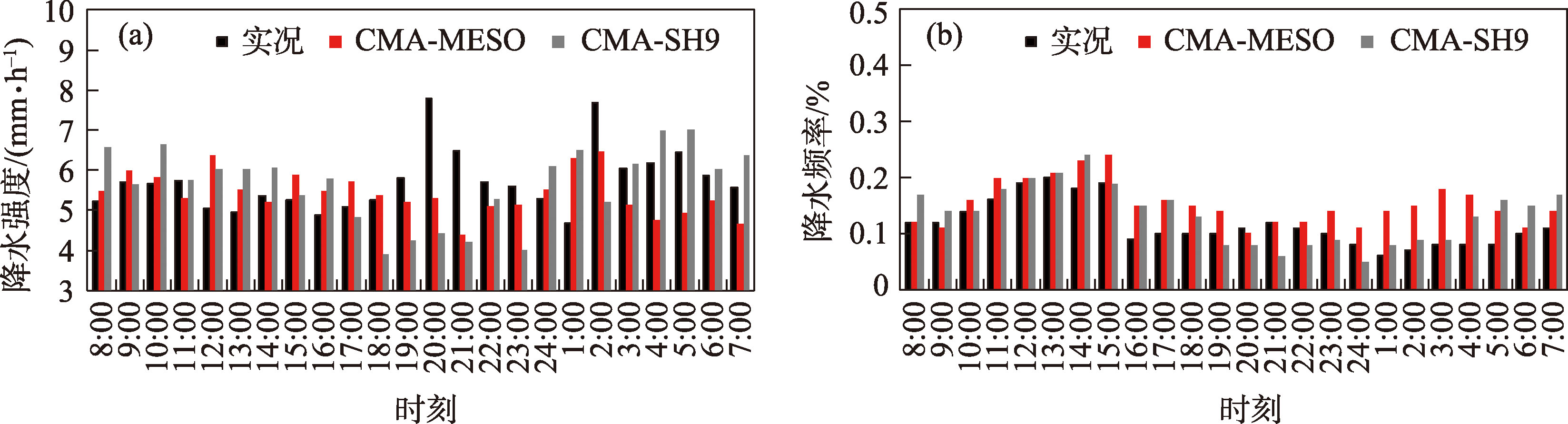 图8 陇南CMA-MESO、CMA-SH9预报≥2.5 mm·h-1降水强度和降水频率对比Fig. 8 Averaged diurnal cycles of rainfall intensity and frequency from rainfall ≥2.5 mm·h-1 predicted by CMA-MESO and CMA-SH9 in the Longnan |