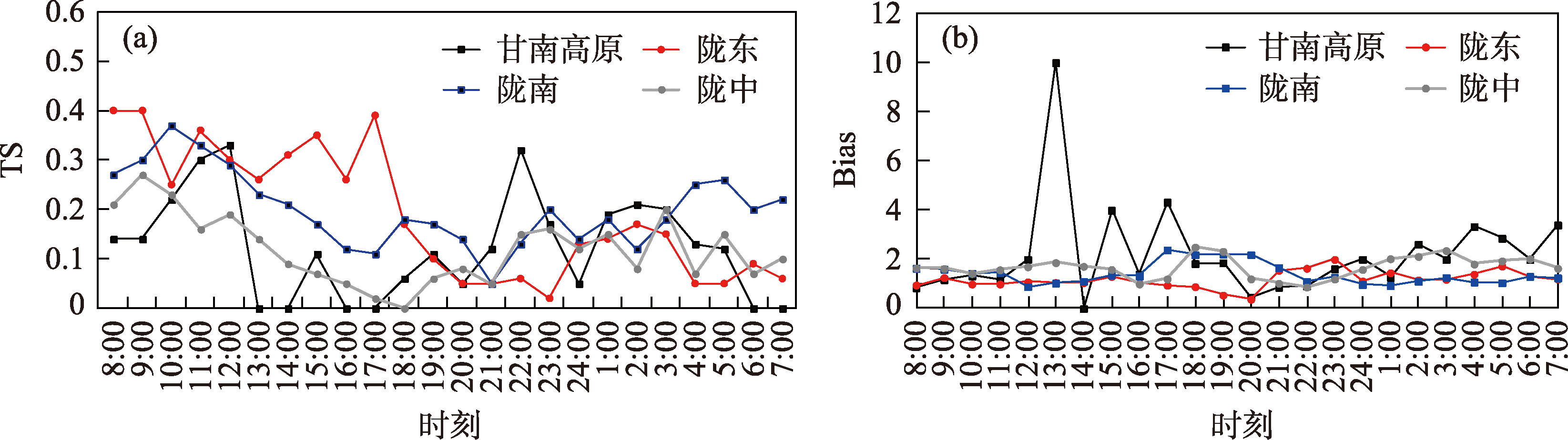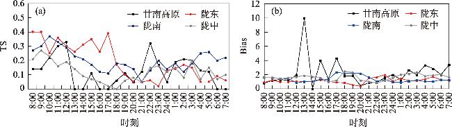 图5 CMA-MESO预报≥2.5 mm·h-1降水的TS评分及Bias日变化Fig. 5 Diurnal variations of TS score and Bias for the ≥2.5 mm·h-1 rainfall predicted by CMA-MESO |