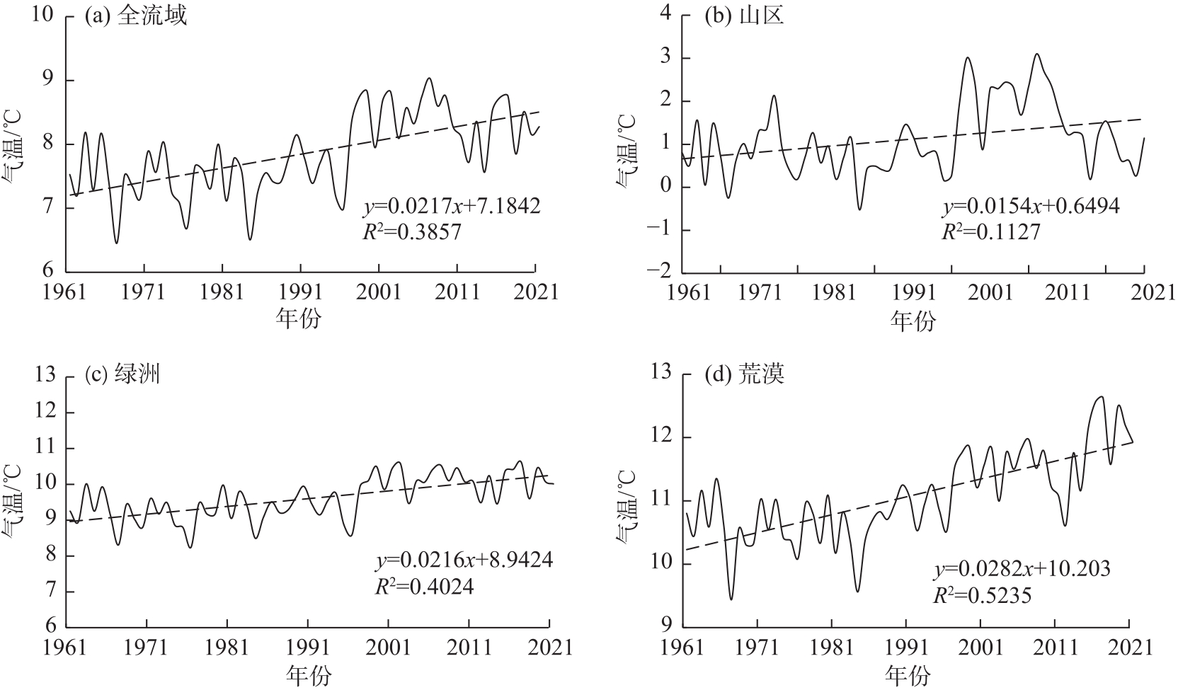 图2 1961—2021年新疆开都-孔雀河流域及其分区温度变化趋势Fig. 2 Temperature variation trend of Kaidu-Kongque River Basin and its subregions in Xinjiang from 1961 to 2021 |