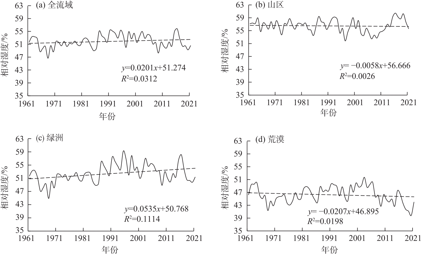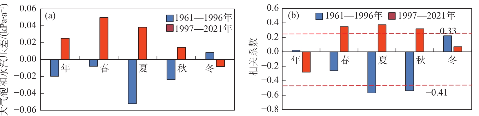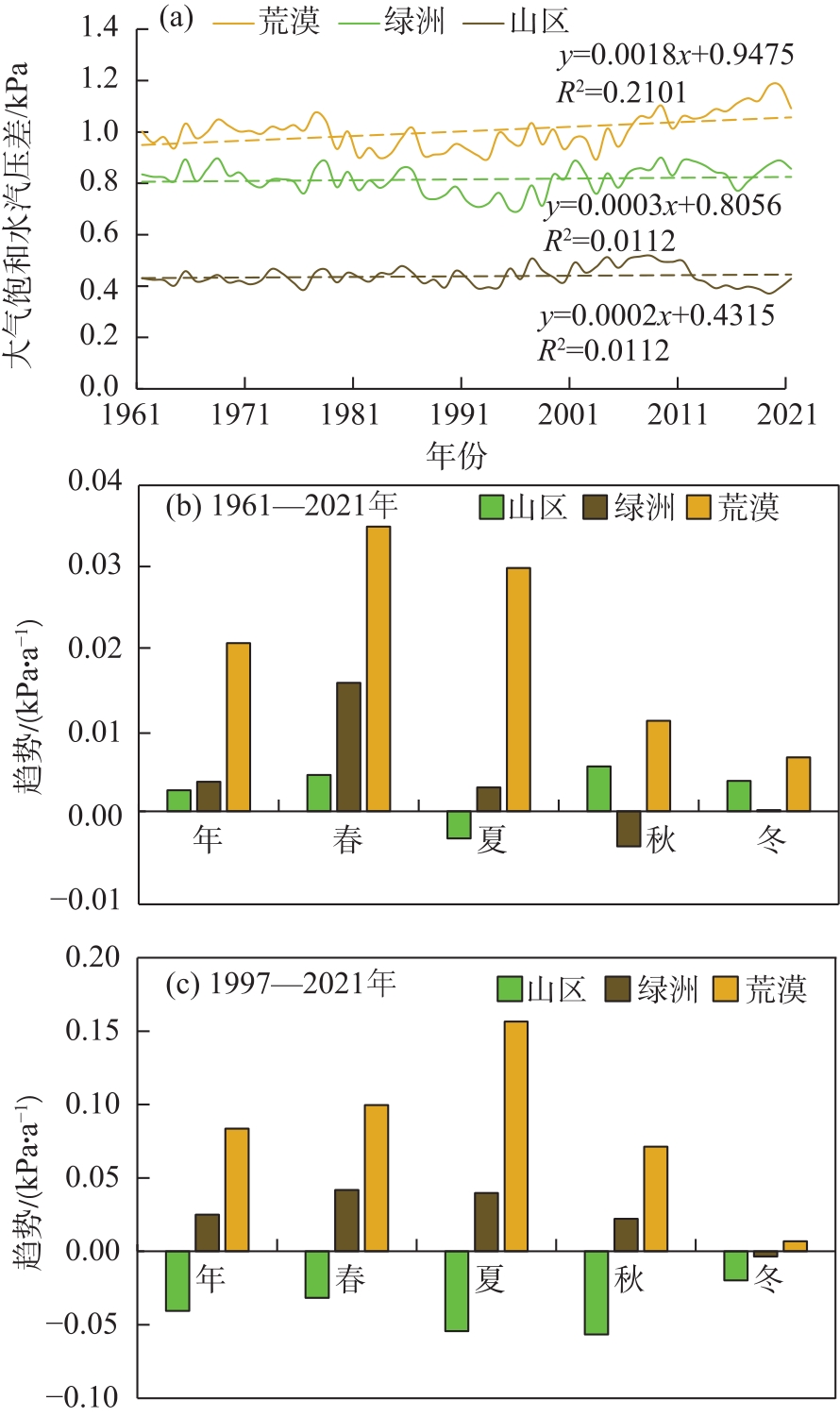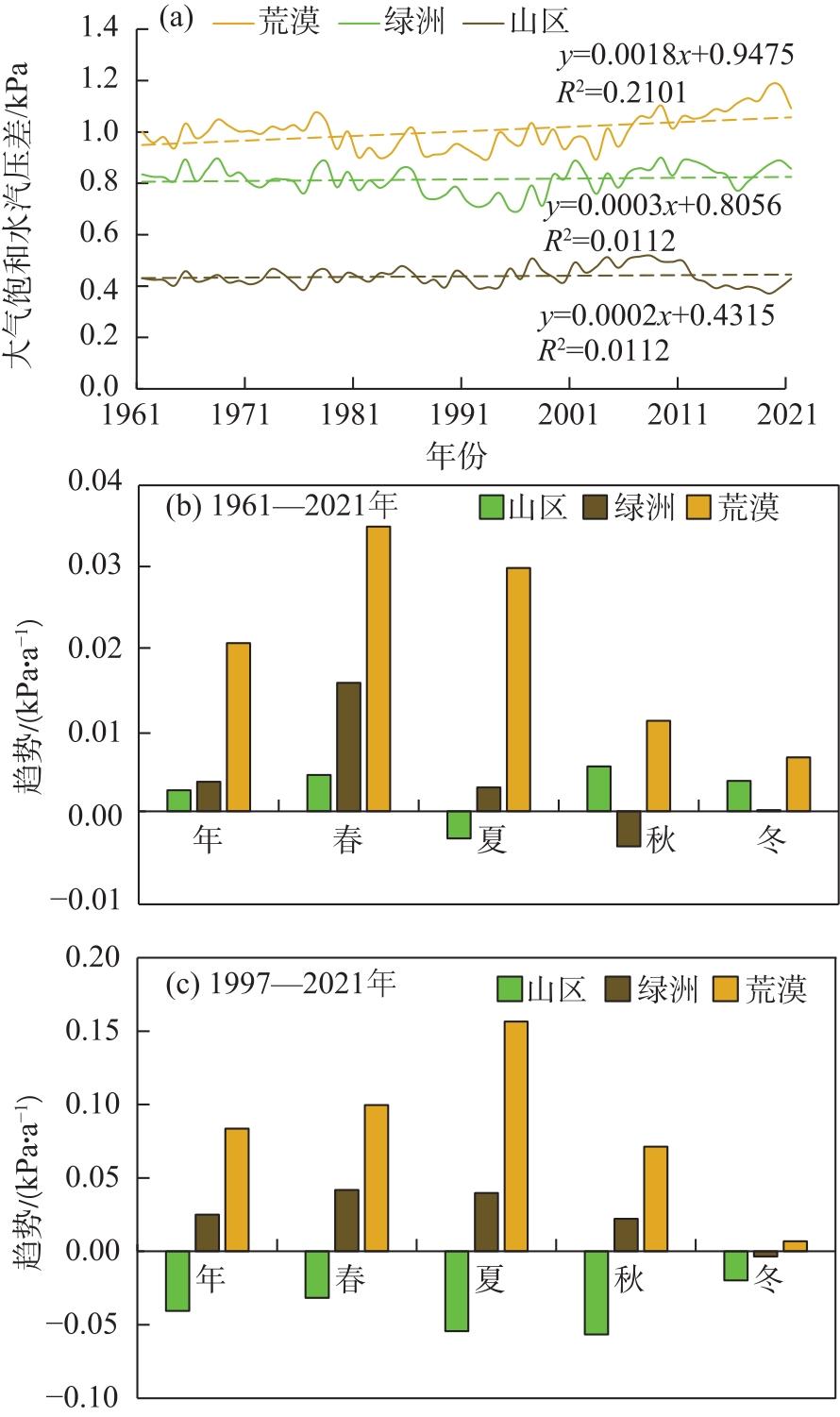 基于1961—2021年新疆开都-孔雀河流域逐月气温和相对湿度观测数据,分析开都-孔雀河流域大气饱和水汽压差、饱和水汽压及实际水汽压的变化趋势,探讨山地、绿洲、荒漠环境下大气饱和水汽压差变化特征,揭示了大气饱和水汽压差变化的影响因子。结果表明:(1) 1961—2021年开都-孔雀河流域年及四季大气饱和水汽压差总体呈上升趋势,并呈阶段性变化特征,其中1997年发生突变,从1961—1996年的下降趋势突变为1997—2021年的上升趋势,揭示了1997年以后大气干旱加剧,尤其在春季。(2) 不同环境下大气饱和水汽压差变化趋势与气温和实际水汽压的变化趋势一致,其中荒漠环境下大气饱和水汽压差增长速率最大,其次是绿洲和山地环境。(3) 大气饱和水汽压差与温度变化呈正相关,而与相对湿度变化呈负相关;1997年以来气温快速升高而相对湿度迅速降低是导致大气饱和水汽压差加速上升的主要原因;此外,实际水汽压的增长速率小于饱和水汽压的增长速率。研究成果有助于深入理解大气干旱过程及对气候变化的响应关系。