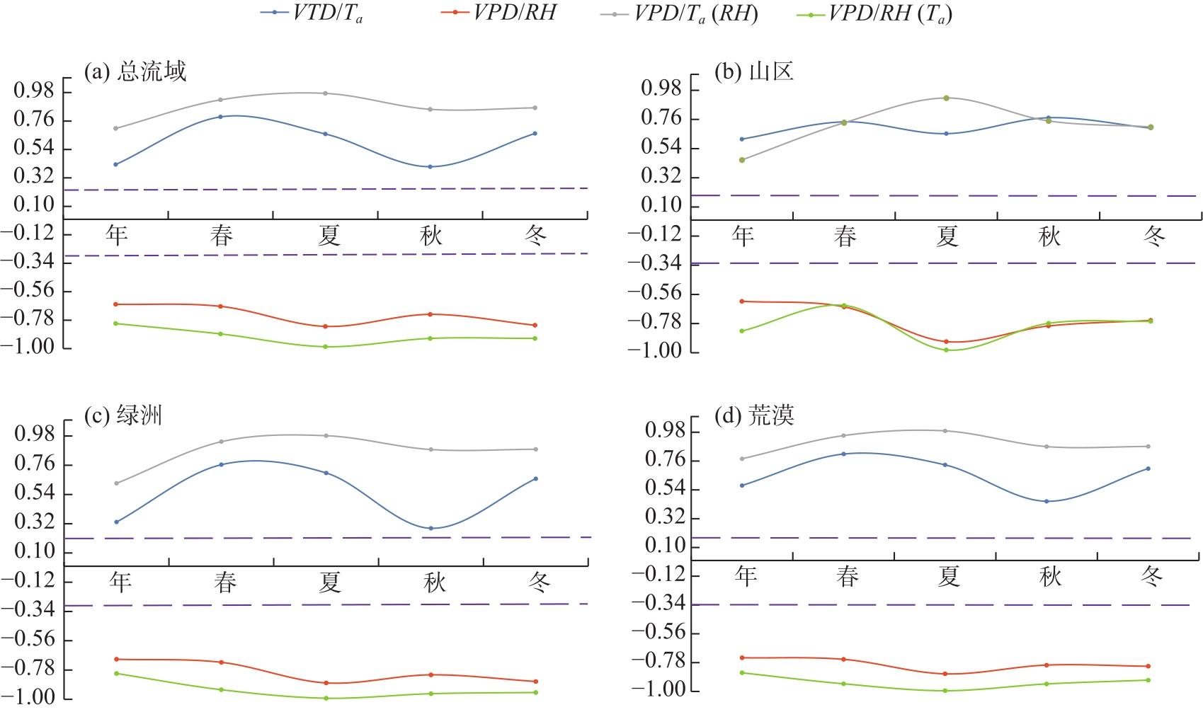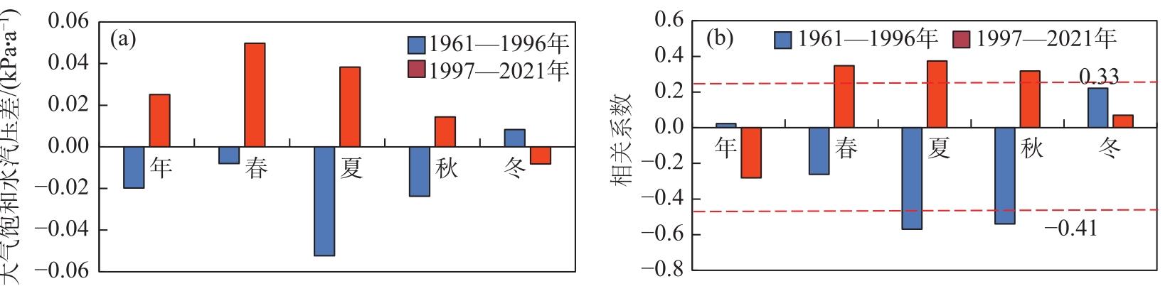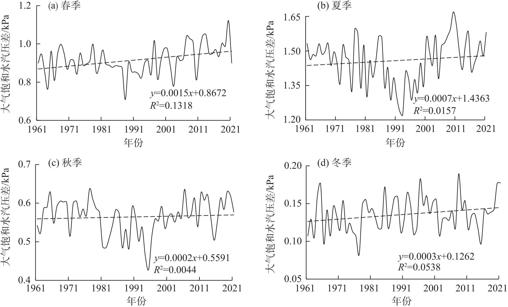 图5 1961—2021年新疆开都-孔雀河流域四季大气饱和水汽压差变化趋势Fig. 5 Variation trend of VPD in four seasons in Kaidu-Kongque River Basin, Xinjiang from 1961 to 2021 |