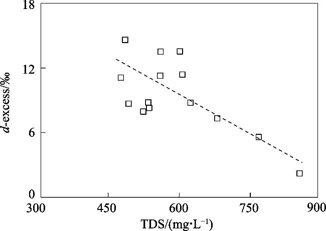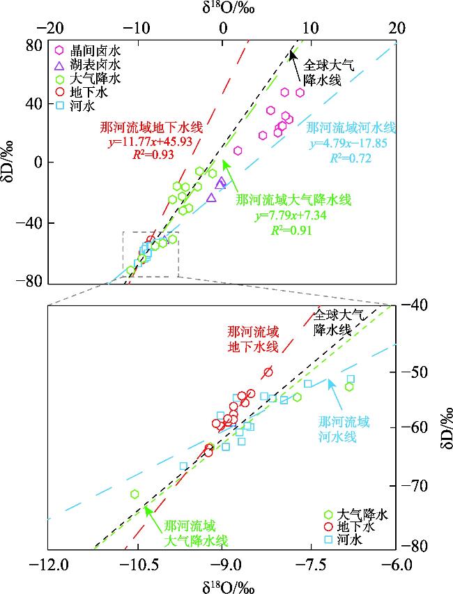 本文基于那棱格勒河流域63组样品测试结果,分析流域内大气降水、河水、地下水、湖表卤水和晶间卤水的氢氧同位素和氘盈余参数分布特征及主控因素,结果表明:(1) 受到蒸发和水汽再循环的双重影响,研究区大气降水δD、δ18O均大于我国平均值,且研究区大气降水线斜率小于全球大气降水线但大于西北干旱区其他流域大气降水线,东亚季风远距离输送是导致研究区8月大气降水氘盈余偏低的主要因素。(2) 研究区河水线斜率小于全球大气降水线,河水氘盈余与δ18O、TDS呈负相关关系,均为河水经历强蒸发作用导致同位素分馏所致,研究区南部山区降雨是河水主要补给来源,高程效应导致不同区段河水δD、δ18O产生差异。(3) 不同区段地下水与地表水补给、排泄关系存在差异,加之地下水主要接受山区多源补给,导致地下水线斜率、截距均大于全球大气降水线和当地大气降水线。(4) 湖表卤水和晶间卤水均出现“氧漂移”现象,且二者氘盈余参数均小于0,这与蒸发导致氢氧同位素过度分馏密切相关,盐类矿物溶滤作用是致使晶间卤水氘盈余值小于湖表卤水的主要原因。