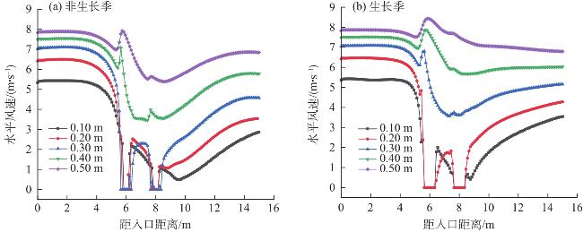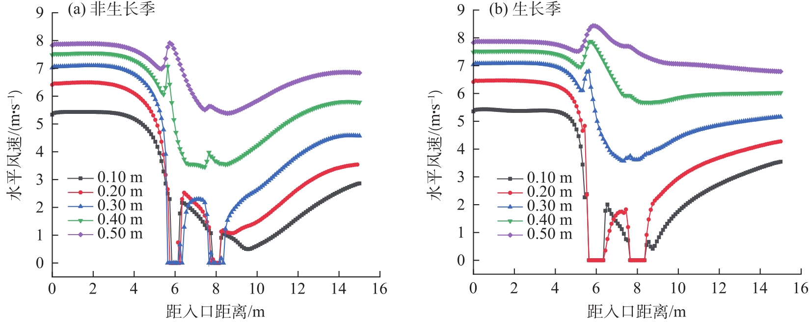 植物固沙是北方干旱、半干旱区防治风沙灾害的重要措施之一,其中琵琶柴(Reaumuria soongorica)为荒漠区分布最广泛的半灌木,具有重要的应用价值。本文利用计算平台Fluent对琵琶柴植株附近的流场进行数值模拟,分析风速特征和积沙特征。结果表明:(1) 在10 m·s-1初始风速下,植株前后皆会形成涡流,其高度和强度与距植株远近有关,整体低于0.25 m。(2) 数值模拟结果表明,气流水平方向速度的变化多呈“N”和“W”型曲线,而垂直方向的气流速度变化则为“V”型曲线。(3) 在较低风速下,非生长季琵琶柴的阻风效能要优于生长季,株后防护距离4 m;当风速大于6 m·s-1时,双排生长季琵琶柴株后风速降低幅度可大于94.45%。(4) 琵琶柴具有良好的阻沙效果,在初始风速为6 m·s-1时,大部分沙粒堆积在植株前后底部;当风速增至10 m·s-1时,生长季琵琶柴阻沙良好,沙粒主要沉积在株后1.5~3 H,沙粒堆积高度小于0.1 m;当初始风速为15 m·s-1时,生长季琵琶柴株后积沙主要分布在株后2~3.5 H,而非生长季琵琶柴沙粒堆积范围则在株后1~10 H。无论何种生长季琵琶柴均能有效降低风场内气流速度,并对气流所携带的沙粒具有良好的沉降作用,在植物治沙工程中起重要作用。
