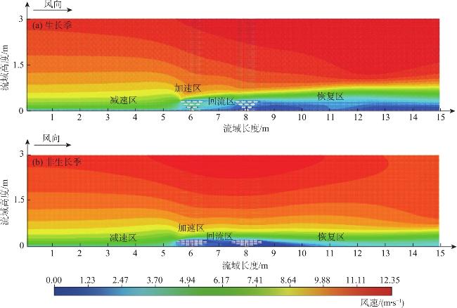 关键词: 防风阻沙; 琵琶柴; 风速变化; 积沙分布; Fluent数值模拟