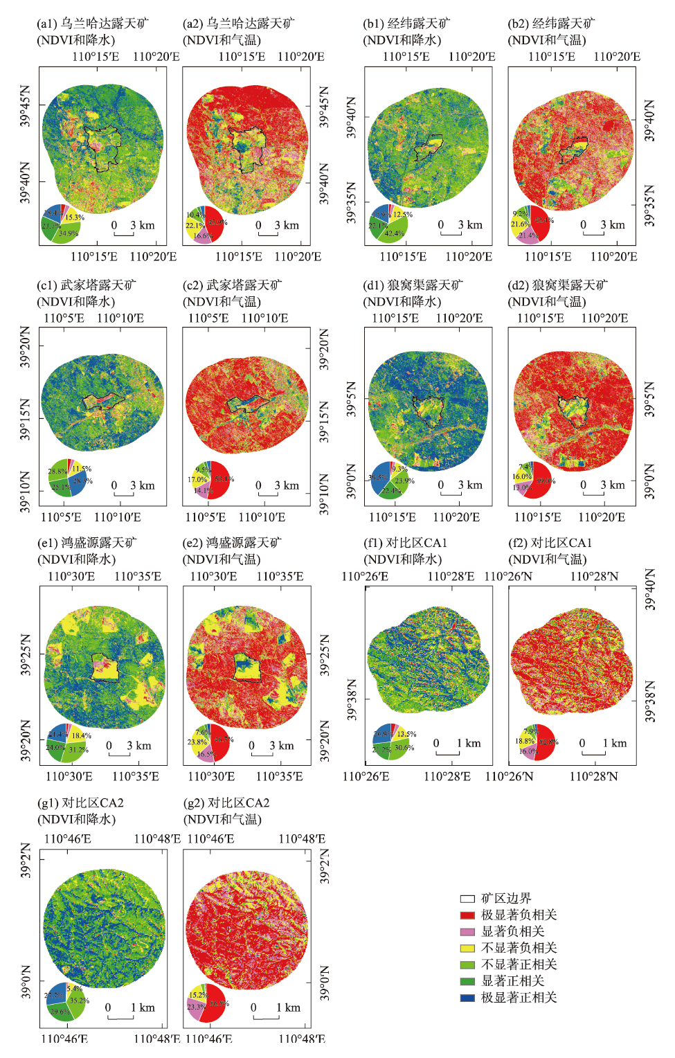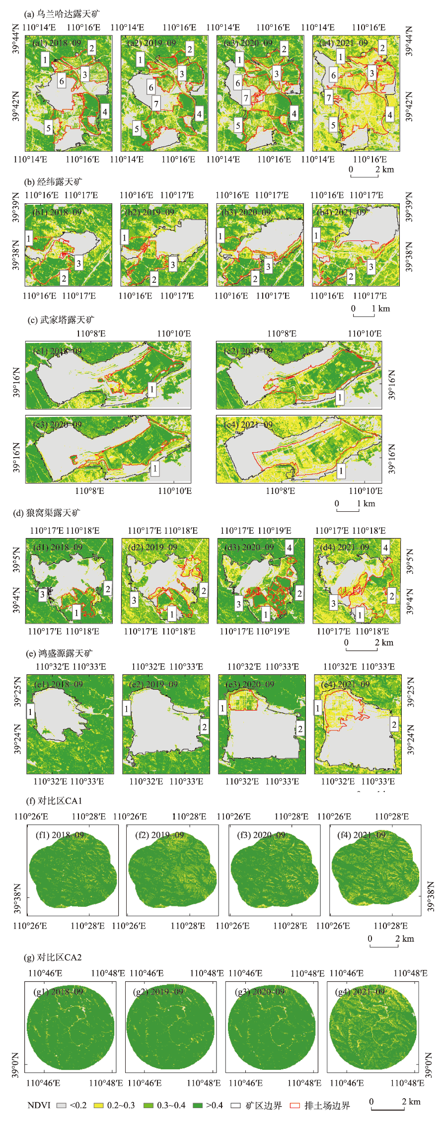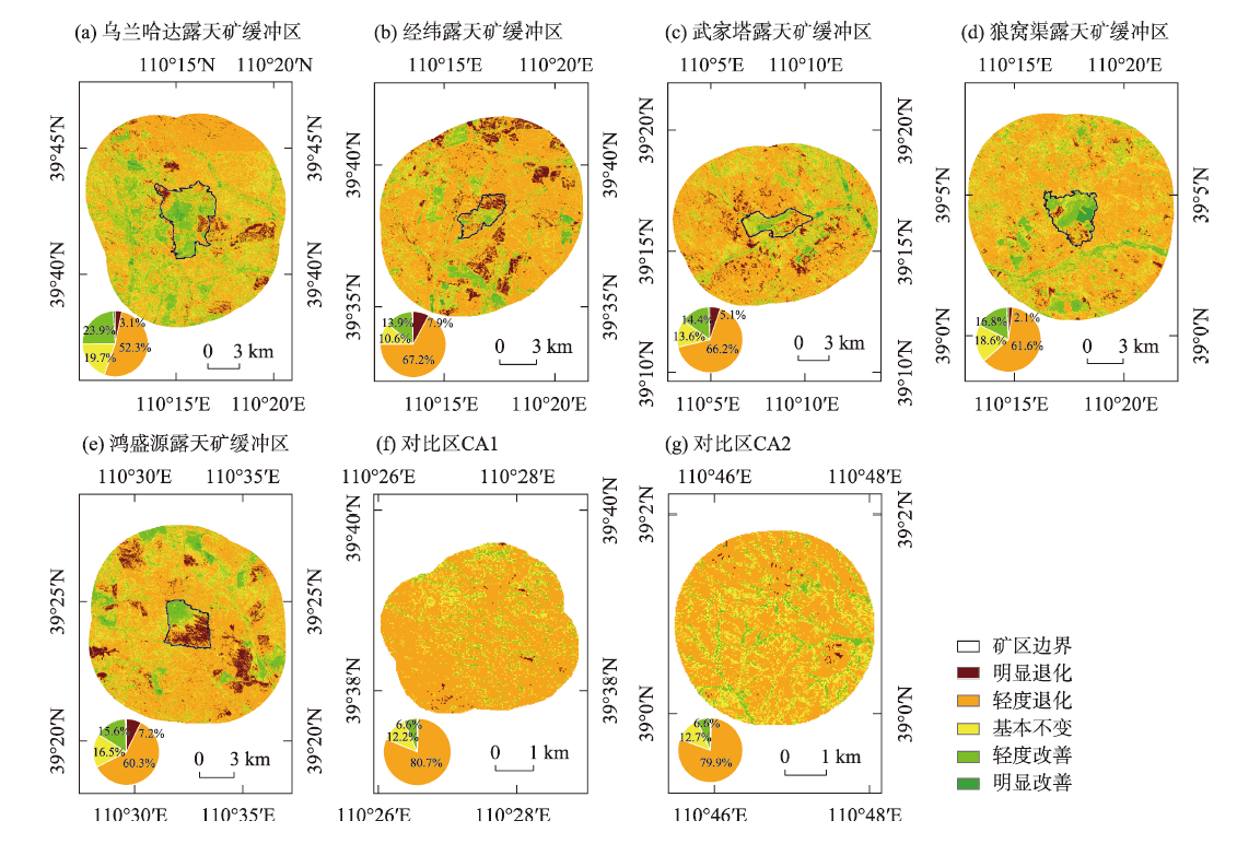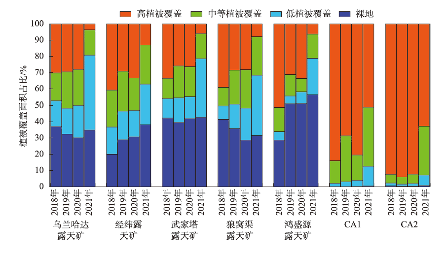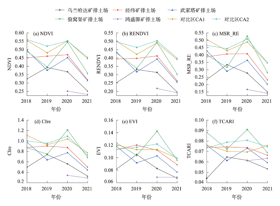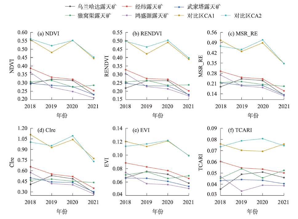 研究露天矿采矿坑与排土场的植被破坏及复垦状况,可为矿区植被损伤诊断、植被自然恢复和人工修复评估提供生态学依据。基于Sentinel-2数据计算非红边植被指数(NDVI、EVI)和红边植被指数(RENDVI、MSR_RE、CIre、TCARI)为生态修复评价指标;采用回归分析、趋势分析和相关性分析方法,分析2018—2021年采矿活动和气候变化对5个露天矿(乌兰哈达露天矿、经纬露天矿、武家塔露天矿、狼窝渠露天矿和鸿盛源露天矿)植被长势的影响,获取矿区采矿坑、排土场和缓冲区植被的时空变化规律。结果表明:(1) 鸿盛源露天矿采矿坑植被受损程度最严重(拟合斜率k=-0.2996),但其排土场人工修复效果最好(拟合斜率k=0.1364)。(2) 对比5个露天煤矿5 km缓冲区,发现逐像元RENDVI变化趋势均以退化为主,退化面积均占50%以上。(3) 在荒漠化草原地区,植被NDVI变化受降水的影响小于气温。露天开采会加剧荒漠化草原植被的退化,排土场的人工修复对改善区域植被生长状况成效显著。